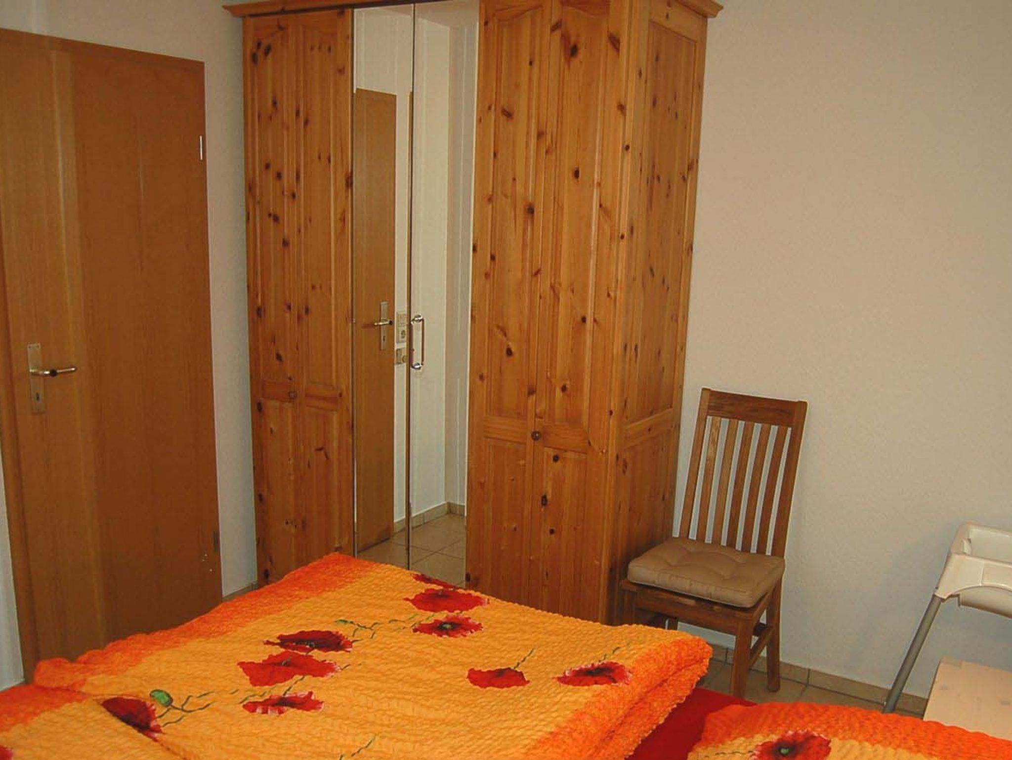 Schlafzimmer 1: 2 Nachttische, Doppelbett 2,00 x 1,80 m, E-Heizung, Kinderhochstuhl, Kleiderschrank, Radiowecker, Spiegel, Stuhl