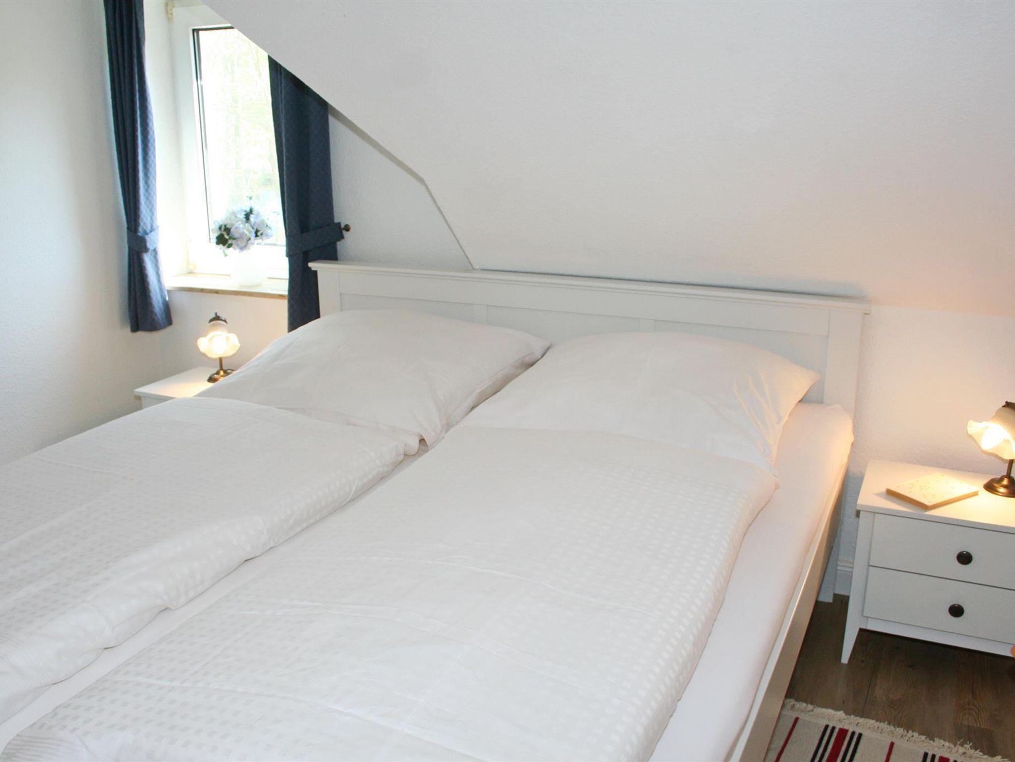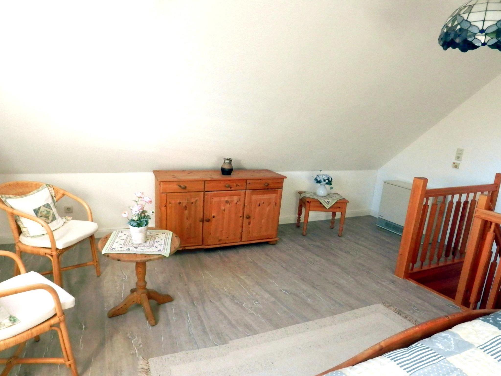 Schlafzimmer 2: Doppelbett, 2 Nachttische, Schrank, Anrichte, Garderobenständer, Beistelltisch, Nachtspeicherofen, 2 Korbstühle, Couchtisch, Spiegel