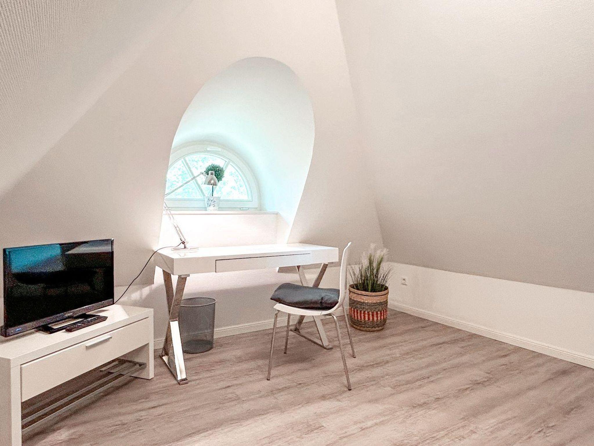 Eine massive Holztreppe führt in das Obergeschoss, wo Ihnen zwei Schlafzimmer mit jeweils einem Doppelbett (1,80 x 2,00) ungestörte Entspannung bieten. Ein großzügiges Vollbad ergänzt diese Etage. Im Dachgeschoss erwartet Sie ein Arbeitszimmer mit einem Schreibtisch, einem bequemen Stuhl, einem hochwertigen TV und einem ausziehbaren Schlafsessel (0,90 x 2,00).