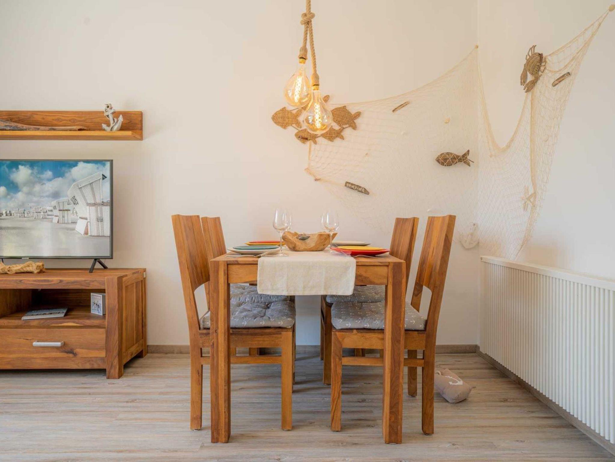Wohnzimmer mit ausklappbarem (Schlaf-) Sofa (130x190cm), zwei Sesseln, SMART-TV (Sat) mit BlueRay-Player und Esstisch mit 4 Stühlen. Direkter Zugang zur möblierten, windgeschützten Gartenterrasse nach Südosten.