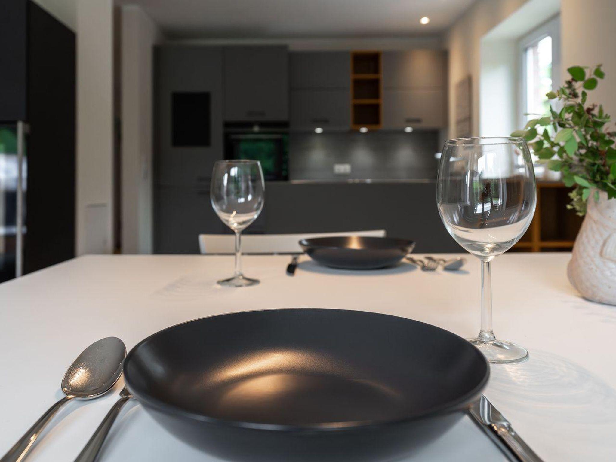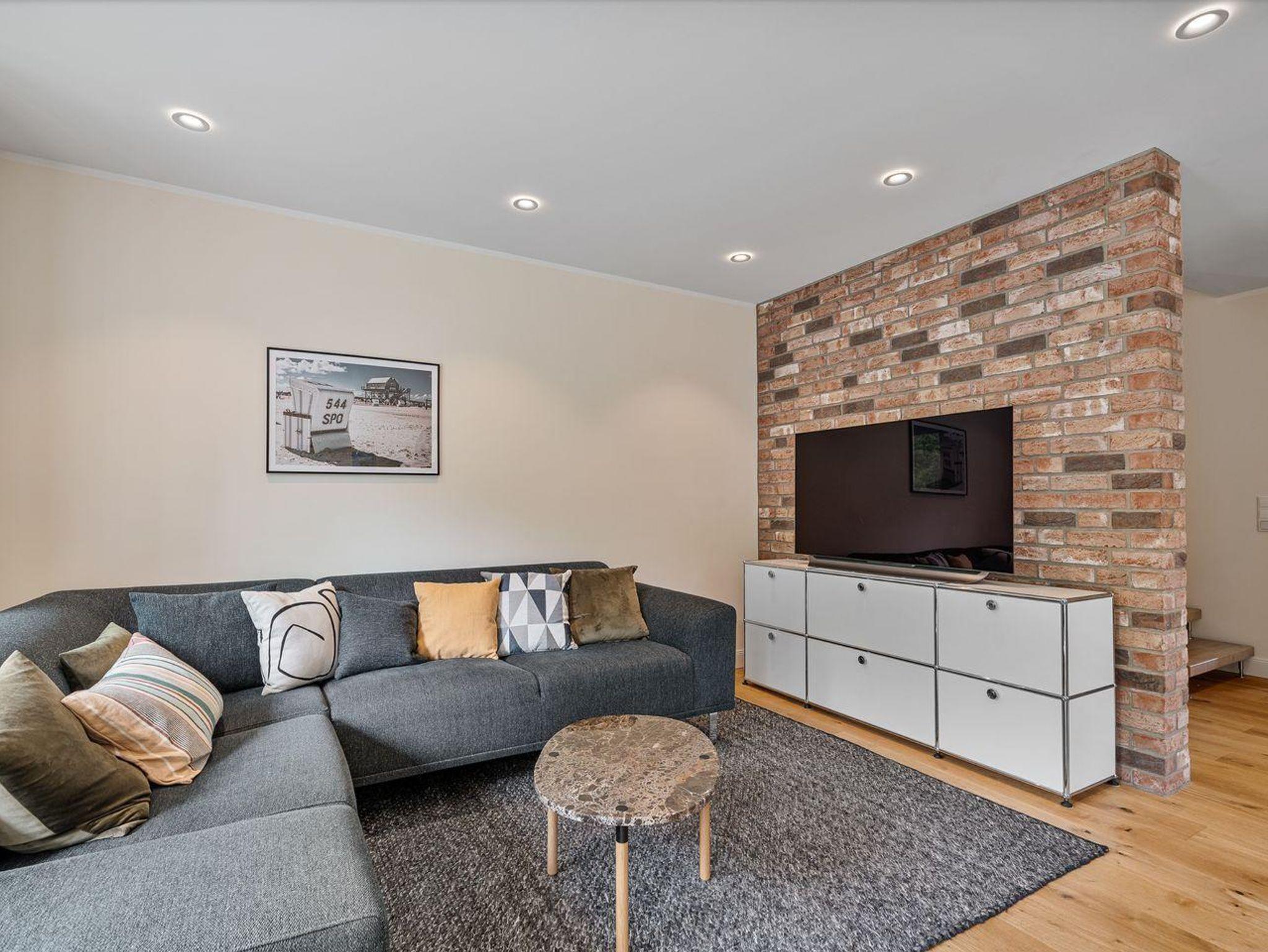 Im Erdgeschoss erwartet Sie ein lichtdurchflutetes Wohnzimmer mit einem Ecksofa, einer offenen Küche sowie einem Essbereich.