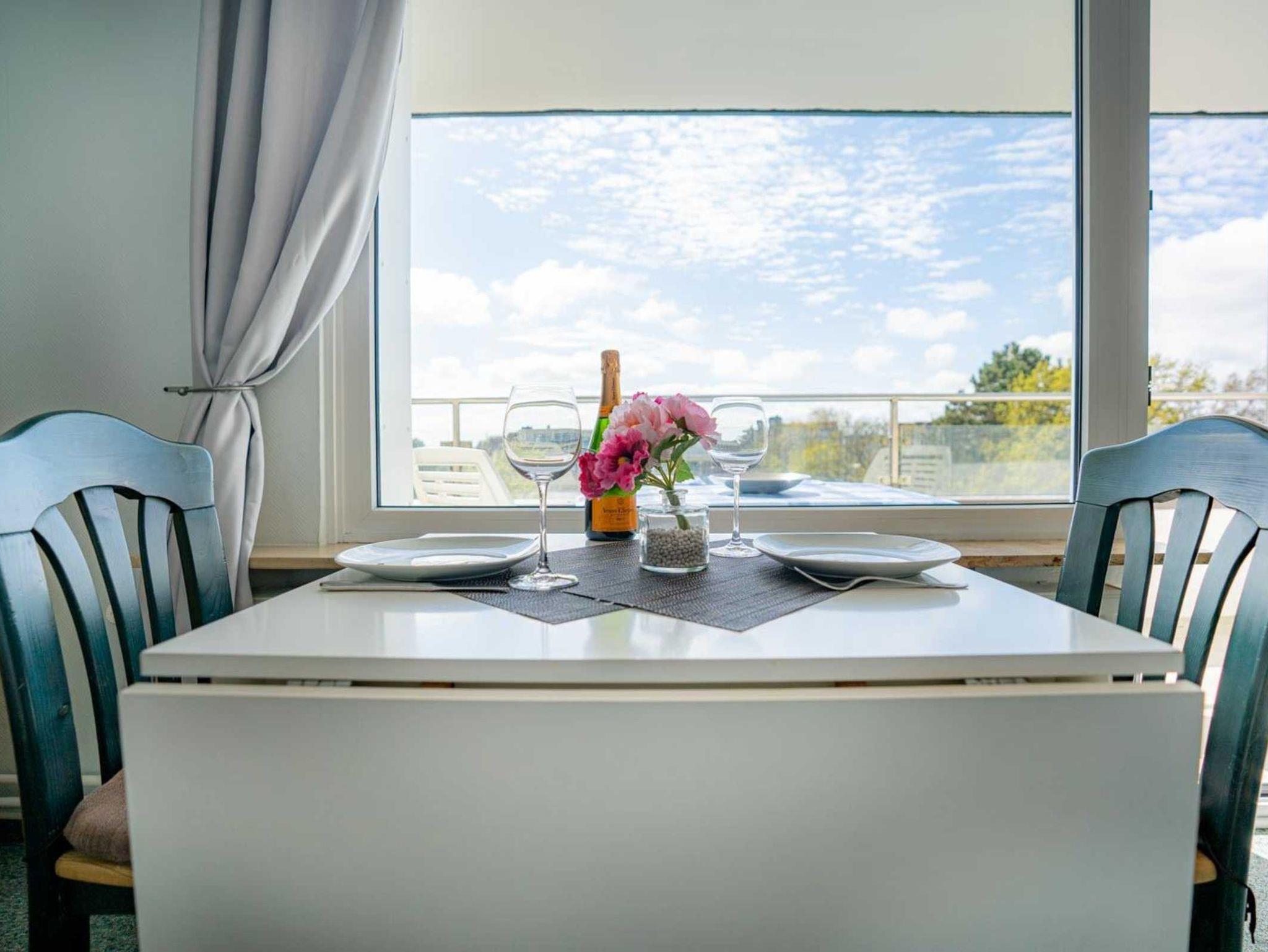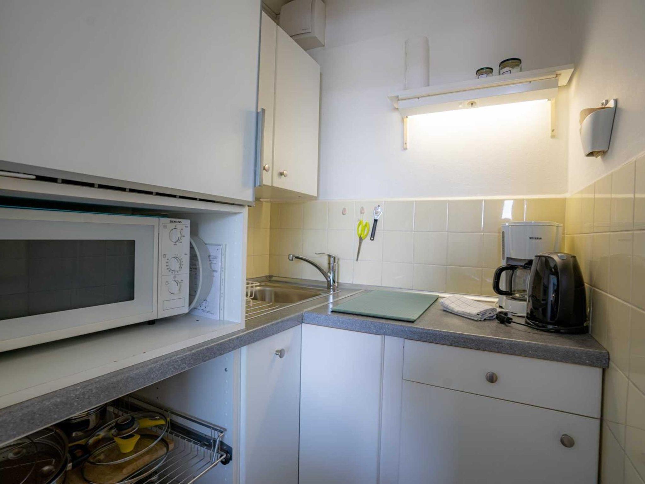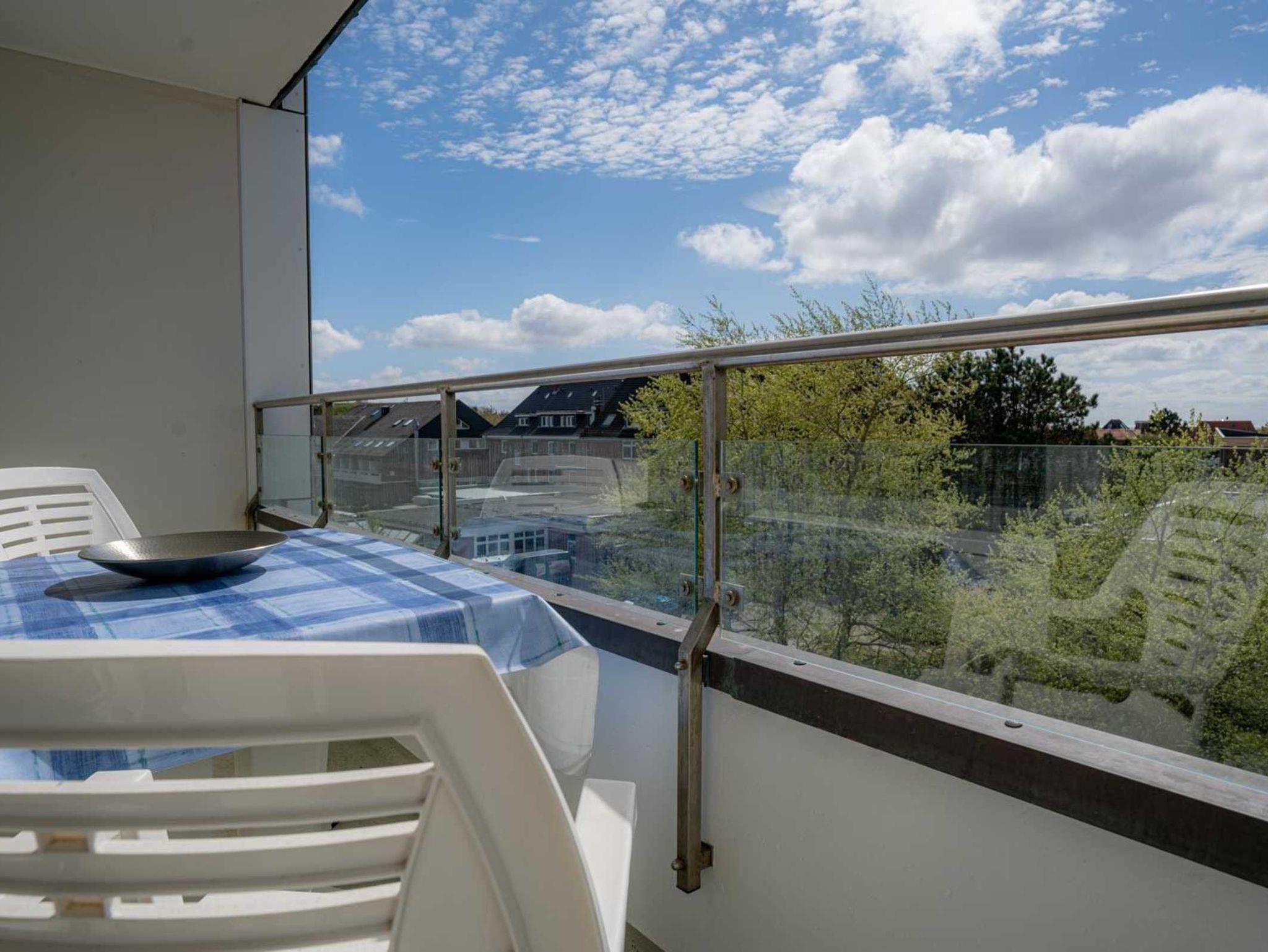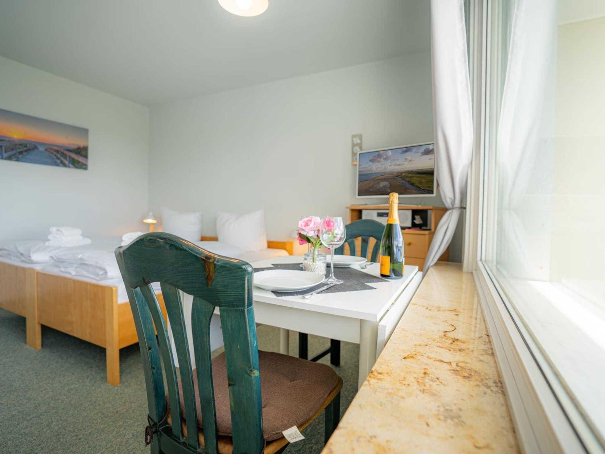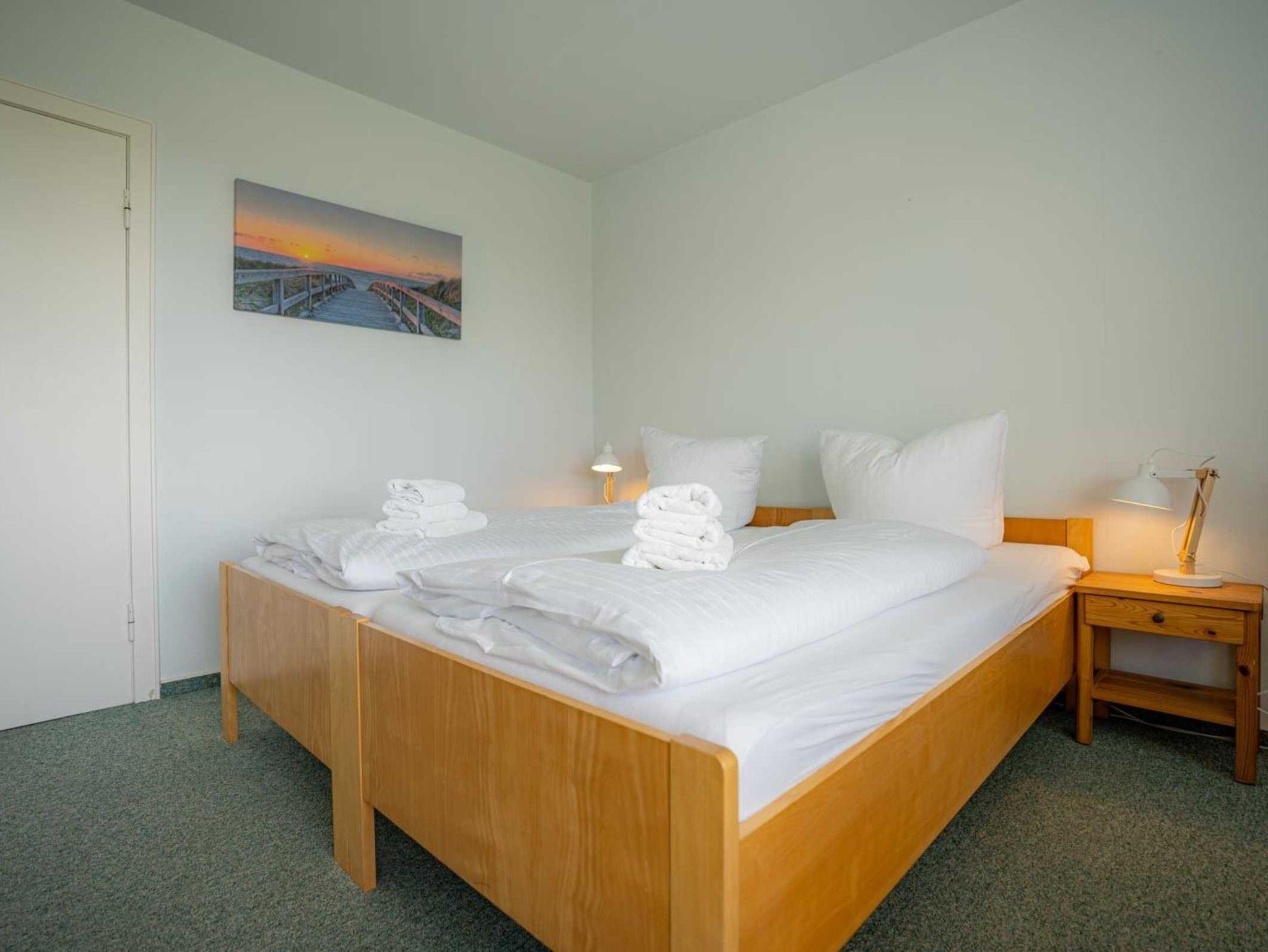Wohn- und Schlafzimmer mit 2 hochwertigen Einzelbetten (je 90x200cm), Sofa (für 2 Personen), Sessel, Esstisch mit 3 Stühlen, TV (Kabel) und Radio mit CD. In einem Schrank steht Ihnen eine kleine Sammlung von Gesellschaftsspielen und Büchern zur Verfügung. Direkter Zugang zum möblierten, windgeschützten Balkon nach Südwesten, von dem aus Sie einen herrlichen Ausblick auf das Kurzentrum und sogar einen Mini-Meerblick (klitzekleinen Streifen vom Meer) haben.