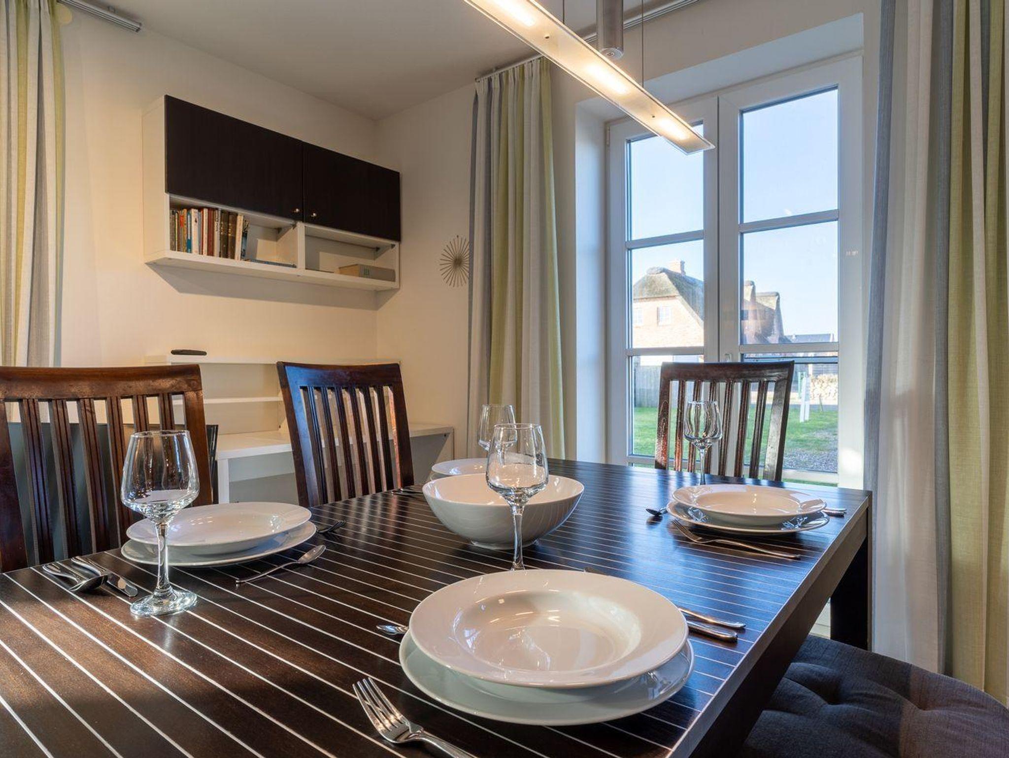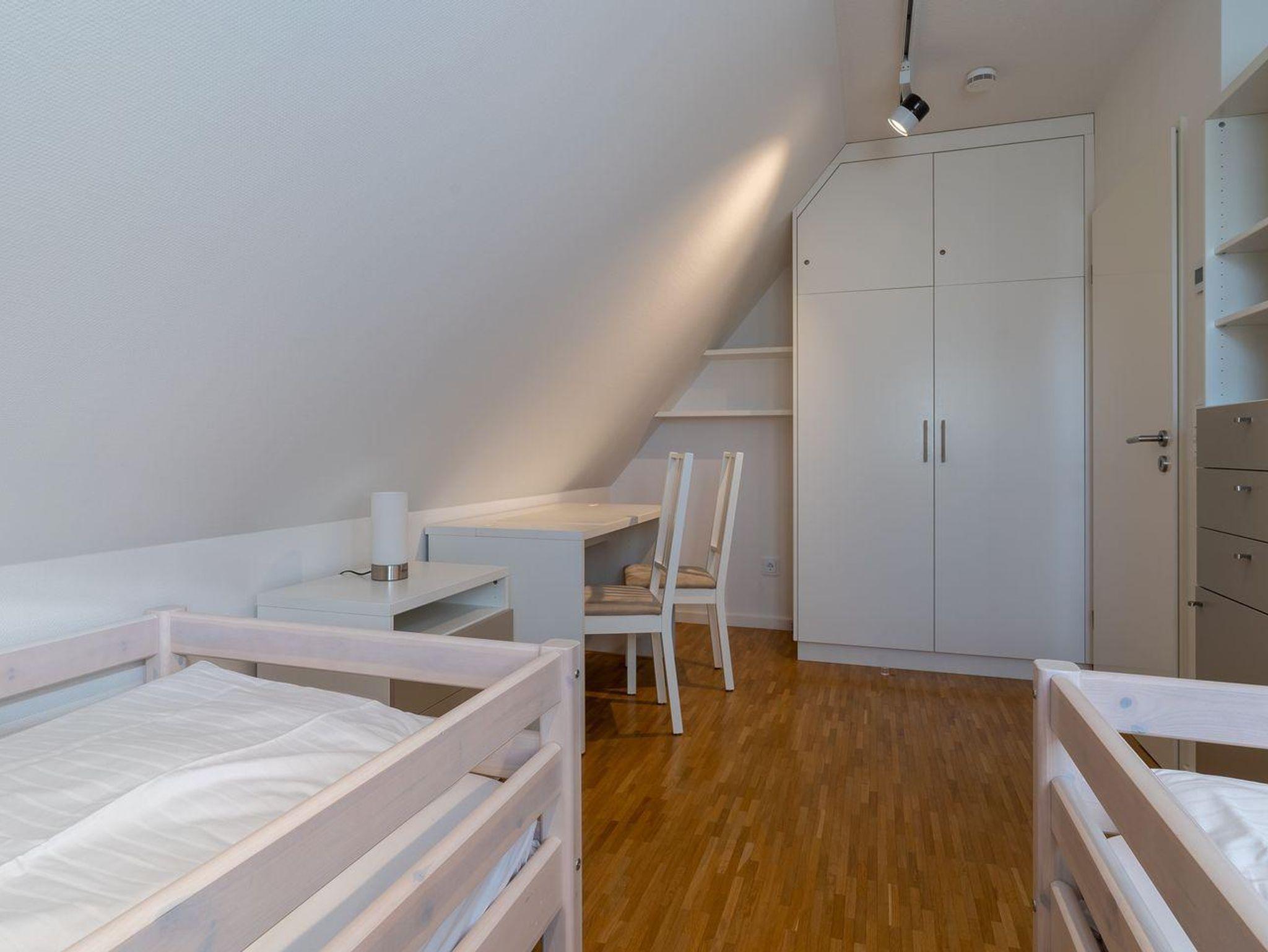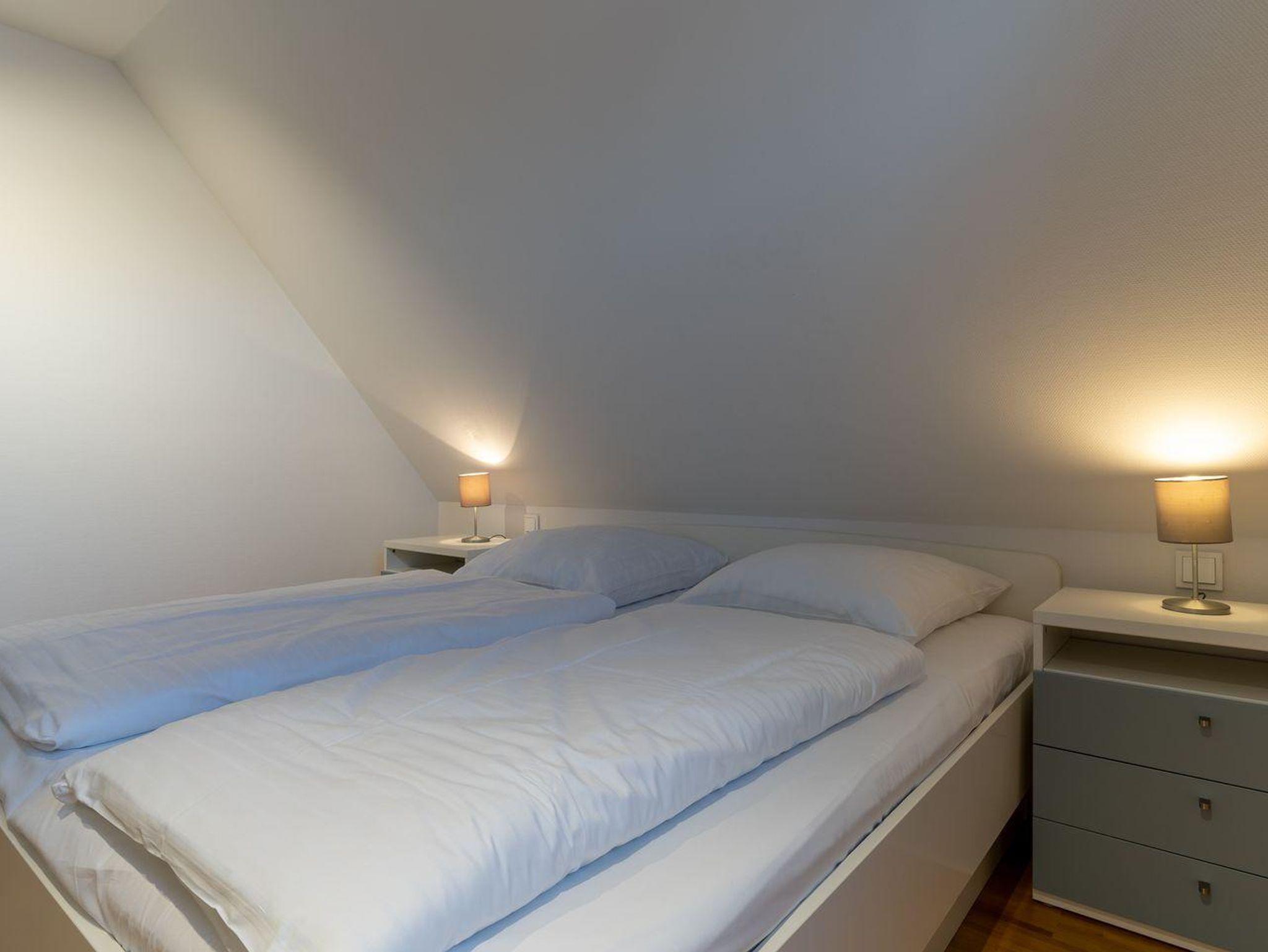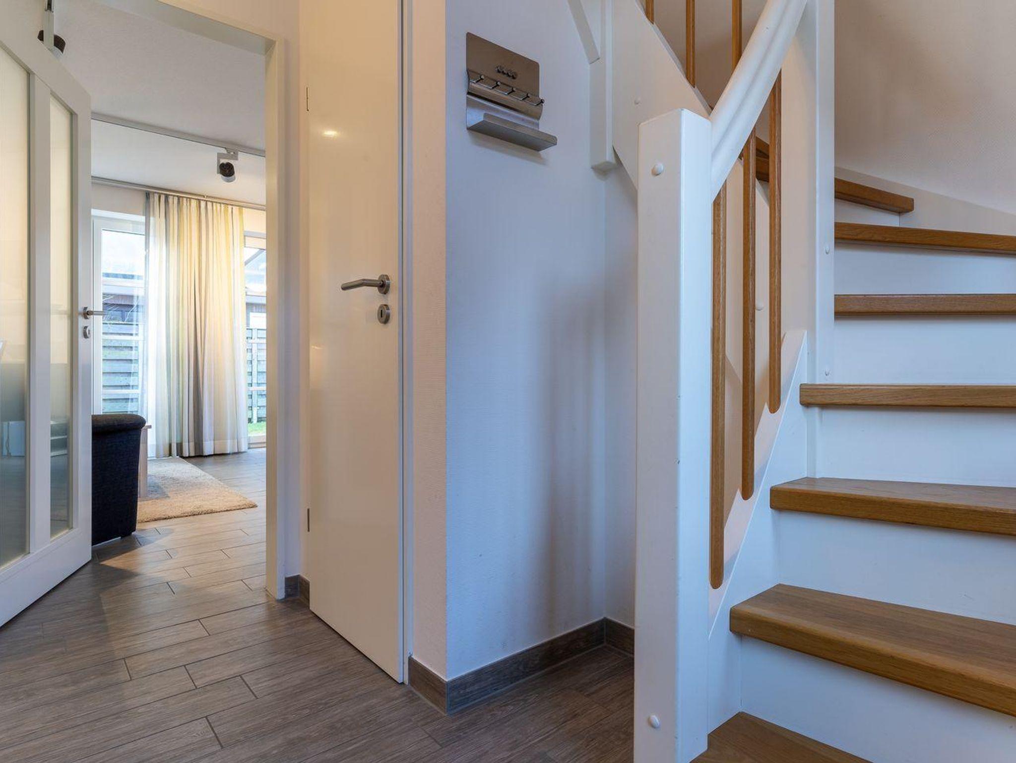 Im Erdgeschoss des Hauses befindet sich das geräumige Wohn-Esszimmer mit integrierter gut ausgestatteter Küche, einem Essbereich mit 6 Sitzplätzen und einer gemütlichen Sofaecke. Außerdem ein Schlafzimmer mit Doppelbett, ein Duschbad mit WC und einen Wirtschaftsraum mit Waschmaschine. Vom Wohnzimmer gelangen Sie auf die schöne Terrasse mit Terrassenmöbeln. Im Obergeschoss finden Sie ein Schlafzimmer mit einem Doppelbett und TV, sowie ein Schlafzimmer mit zwei Einzelbetten mit Fallschutz und ein Vollbad mit Badewanne/Dusche und WC. Das Haus wird mit Fußbodenheizung im EG und Zentralheizung im OG beheizt. Zusätzlich hat dieses Haus ein zentrales Lüftungssystem. Das Haus hat einen Fahrradabstellraum und einen PKW-Stellplatz.