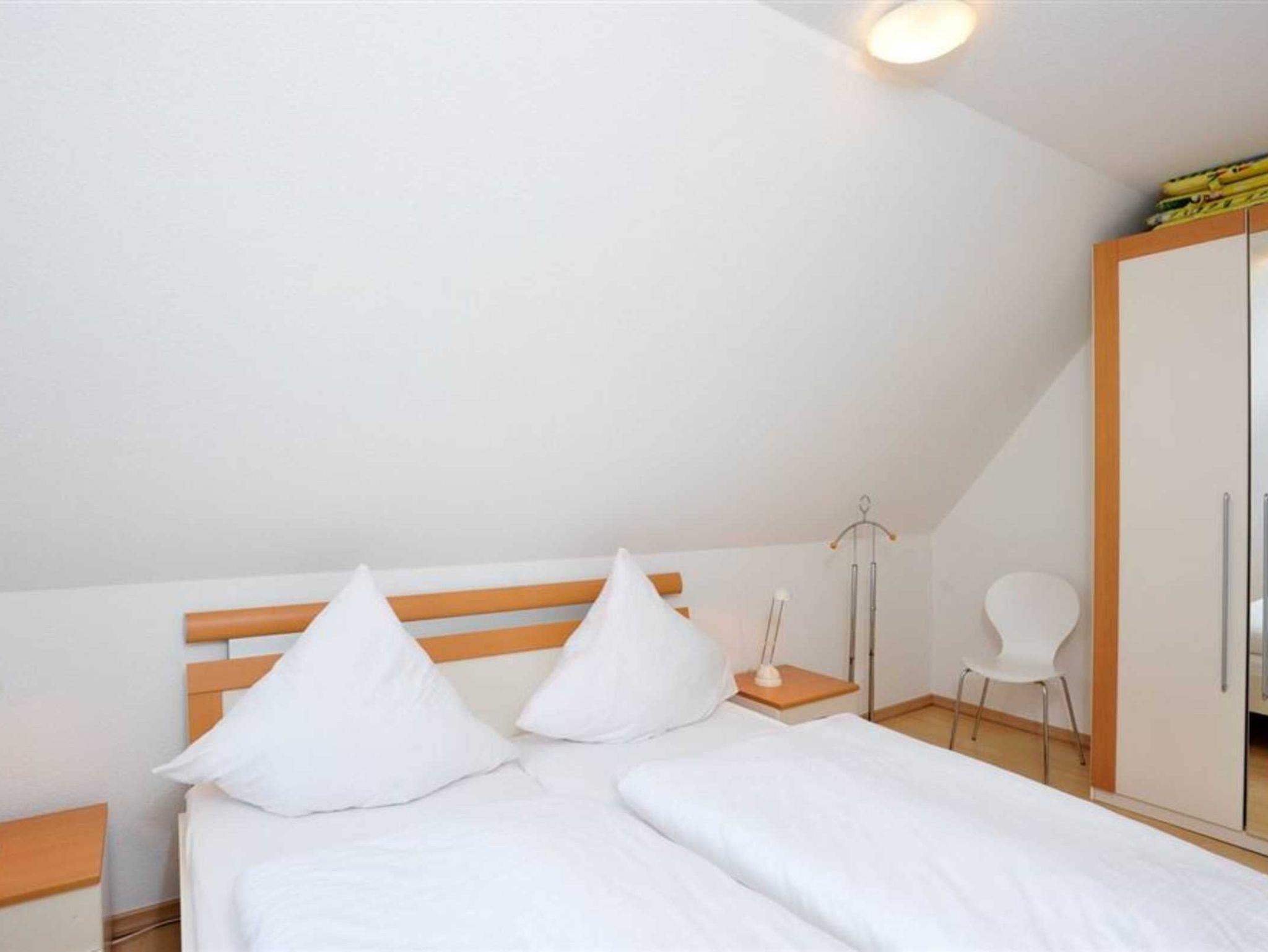 1. Schlafzimmer mit Doppelbett (2x 90x200cm), Stuhl, Kleiderschrank und Garderobe.