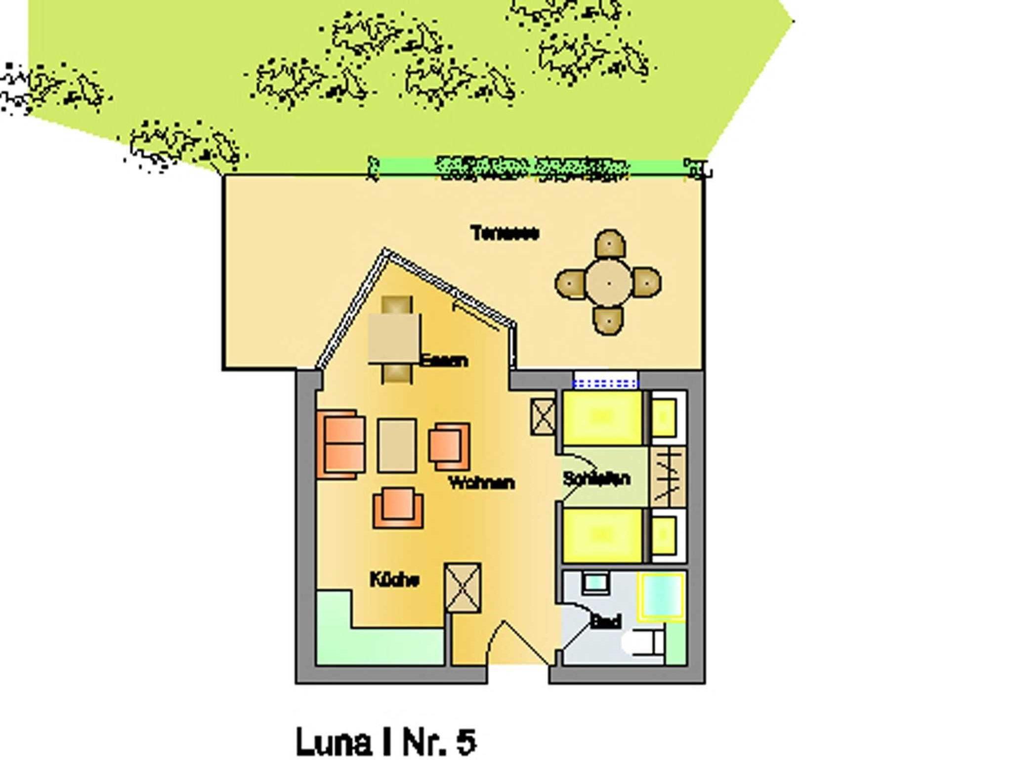 Die Wohnung 5, im Haus Luna I, liegt im Erdgeschoß und ist für 1 - 2 Personen ein herrliches Urlaubsquartier. Im Eingangsbereich finden Sie eine Garderobe und 1 Duschbad mit WC und Waschbecken. Der gemütliche Wohn-Essbereich verfügt über eine offene, umfangreich ausgestattete Küche, in der auch das Kochen im Urlaub Spaß macht. Der Essbereich befindet sich im hellen, vorgelagerten Wintergarten, wo Sie einen direkter Zugang zur Terrasse mit Strandkorb und Gartenmöbeln haben. Hier lässt es sich wunderbar in guter Nordseeluft entspannen. Erholsamen Schlaf bekommen Sie im Schlafzimmer mit 2 Einzelbetten (90x200cm).