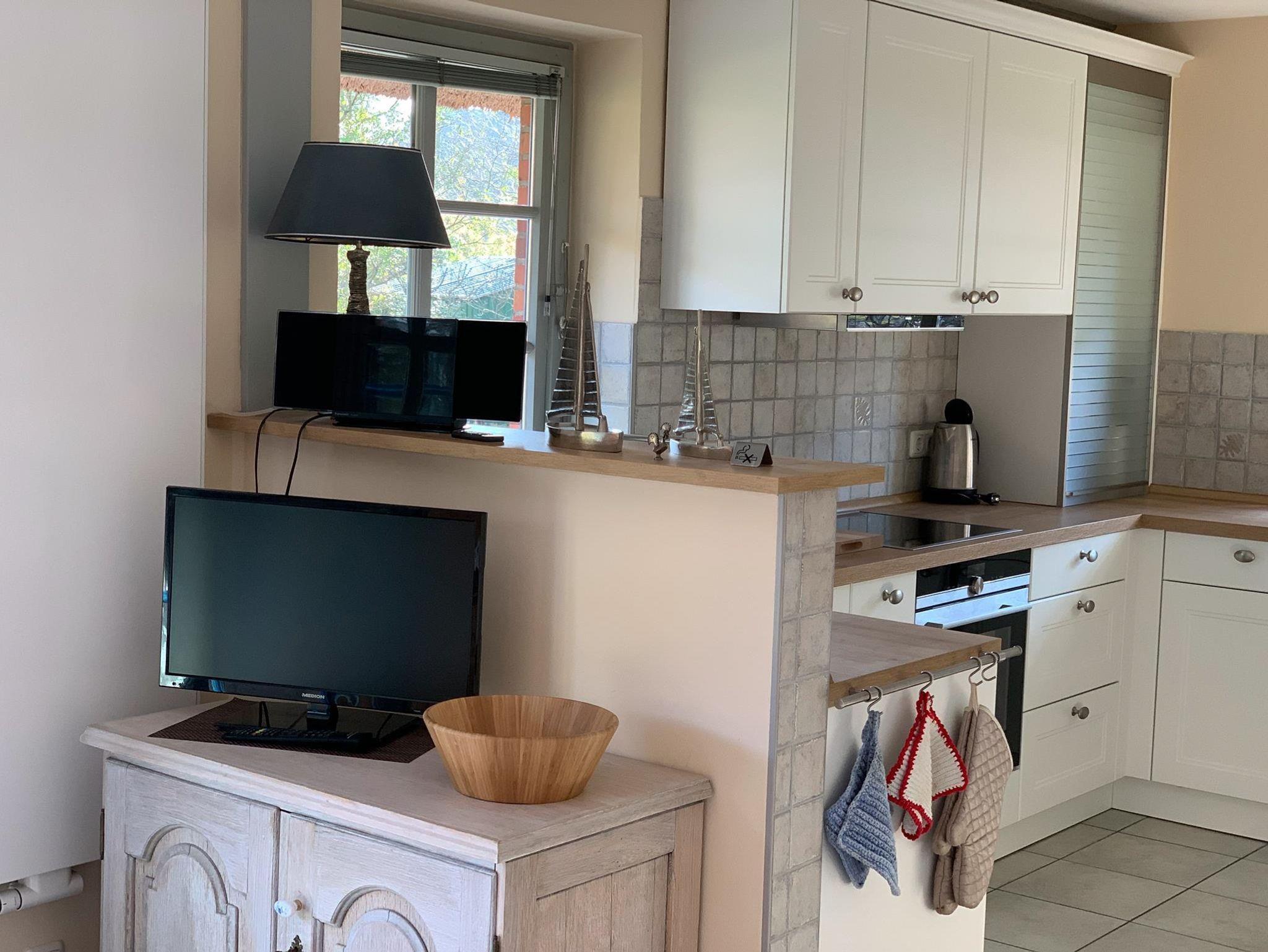 KücheEinbauküche, 4 Plattenherd mit Ceranfeld und Backofen, Dunstabzugshaube, Kühlschrank, Spülmaschine, Mikrowelle, Kaffeemaschine, Wasserkocher, Toaster, Handmixer, Stabmixer, Geschirr, Kochtöpfe, Esstisch, Eckbank, 2 Korbstühle, Rollwagen, Vertico, Anrichte, Kabel-TV, Flachbildschirm