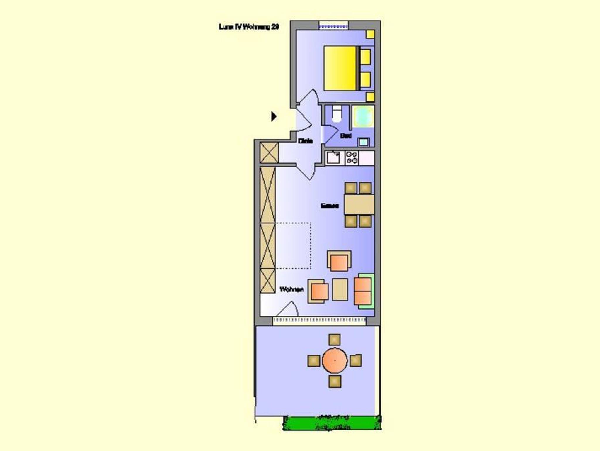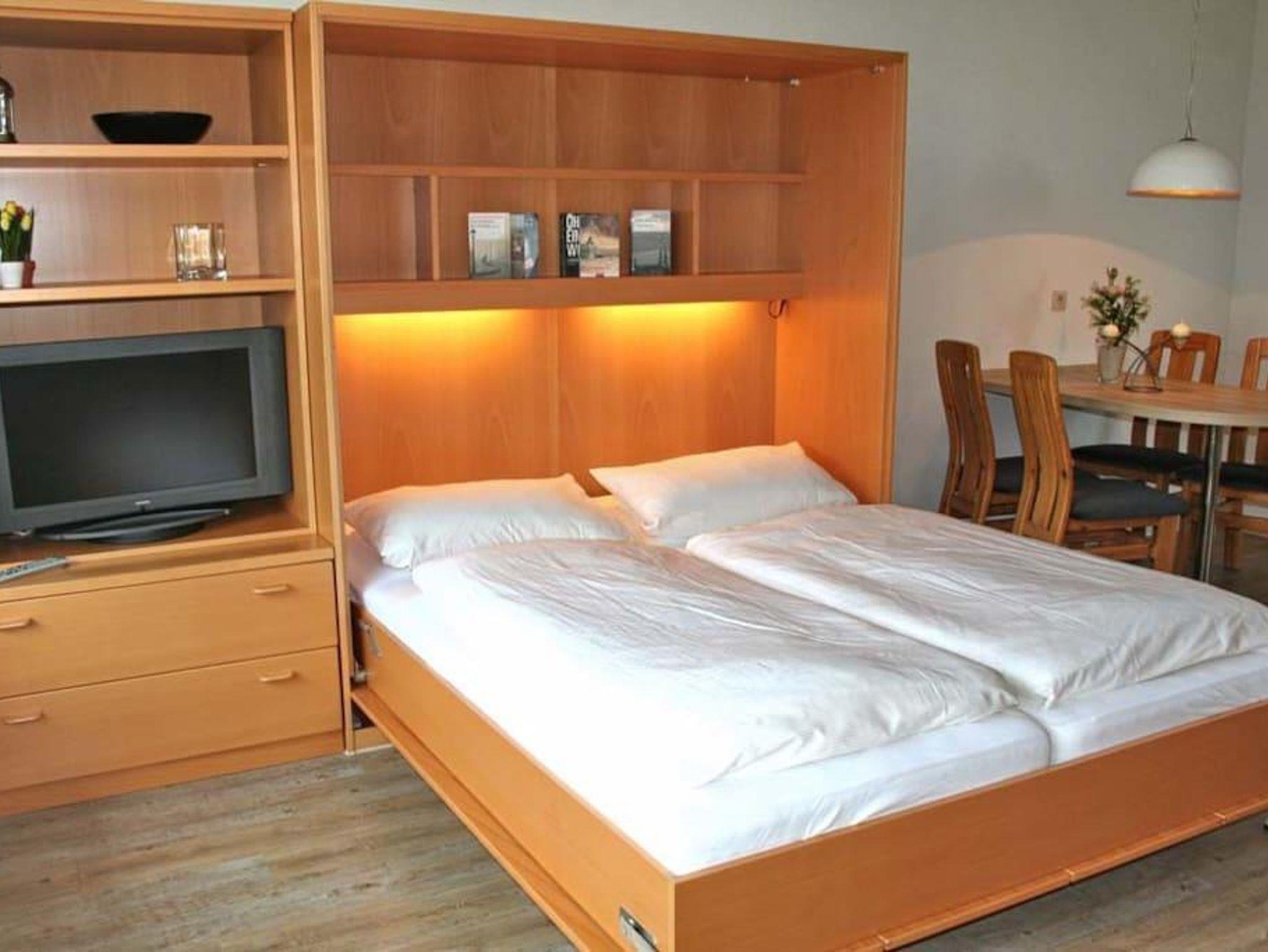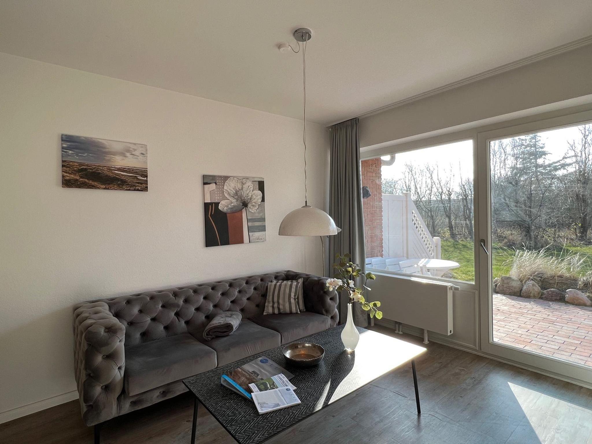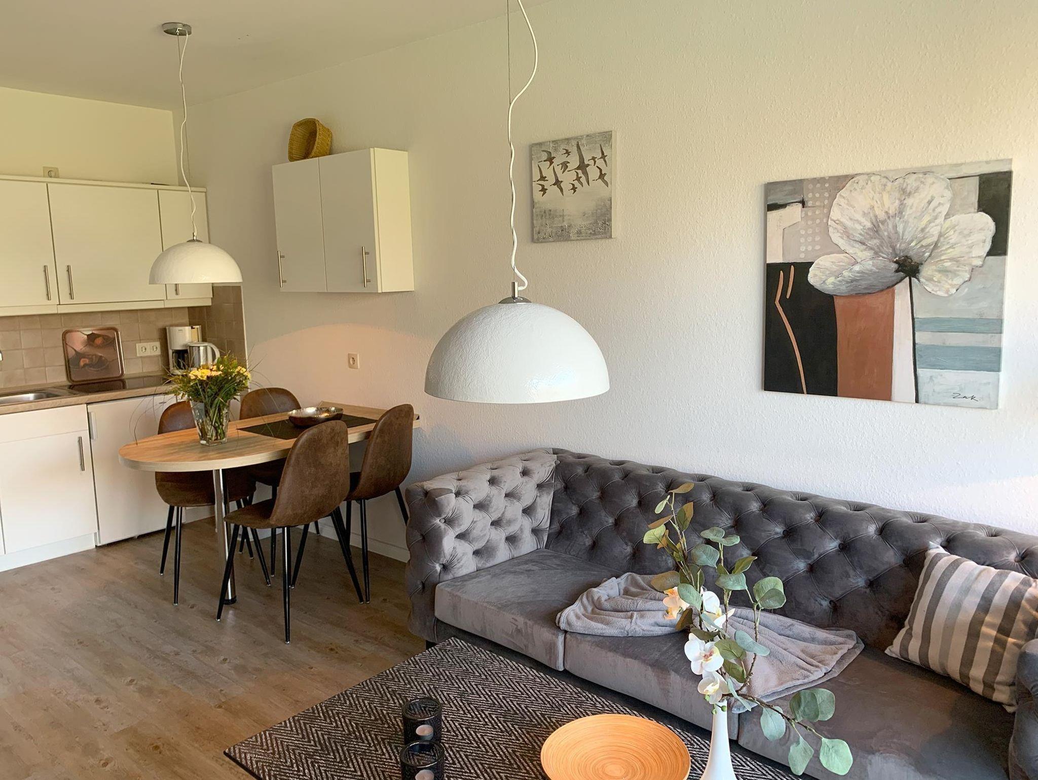 Sie teilt sich wie folgt auf: Eingangsdiele mit Garderobe, Schlafzimmer mit Doppelbett (180x200), Duschbad mit WC. Der großzügige Wohnraum mit direktem Zugang zur Terrasse und Garten überzeugt mit seiner gemütlichen Sitzecke und dem direkten Blick nach draußen. Moderne, weiße Küche, Essecke und als weitere Schlafmöglichkeit 1 Doppelschrankbett. Die Fußböden der Ferienwohnung sind aus Designerparkett oder Fliesen. Allergikergeeignet.