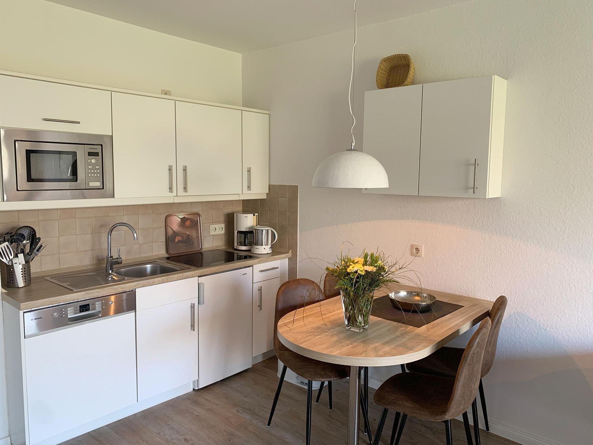 • komplett eingerichtete Küche mit Ceranfeld, Mikrowelle, Geschirrspüler, Kühlschrank mit Gefrierfach, Wasserkocher, Kaffeemaschine (Filter), Toaster.