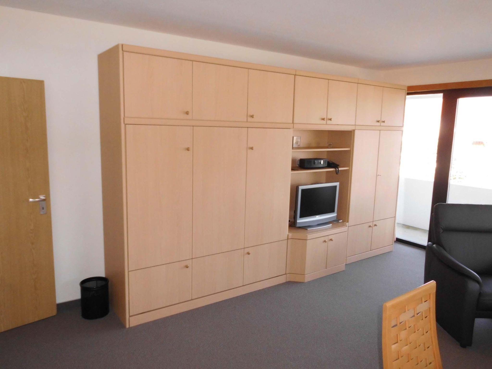 Schlafraum mit 2 Einzelbetten, Wohn-Schlafraum mit 2 Wandschrankbetten Teppichfußboden (2015 neu), Sitzecke, Essecke, Küchenzeile mit Geschirrspüler und Backofen, Dusche/WC, Kabel-TV, Durchwahltelefon, Balkon, PKW-Platz-Nr. 42, Aufzug, Fahrradkeller, Rezeption, Brötchenservice, Schwimmbad, Sauna kostenpflichtig, kostenfreier Internetzugang (LAN1-Germania).