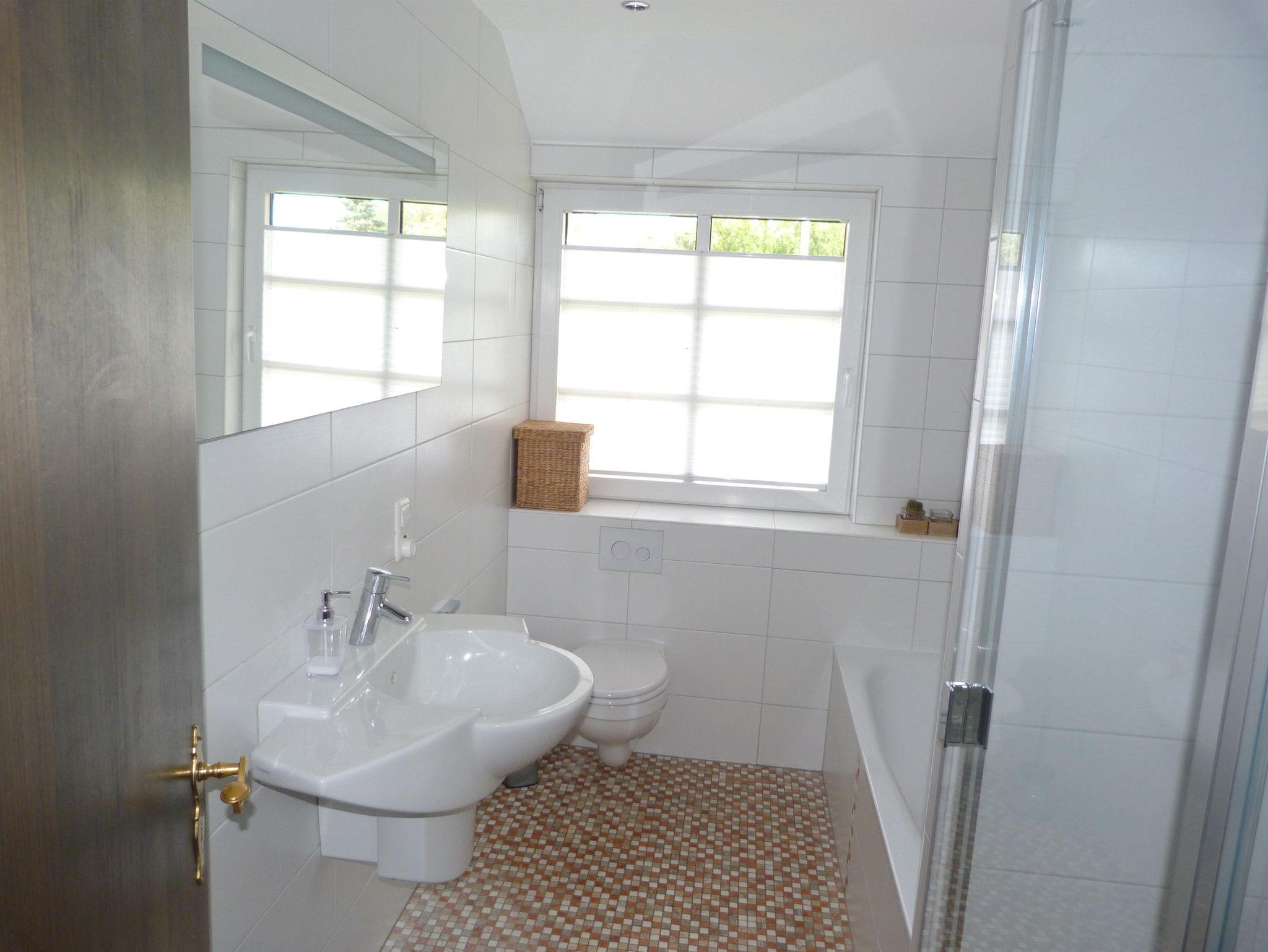Die Schlafräume und ein Bad befinden sich im Obergeschoß, die Wohnräume, die Küche und ein weiteres Bad im Erdgeschoß. Im Obergeschoß ist noch eine Küchenzeile, so dass bei 2 Familien auch einmal getrennt voneinander gekocht und gegessen werden kann.