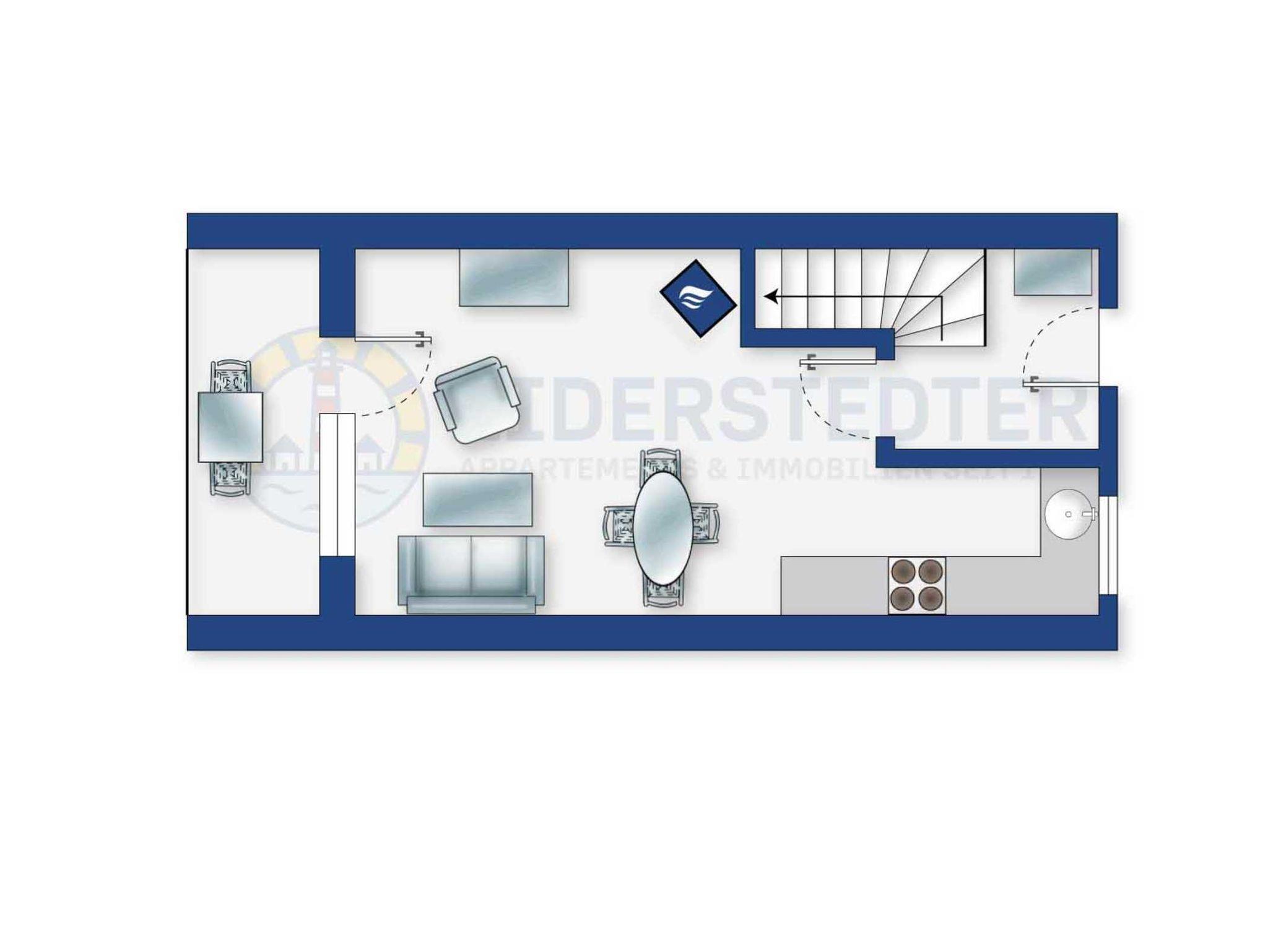 Wohnzimmer mit Sofa (2er), 2 Korbsesseln, Kaminofen, TV (Sat), DVD-Player, Stereo-Kompaktanlage und Esstisch mit 4 Stühlen. Direkter Zugang zur windgeschützten, möblierten Terrasse nach Osten. Offene Küche mit Backofen, Kühlschrank mit Gefrierfach und Geschirrspüler. Keine Mikrowelle. Abstellraum mit Staubsauger und Bügelset.