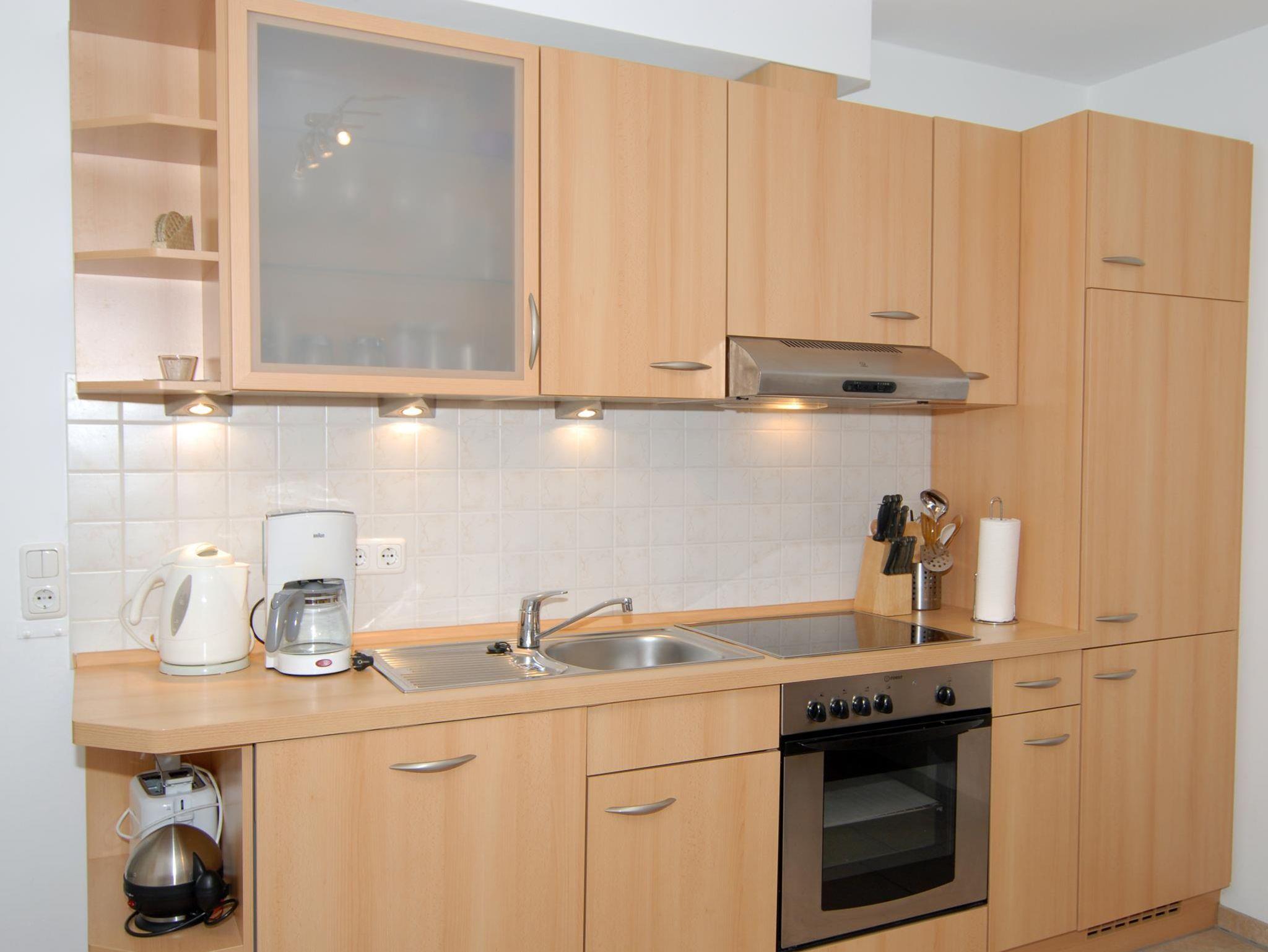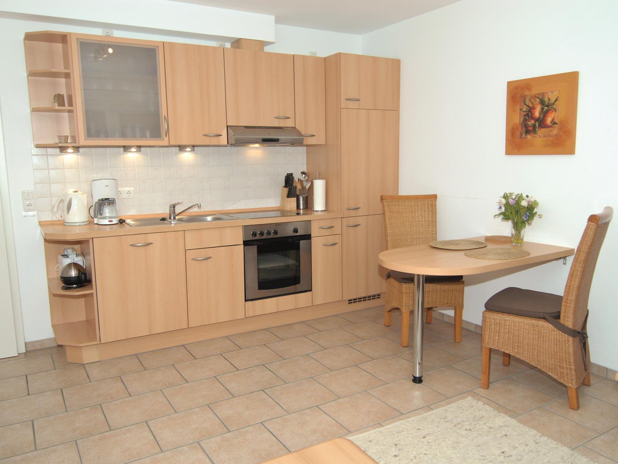 Wohnzimmer: Couch, Couchtisch, Sessel, Stehlampe, TV-Regal, Sat-TV, Stereoanlage mit CD-Player, Esstisch, 2 Stühle, Küchenzeile, 4 Plattenherd mit Ceranfeld und Backofen, Dunstabzugshaube, Kühlschrank, Spülmaschine, Kaffeemaschine, Wasserkocher, Eierkocher, Toaster, Geschirr, Kochtöpfe