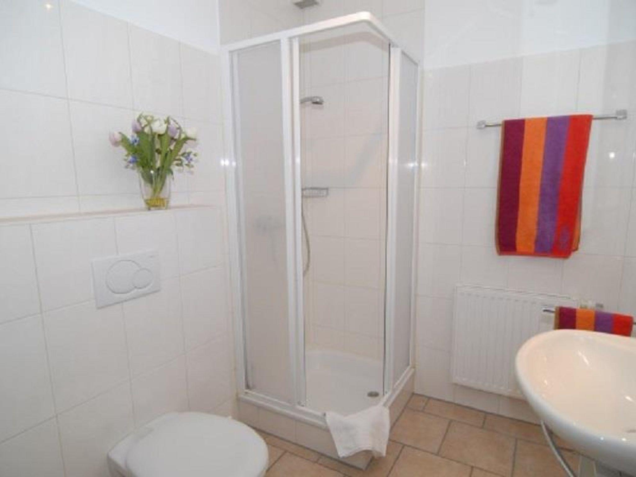 Bad: Dusche, Waschbecken, WC, Hocker, Duschkabine