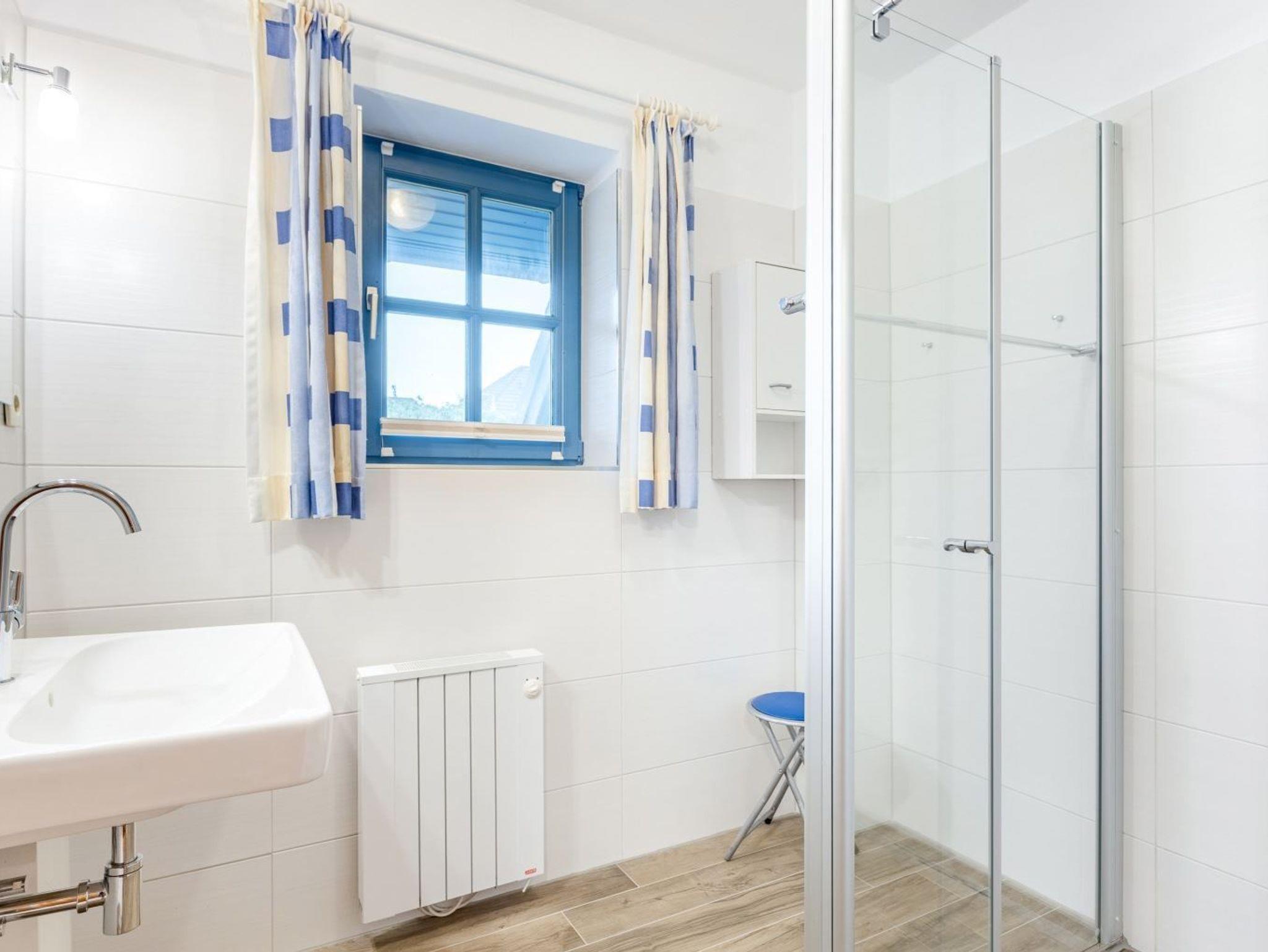 Badezimmer (Duschbad) mit bodengleicher (Regen-) Dusche, Tageslicht und Föhn. Separates WC mit Waschbecken.
