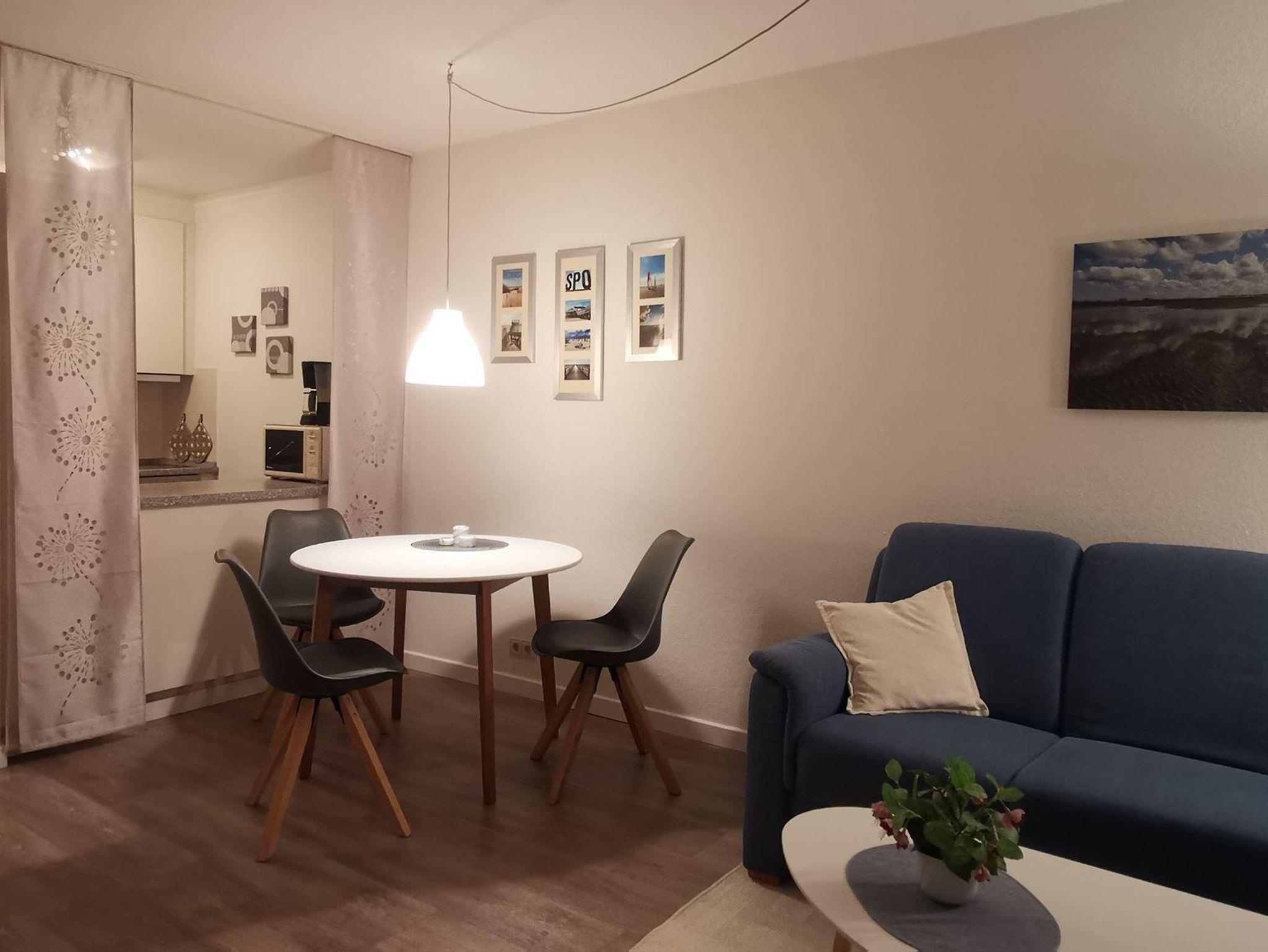 Das gemütliche, sehr gut und in 2023 neu ausgestattete Appartement Nr.8 befindet sich in der 1.Etage des Hauses Residenz, Im Bad 22. Es liegt sehr zentral im Kurzentrum, Ortsteil St. Peter-Bad, nahe Kurpromenade mit Strandübergang, Seebrücke u. Dünentherme und eignet sich somit auch ideal für Kuraufenthalte. Es besteht aus einem Wohn-Schlafraum mit Sitzgruppe, Essecke u. Schrankdoppelbett (1,60x2,00) auf einem mit Designplanken belegten Fußboden, einer offenen 2-zeiligen Küche (diese enthält u.a. E-Herd, Dunstabzug, Backofen, Kühlschrank, Mikrowelle, Kaffeemaschine, Wasserkocher, Toaster, Mixer, Bügeleisen) u. einem Bad mit Wanne u. Duschvorrichtung, WC, Föhn vorhanden. Südloggia mit Blick zum Garten. Für Unterhaltung ist gesorgt durch Spiele, Bücher, W-Lan, Kabel-TV, Radio, CD-Player u. Gästeinfo-Ordner mit vielen Tipps. Ein PKW-Stellplatz Nr. 65 ist für Sie im abschließbaren Teil des Parkhauses, Im Bad 4 reserviert. Fahrradabstellflächen befinden sich im Innenhofgarten u. im Keller. Münz-Waschmaschine u. Münz-Trockner im Keller sind gegen Gebühr nutzbar. Einen EDEKA-Markt finden Sie im Nachbargebäude.Nichtraucherobjekt, keine Haustiere erlaubt.
