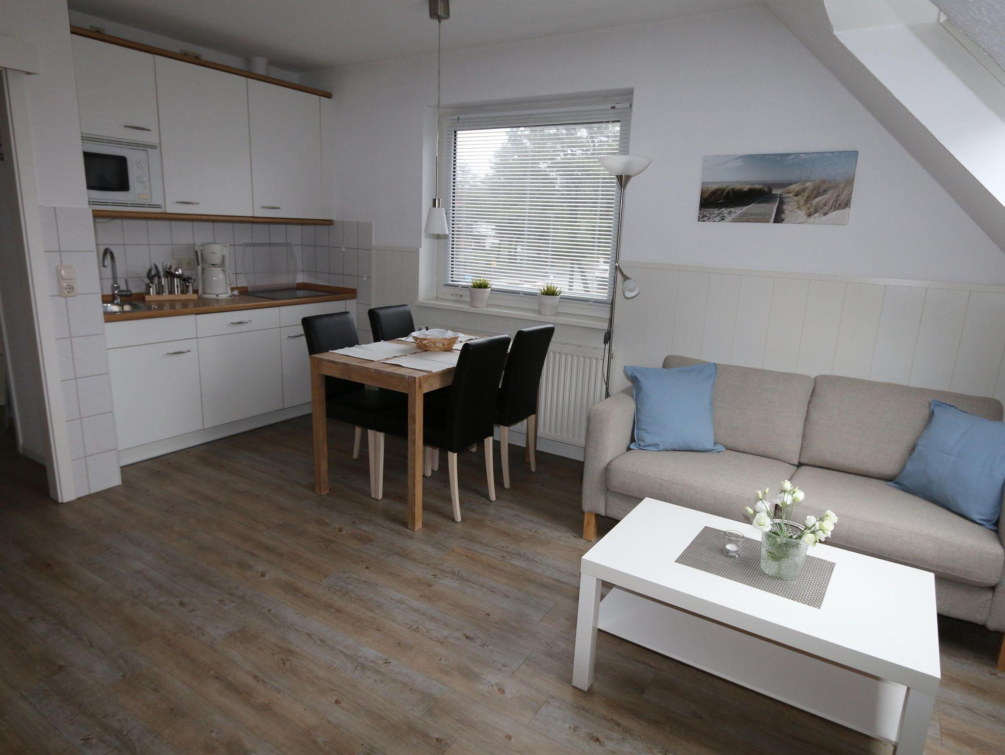 Die moderne und helle Ferienwohnung für 2 - 4 Personen befindet sich im ersten Stock und bietet Ihnen einen separaten Schlafraum mit einem Einzelbett (Auszugsmöglichkeit zum Doppelbett), Flur, Duschbad, sowie einen kombinierten Wohn- Schlafraum (Doppelbett als Schrankbett) mit Küchenzeile. Von dem Südost-Balkon sieht man die Sonne aufgehen.