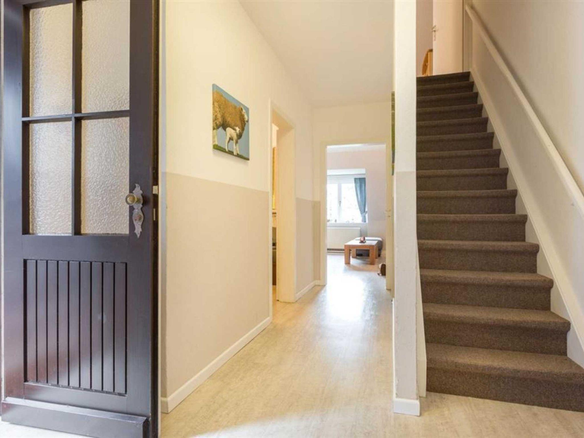 Flur mit Spiegel, Garderobe und Schuhablage im Eingangsbereich. Abstellraum mit Staubsauger, Gartenmöbeln und kostenlosem Kinderreisebett.