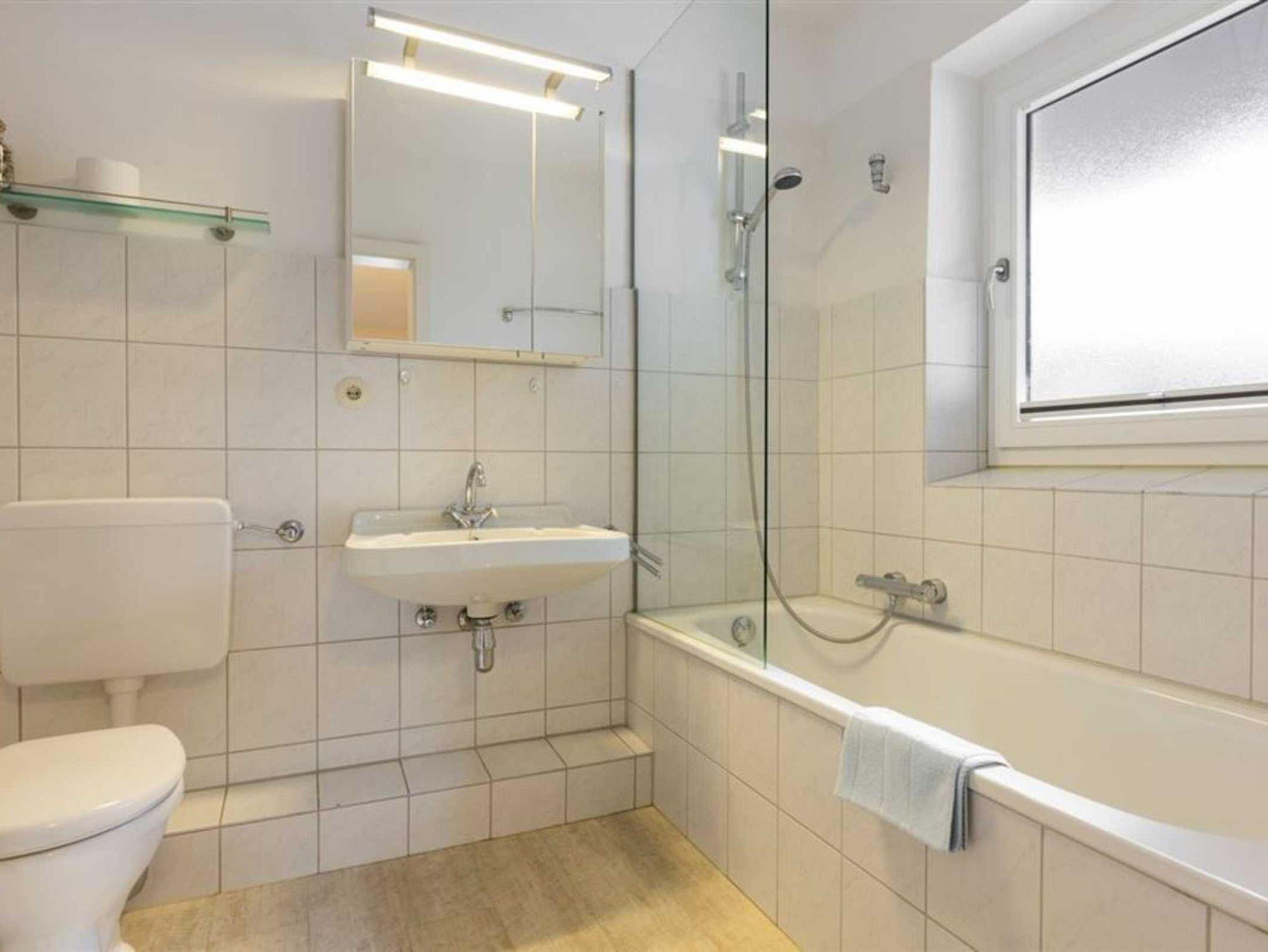 Badezimmer (Wannenbad) mit Badewanne mit Dusch-Handstück, WC, Tageslicht und Föhn.