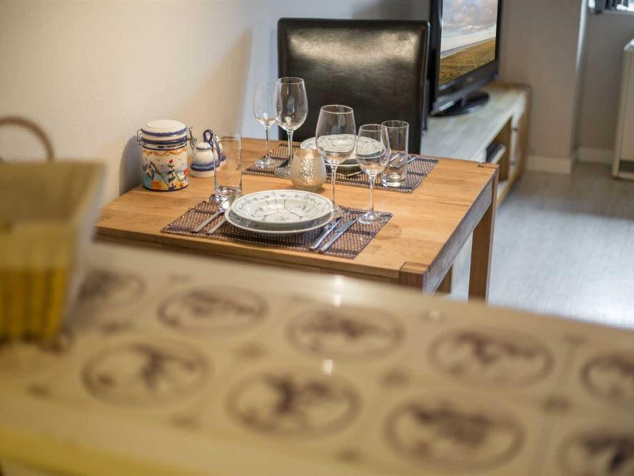 Wohnzimmer mit Sofa (2 Personen), Esstisch mit 2 Stühlen, TV (Sat), DVD-Player und Stereo-Anlage.