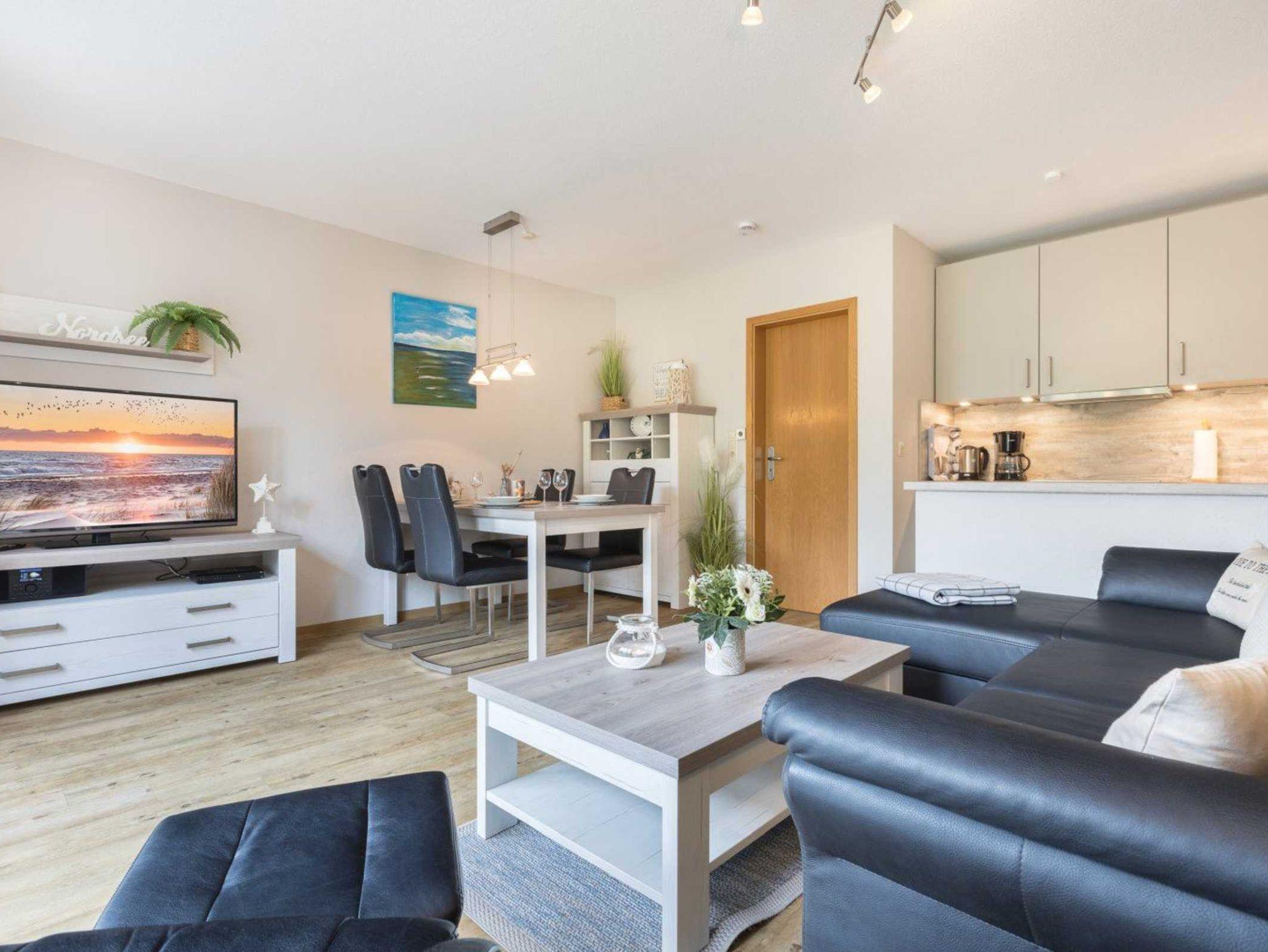Modernes und elegantes Wohnzimmer mit Lederecksofa, Ruhesessel, TV (Sat) und Esstisch mit 4 Stühlen. Direkter Zugang zur möblierten und überdachten Gartenterrasse nach Westen mit Grillmöglichkeit. Offene Küche mit Backofen, Geschirrspüler und Kühlschrank mit Gefrierfach.