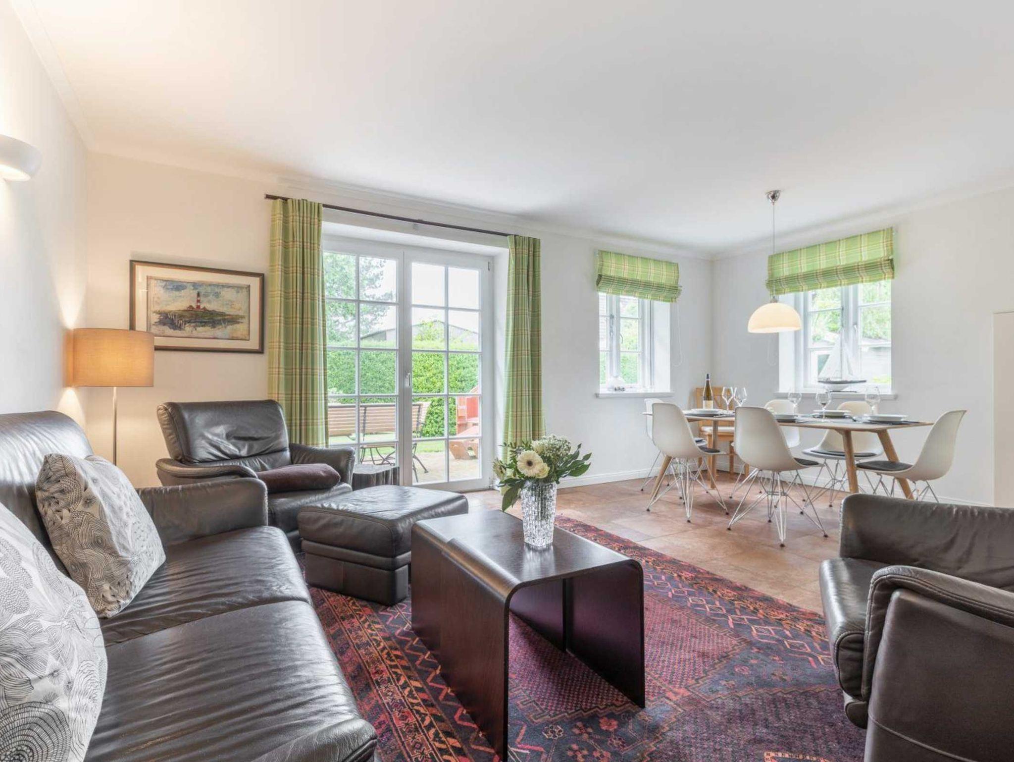 Wohnzimmer mit Sofa (2-3 Personen), 2 Sesseln, Kaminofen, SMART-TV (Sat), BluRay-Player, Stereo-Kompaktanlage mit Bluetooth und Esstisch für 6 Personen. Offene Küche mit Backofen, Mikrowelle, Geschirrspüler, Kühlschrank mit Gefrierfach und Philips Senseo Pad-Kaffeemaschine. Direkter Zugang zur möblierten Gartenterrasse mit Strandkorb und Westausrichtung.