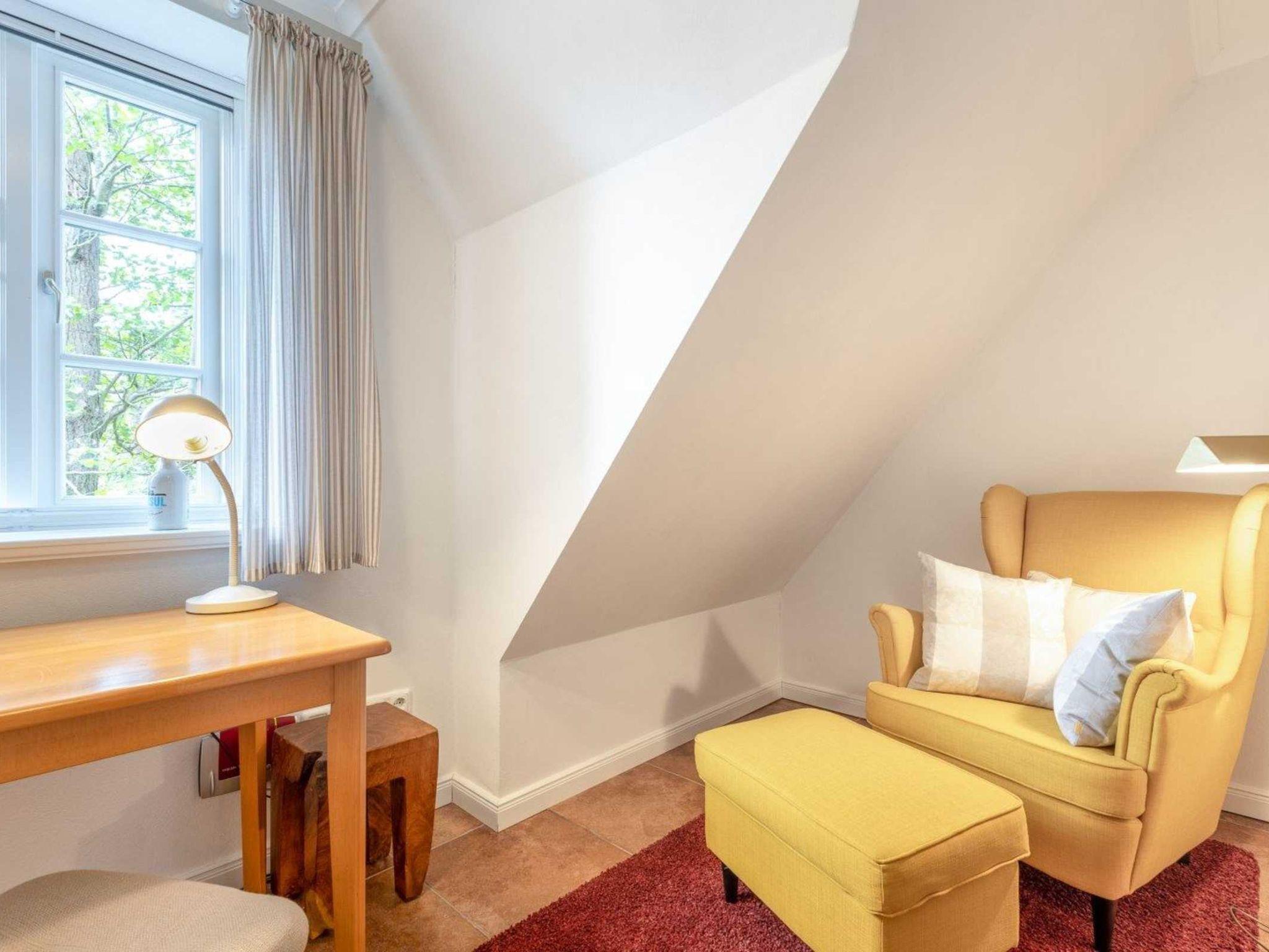 3. Schlafzimmer mit Einzelbett (100x200cm, Boxspring), kleiner Soundanlage, Liegesessel, Tisch und Kleiderschrank. Dieses Schlafzimmer ist galerieartig halboffen.
