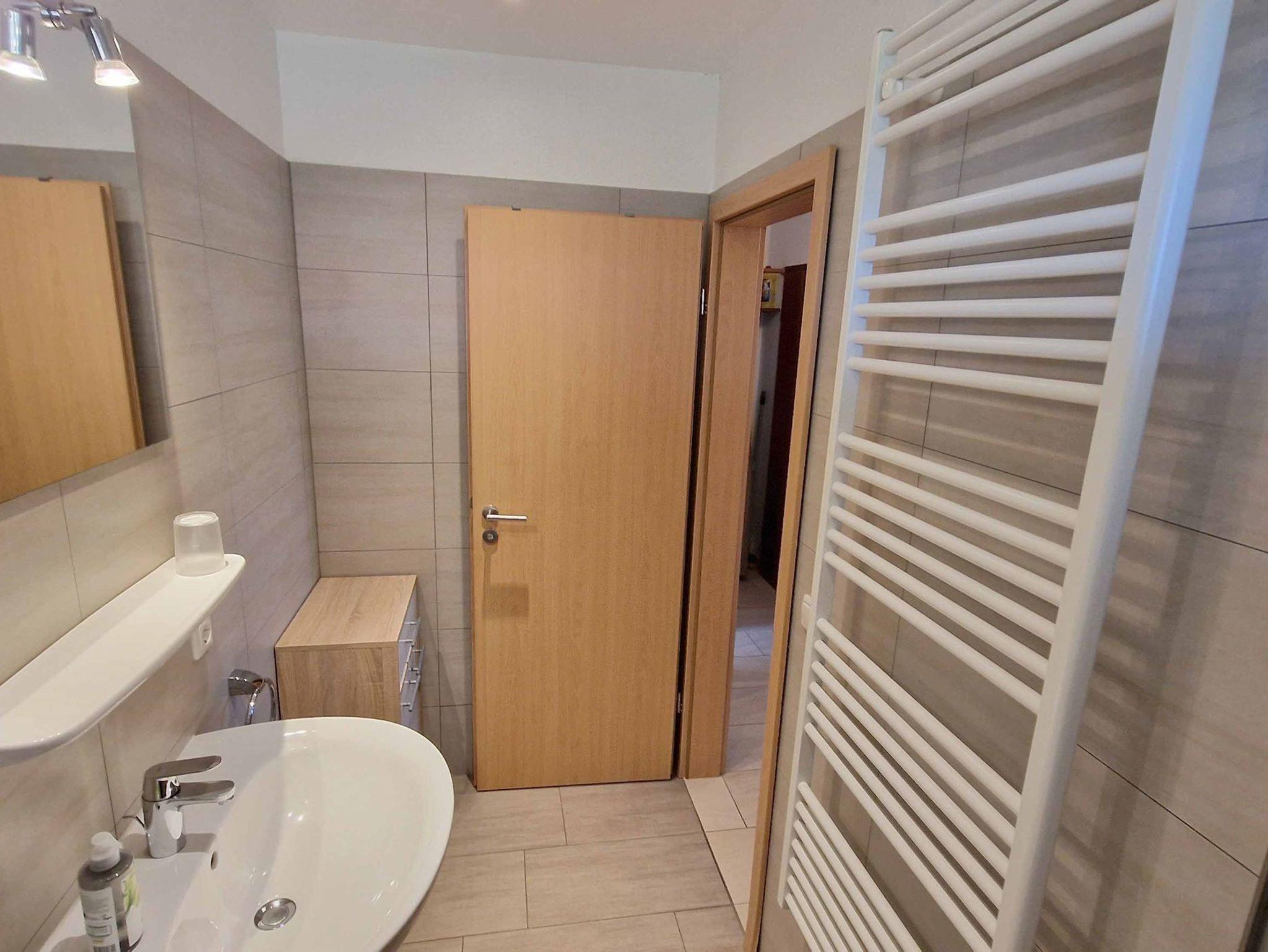 Modernes Badezimmer: Das Badezimmer ist mit einer ebenerdigen Dusche und einer angenehmen Fußbodenheizung ausgestattet, die für zusätzlichen Komfort sorgt.