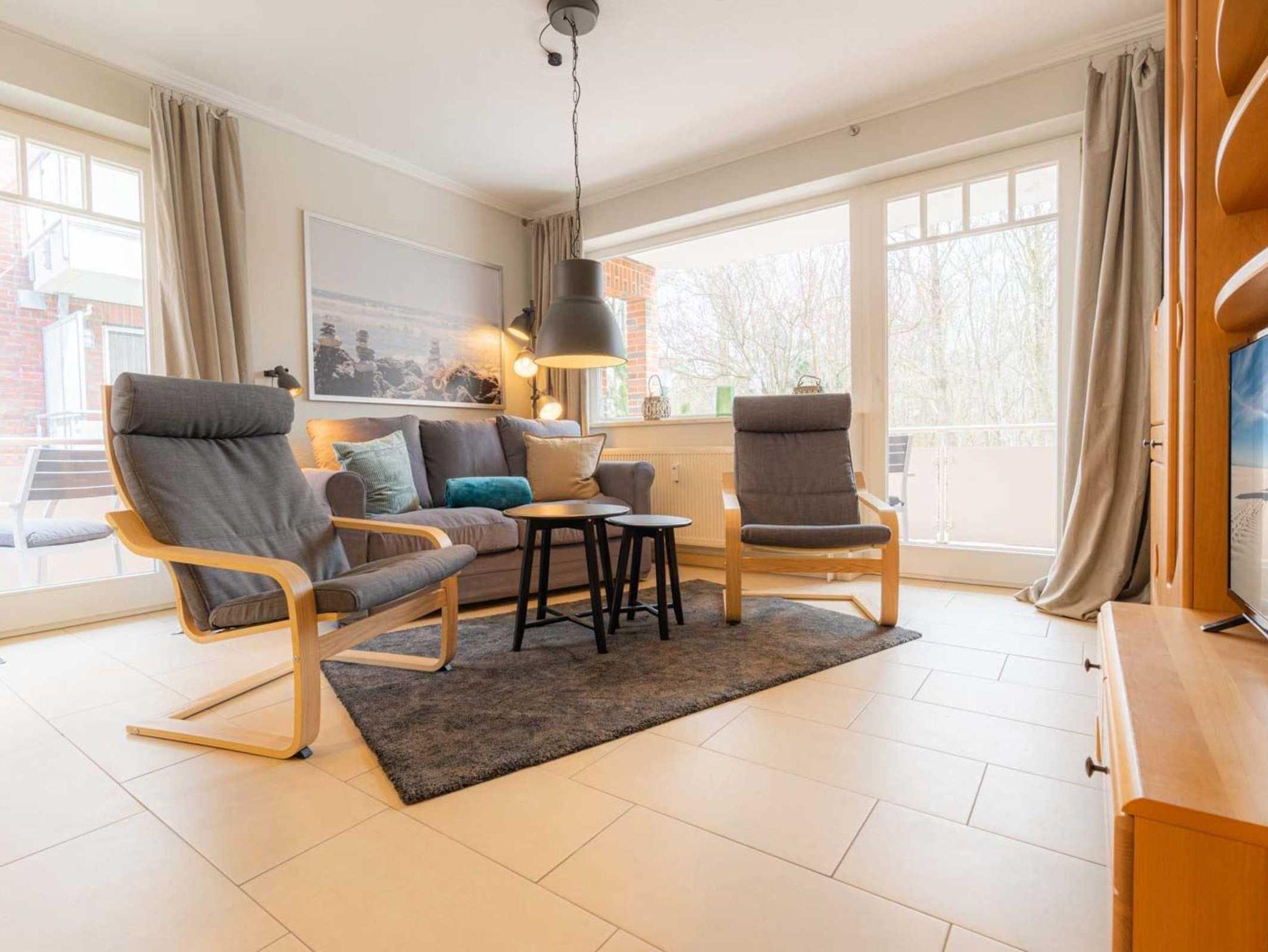 Wohnzimmer mit Sofa für 2-3 Personen, 2 Sesseln, SMART-TV (Kabel), Stereo-Kompaktanlage, Bluetooth-Soundsystem und Esstisch mit 4 Stühlen. Direkter Zugang zu den beiden überdachten Balkonen nach Nordost und nach Südost. Halboffene Küche mit Mikrowelle, Kühlschrank mit Gefrierfach und Geschirrspüler.