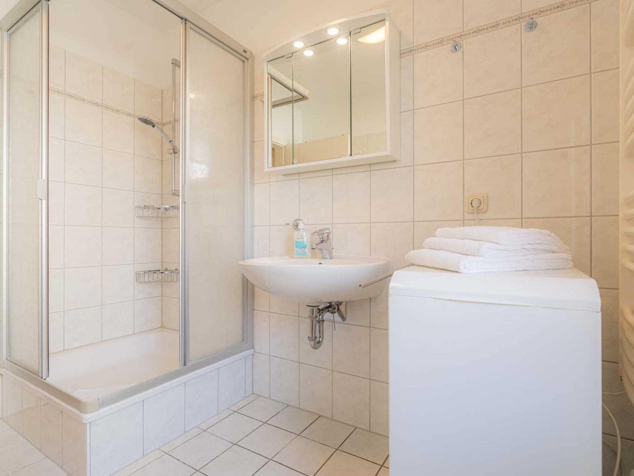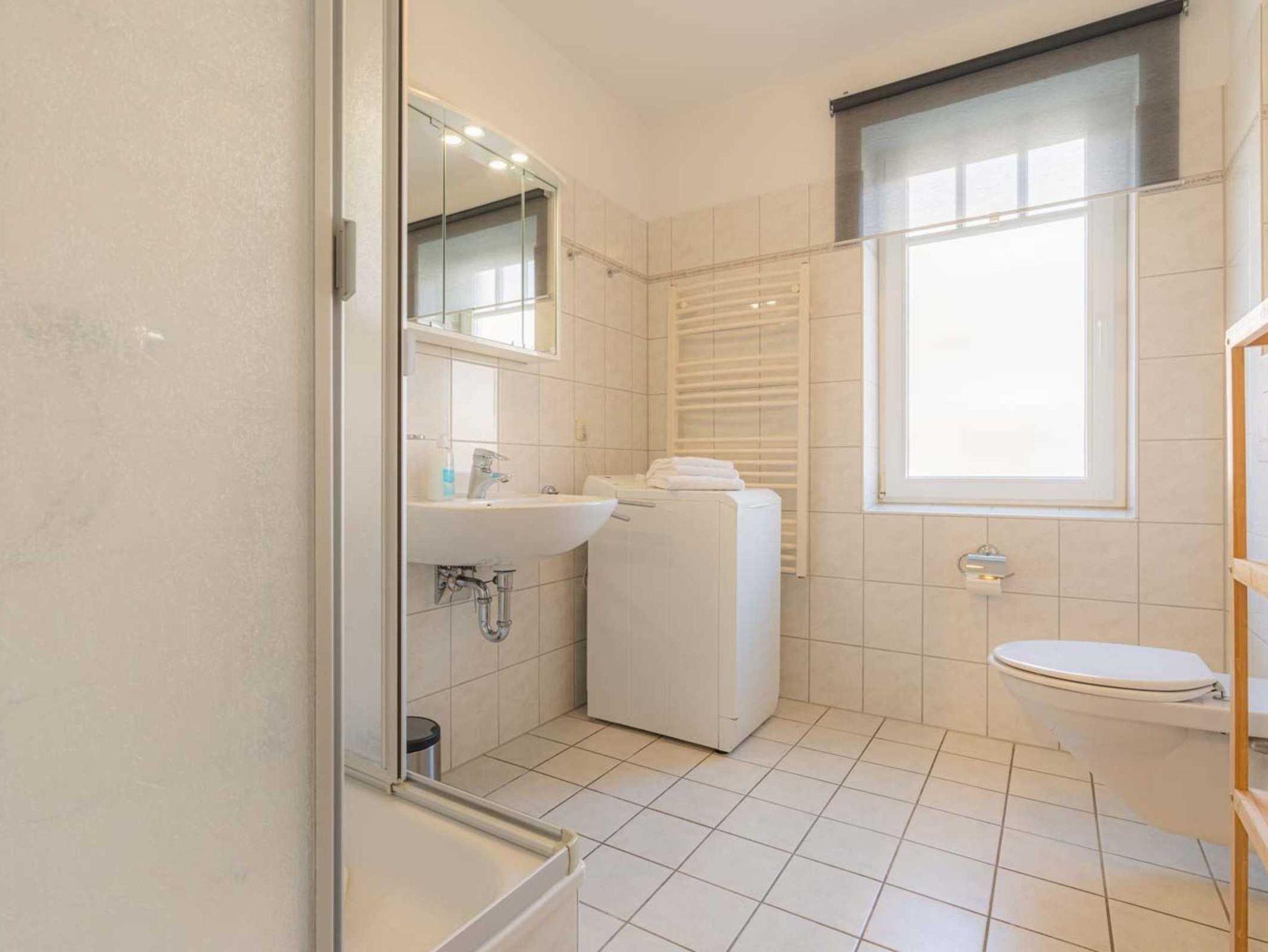 Badezimmer (Duschbad) mit Dusche, WC, Waschmaschine (Toploader), Handtuchwärmer, Tageslicht und Föhn.