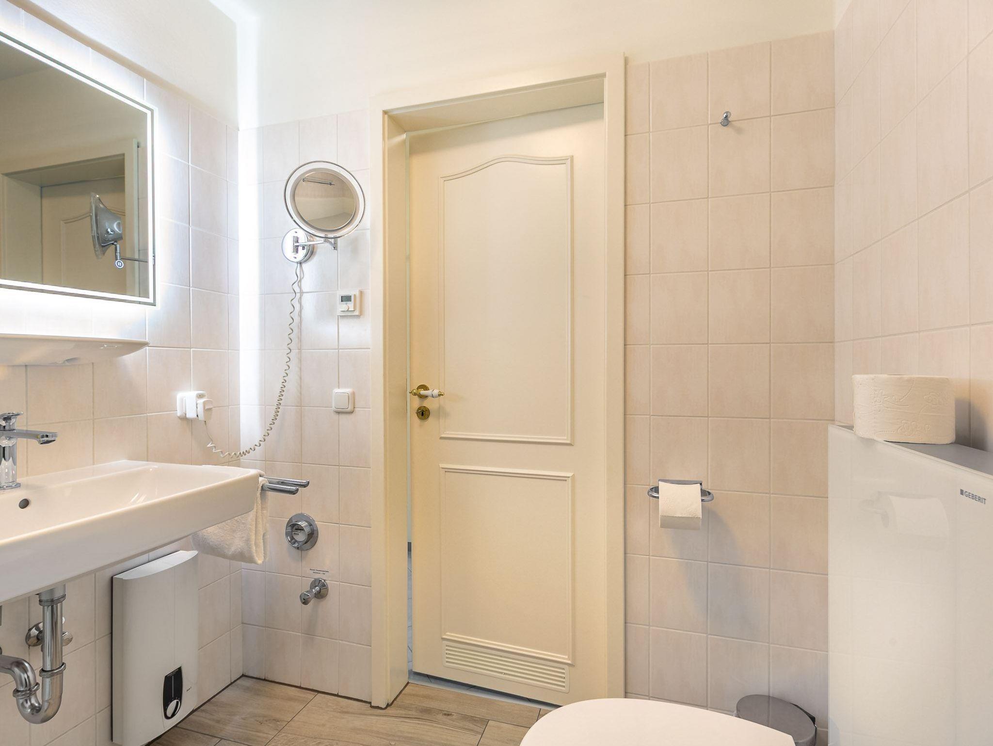 Badezimmer (Duschbad) mit Dusche (niedriger Eintritt: ca. 11cm), WC, Föhn und beleuchtetem Kosmetikspiegel.