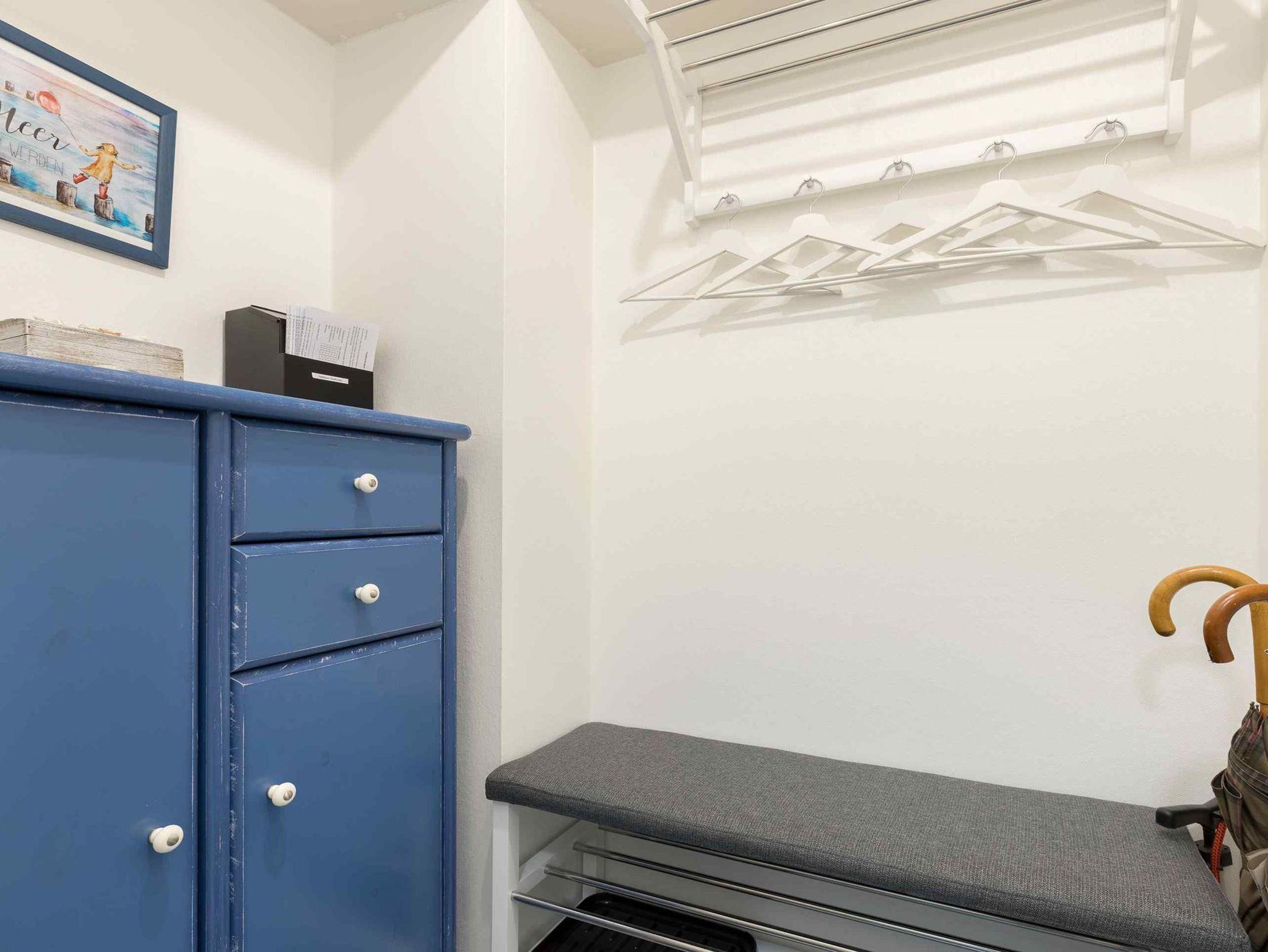 Flur im Eingangsbereich mit Garderobenraum und Haushaltschrank mit Bügelset.