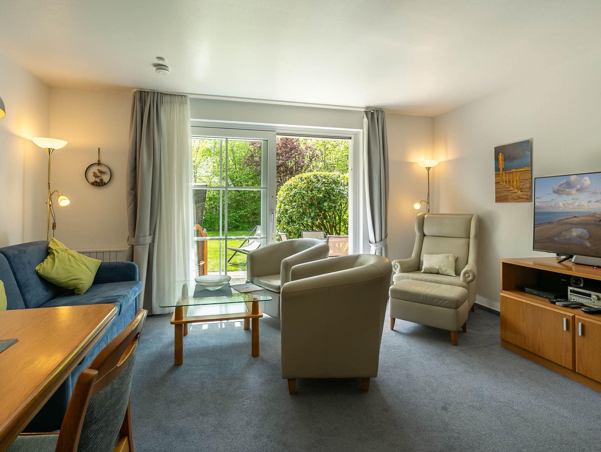 Wohnzimmer mit ausklappbarem (Schlaf-) Sofa (120x195cm), 3 Sesseln, großes SMART-TV (Kabel, 49), BluRay-Player (DVD-Sammlung vorhanden), Stereo-Kompaktanlage mit CD-Player und Esstisch mit gemütlicher Eckbank für 2-3 Personen sowie 2 Stühlen. Direkter Zugang zur möblierten Gartenterrasse nach Süd-Westen mit Strandkorb. Halboffene Küche mit Backofen, Induktionsherd, Mikrowelle, Geschirrspüler und Kühlschrank mit Gefrierfach.