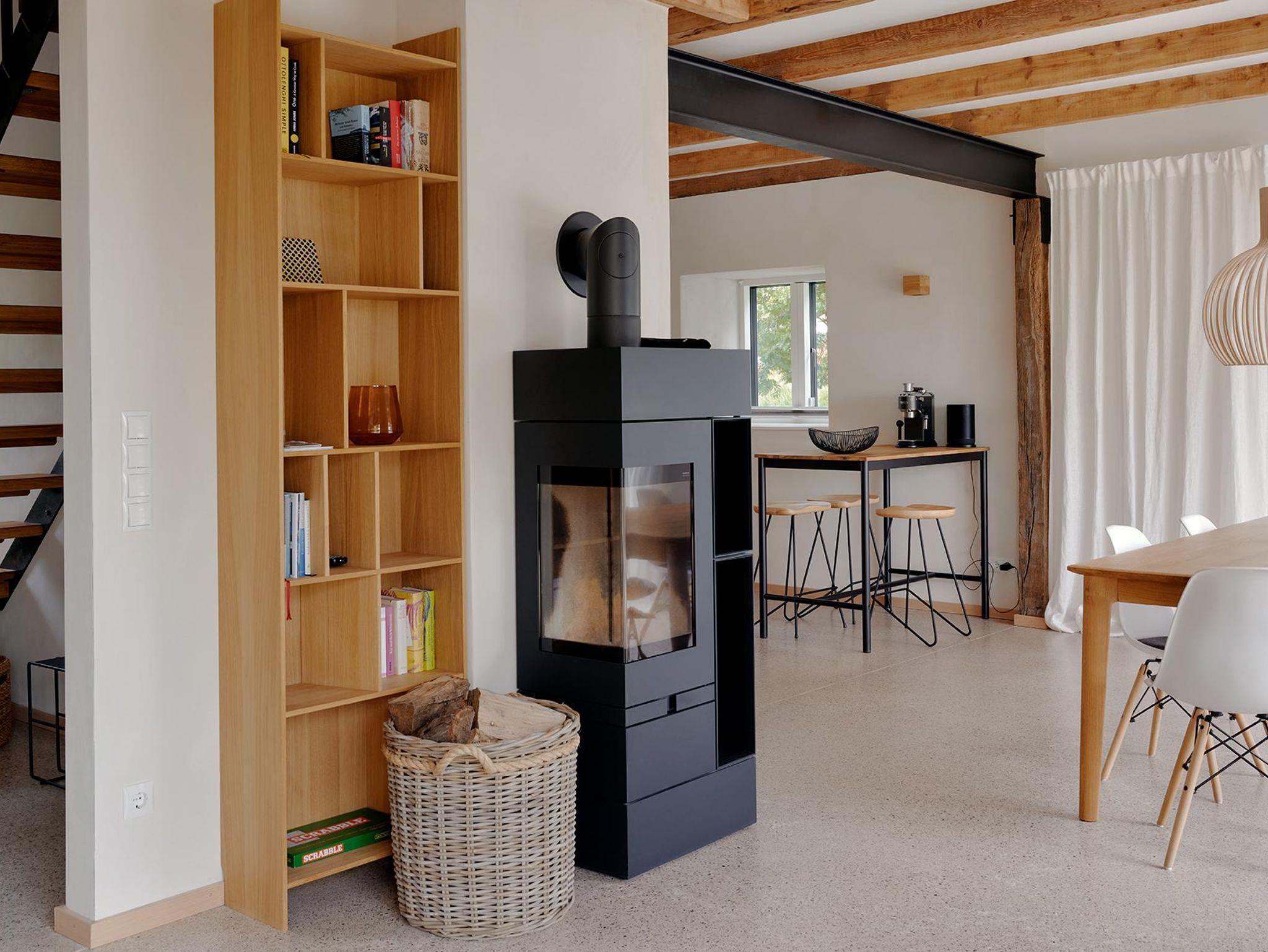 Wohnbereich mit Kamin, großer Couch und Esstisch mit sechs Stühlen. Vollausgestattet Küche (u.a. Induktionsherd, Backofen und Kühlschrank).