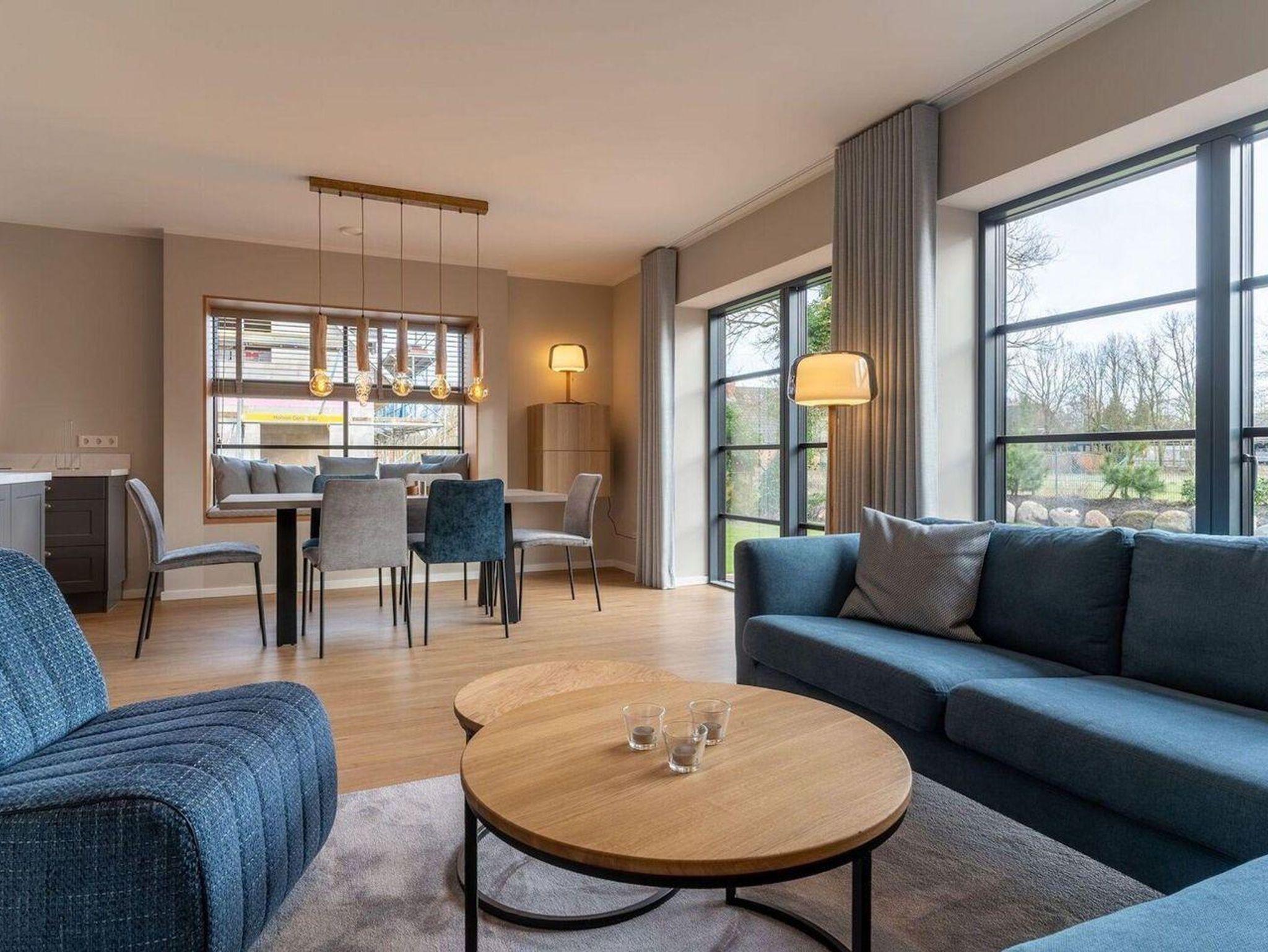 Im Erdgeschoss erwartet Sie ein lichtdurchflutetes Wohnzimmer mit Sofalandschaft, einer offenen Küche im Landhausstil sowie einem integrierten Esszimmer mit hochwertigen Christine Kröncke Möbeln. Besonderes Highlight im Wohnbereich ist die gemütliche Sitzbank direkt im Erkerfenster, die ganz sicher zu einem Ihrer Lieblingsplätze im Haus wird, um ein gutes Buch zu lesen oder den ersten Kaffee am Morgen zu genießen. Vom Flur mit Garderobe, welche ausreichend Platz für Jacken und Schuhe bietet, gelangen Sie in ein Duschbad, sowie in den Hauswirtschaftsraum mit Waschmaschine und Trockner. Eine vom Wohnzimmer aus abgehenden Treppe führt ins geräumige Obergeschoss. Zwei Schlafzimmer mit je einem Boxspring-Doppelbett (180x200 m) sind ausgestattet mit TV und großen Kleiderschränken. Ein drittes Schlafzimmer besitzt zwei große Boxspring-Einzelbetten (100x200 m) und lässt Ihre Kinder, die Großeltern oder liebe Freunde gemütlich und ruhig schlafen. Ein zweites vollausgestattetes Badezimmer im OG, mit offener Dusche und zwei einzelnen Waschbecken runden das hochwertige Hauskonzept ab und lassen keine Wünsche offen.