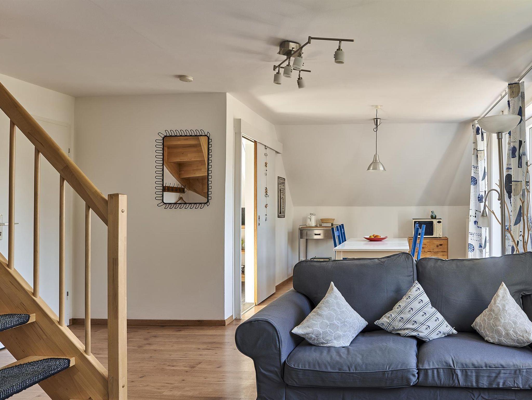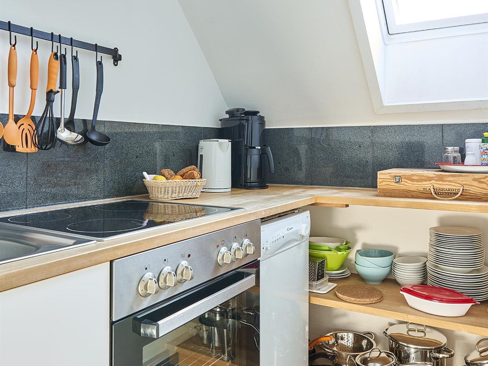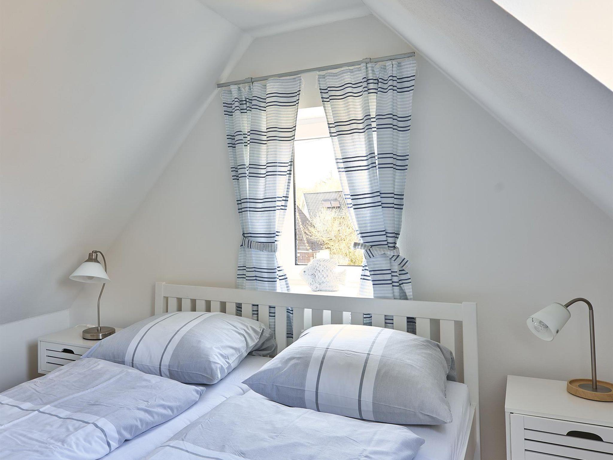 zwei gemütliche Schlafzimmer im Dachgeschoss (1 Doppelbett 1,60cm x 2,00 m, 2 Einzelbetten 0,90x2,00 m und 1,00 x 2,00m), dazwischen ein kleine Bad. Die kleine Küche ist mit Kühlschrank Herd,Backofen, Dunstabzugshaube, Mikrowelle und Geschirr, Besteck , Gläsern top- ausgestattet, Im offenen Wohn-Esszimmer haben Sie ein Smart-TV, Bücher und Spiele. Danebein liegt das moderne Badezimmer.