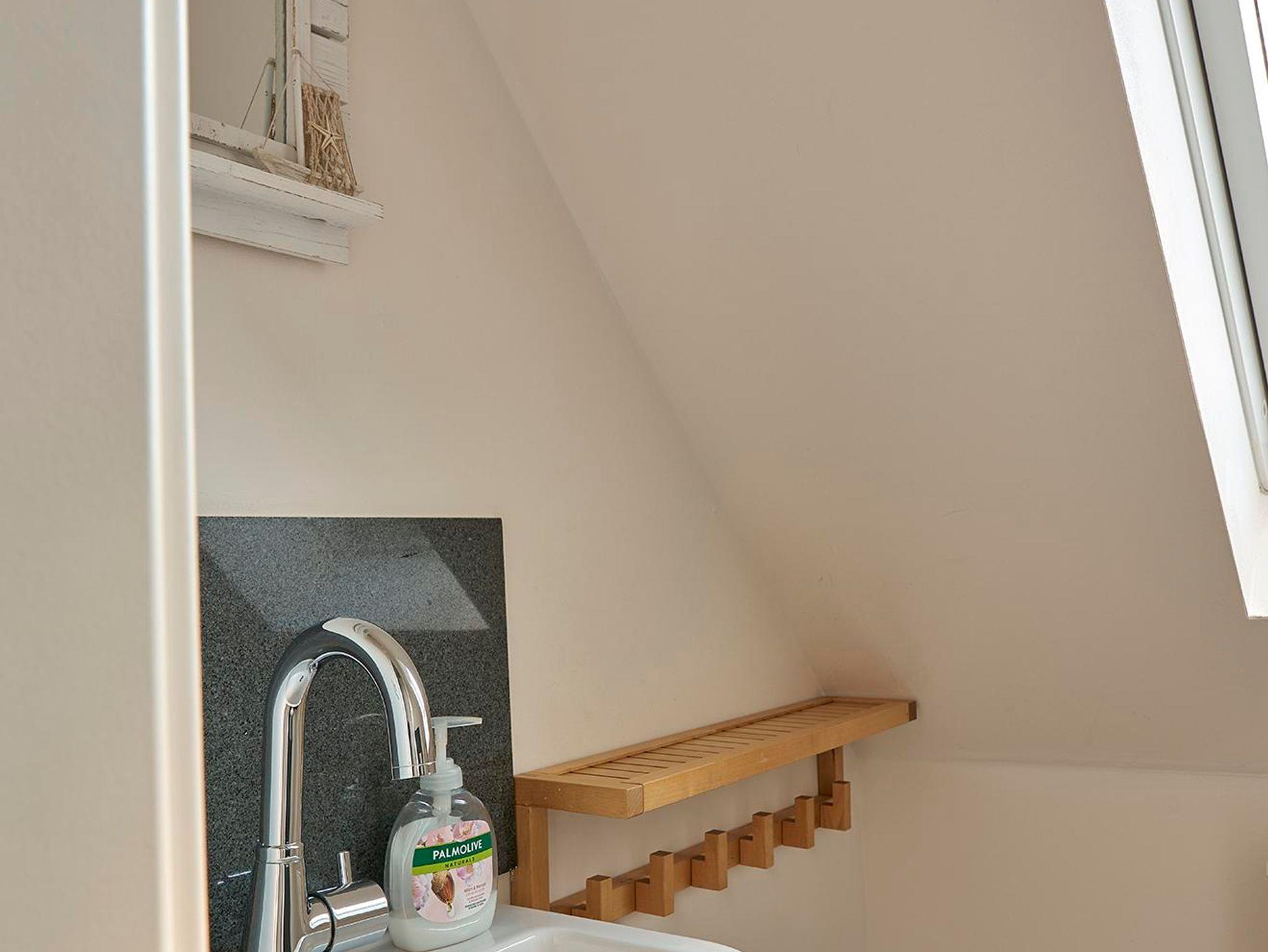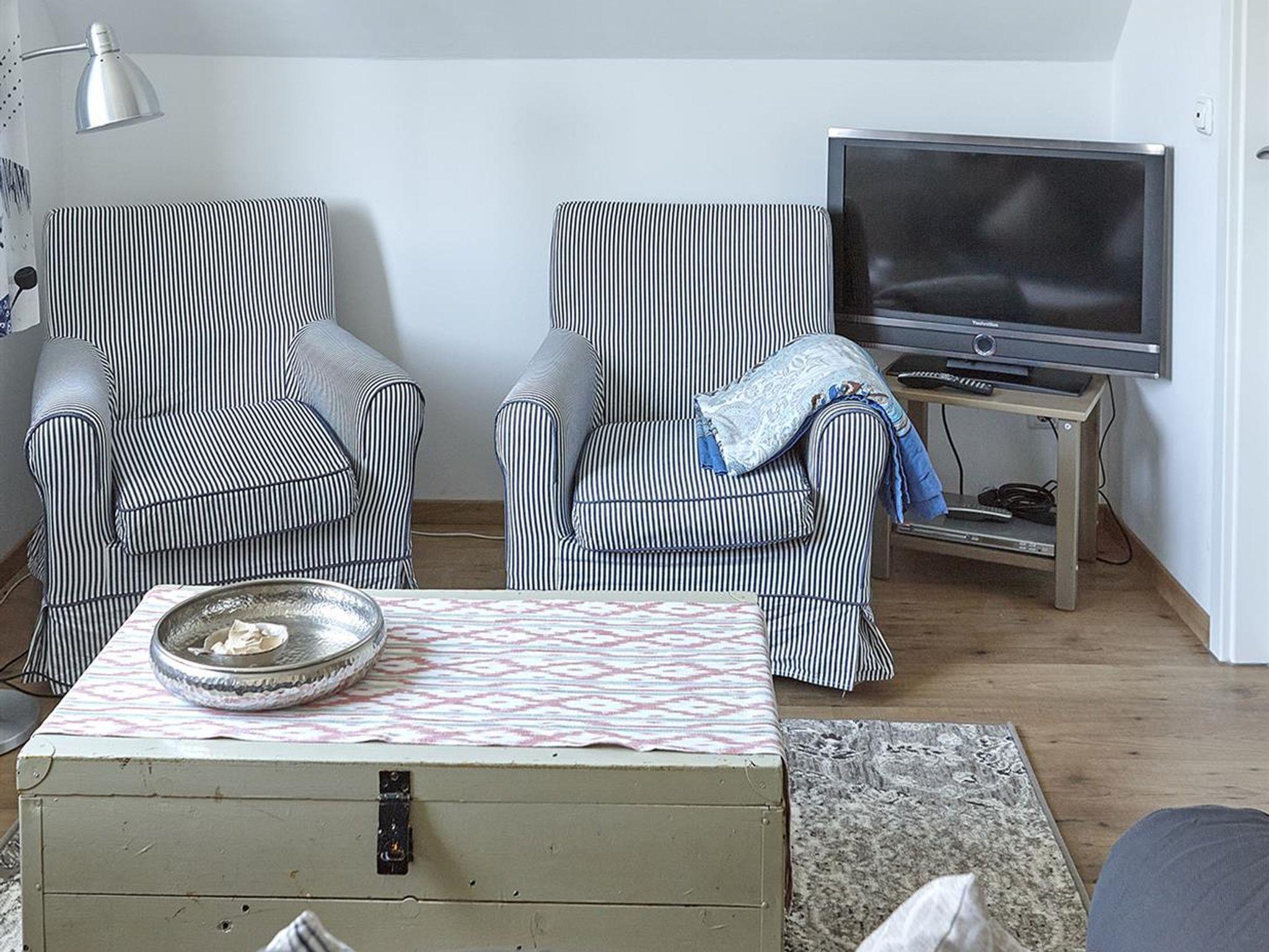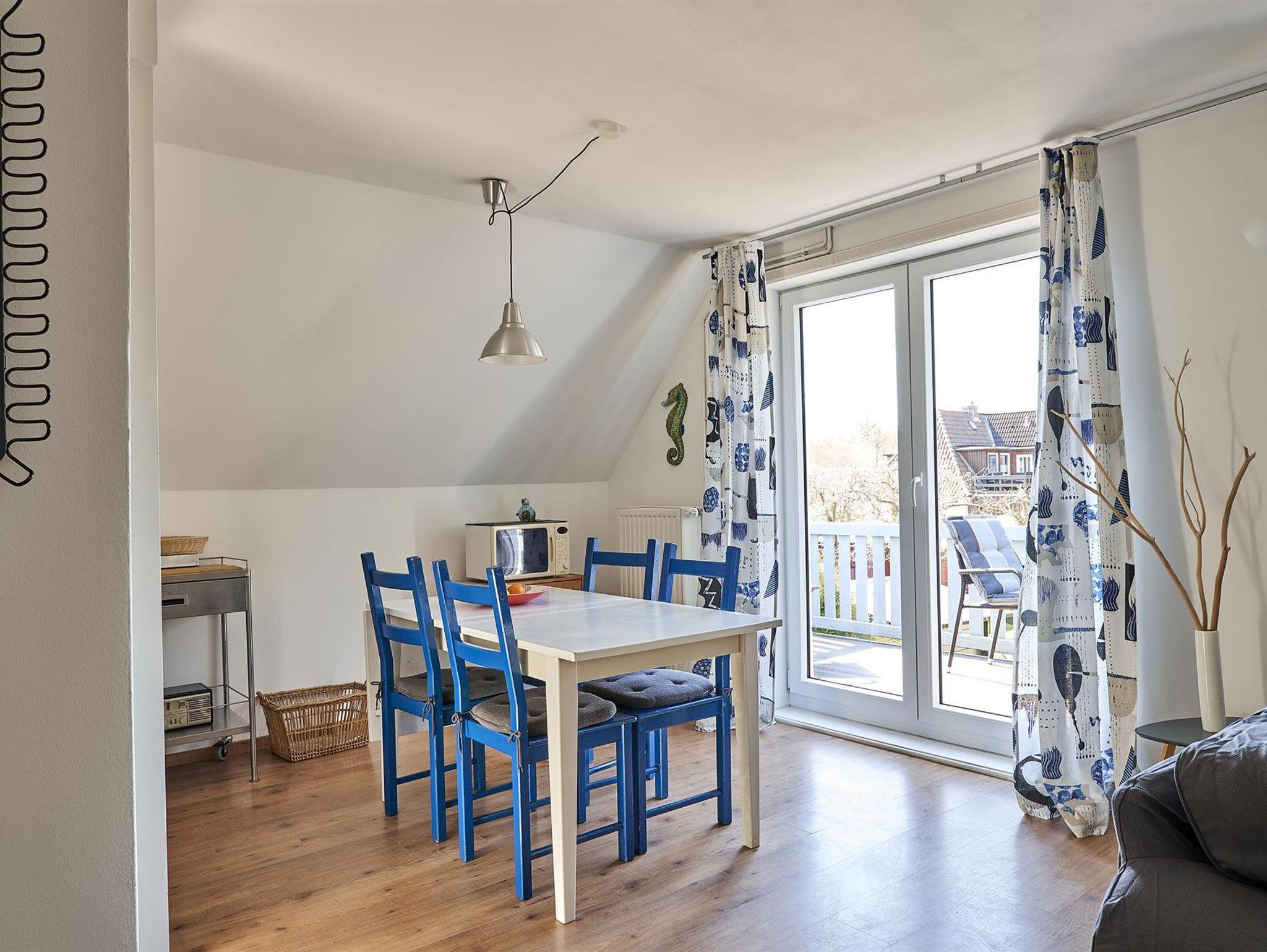 zwei gemütliche Schlafzimmer im Dachgeschoss (1 Doppelbett 1,60cm x 2,00 m, 2 Einzelbetten 0,90x2,00 m und 1,00 x 2,00m), dazwischen ein kleine Bad. Die kleine Küche ist mit Kühlschrank Herd,Backofen, Dunstabzugshaube, Mikrowelle und Geschirr, Besteck , Gläsern top- ausgestattet, Im offenen Wohn-Esszimmer haben Sie ein Smart-TV, Bücher und Spiele. Danebein liegt das moderne Badezimmer.