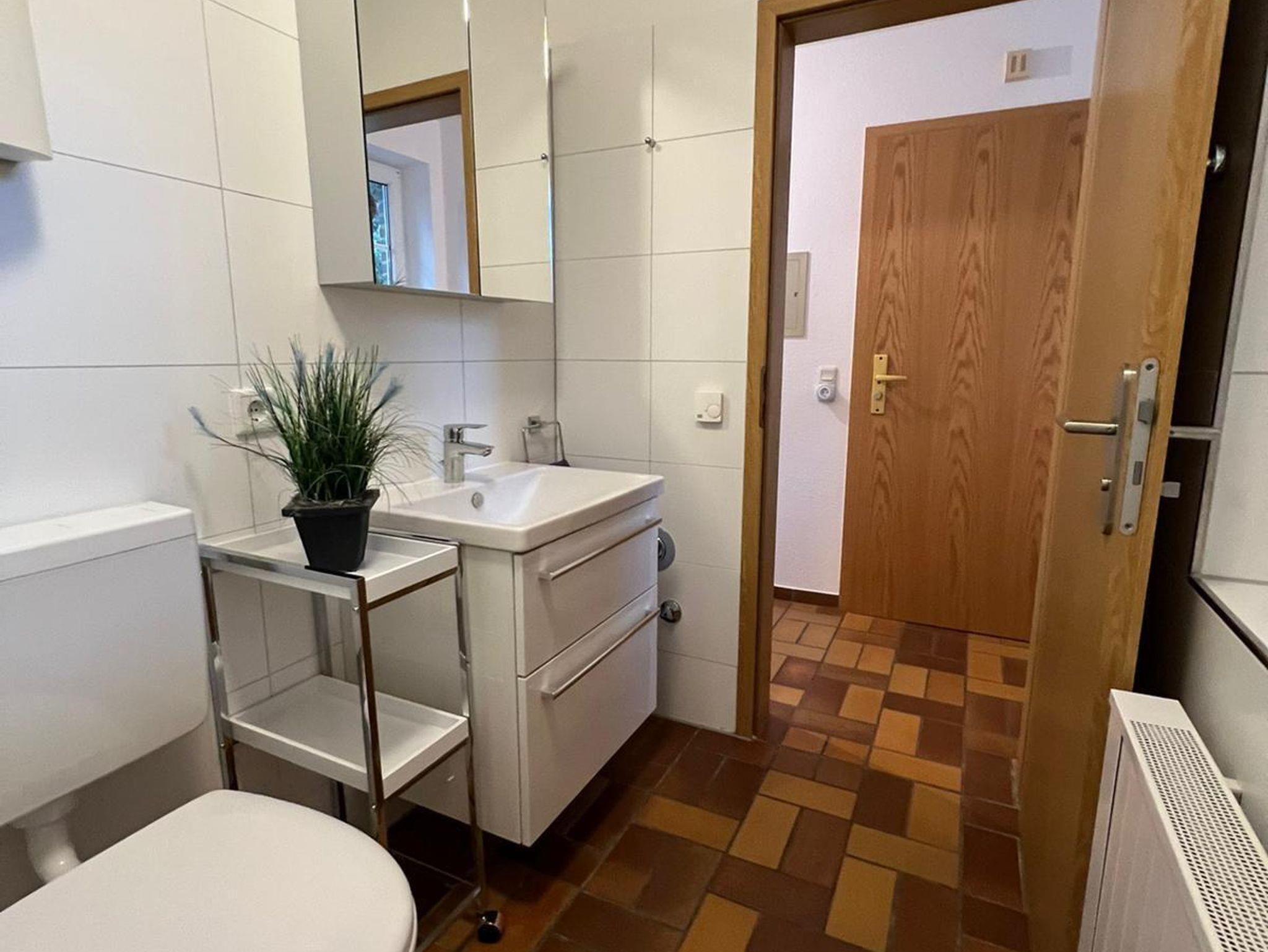 Bad: Dusche m. Glastrennwand, WC, Spiegelschrank Haartrockner, Außenfenster.