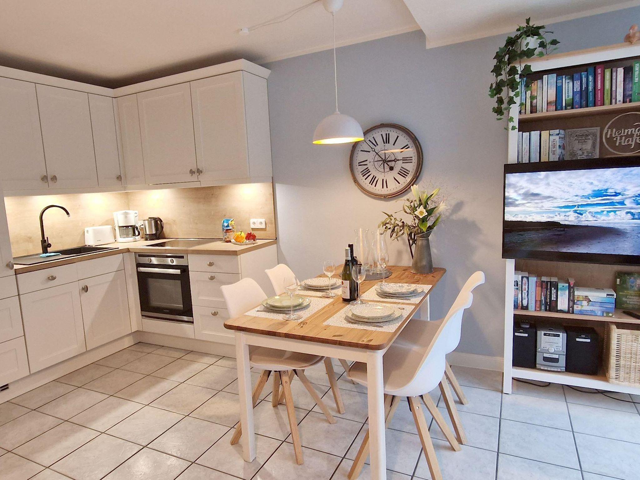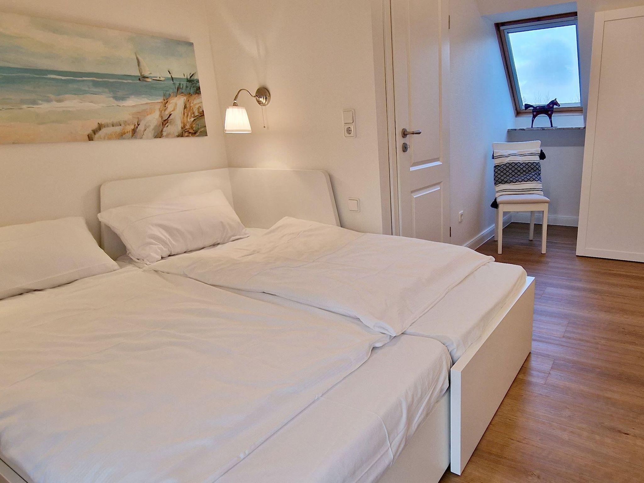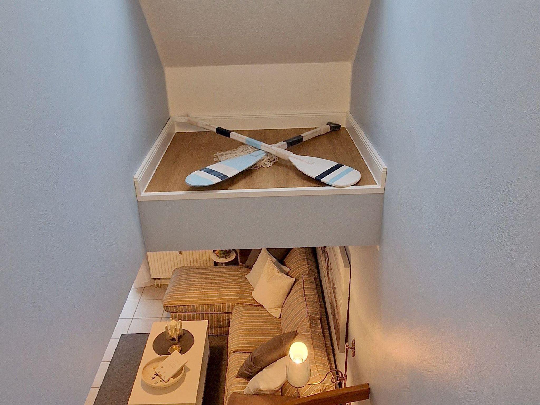 Diese moderne, neu eingerichtete 3-Zimmer Ferienwohnung ist für 4 Personen über 2 Etagen. Die Ferienwohnung in St. Peter-Bad ist liebevoll und gemütlich eingerichtet. Die maritim eingerichtete Ferienwohnung verfügt über einen modernen Wohn-/Essbereich mit zwei nach Süd-West ausgerichteten Balkonen. Der Ausblick auf das gegenüberliegende Waldgrundstück bietet trotz der zentralen Lage im Herzen des Ortsteils „Bad“ absolute Ruhe und Privatsphäre. Die neue, voll ausgestattete Küchenzeile verfügt über ein Induktionskochfeld, eine Spülmaschine, Kühl-Gefrier-Kombination, Mikrowelle und einen Backofen. Im 1. OG ist ein Schlafzimmer mit Doppelbett, das Duschbad und der Wohn-Essbereich. Im DG steht ein Doppelbett, einschiebbar zu einem Bett, und ein Fernseher. Der Clou: Oben gibt es noch ein weiteres kleines Bad mit WC und einen zweiten großen Balkon. Genießen sie die Zeit auf den beiden sonnigen möblierten Balkonen in südwestlicher Ausrichtung. Auch technisch ist die Wohnung modern ausgestattet. WLAN ist selbstverständlich inklusive, beide Flachbildfernseher verfügen über HDMI- und USB- Schnittstellen, ein TV ist ein Smart-TV. Kinderreisebett und Hochstuhl sind kostenlos vorhanden. Rauchen und Haustiere sind nicht erlaubt. Ein Pkw-Stellplatz auf dem Grundstück Nr. 7 und ein überdachter Fahrradständer hinter dem Haus stehen zur Verfügung.