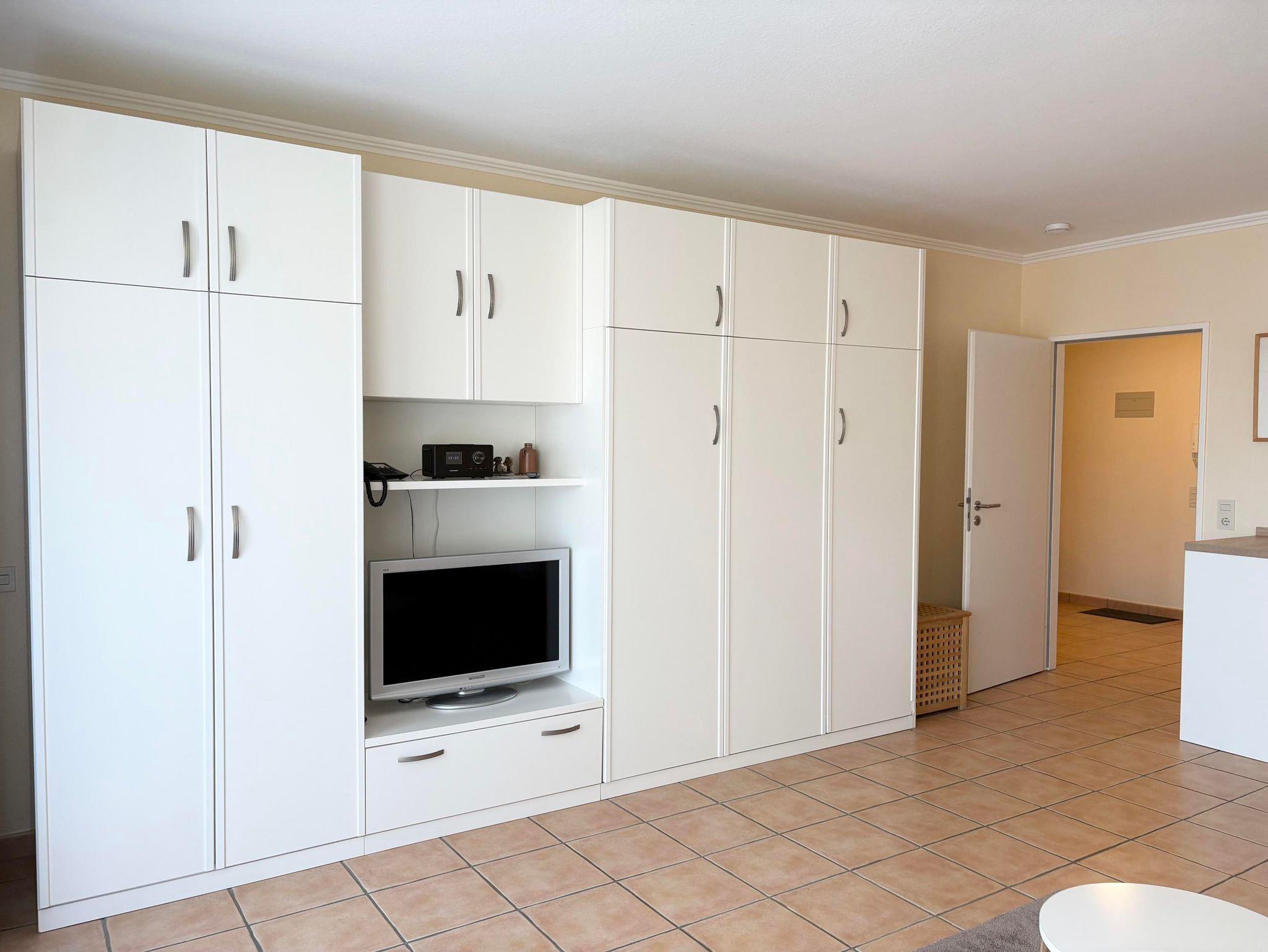 Schlafraum mit 2 Einzelbetten, Wohn-Schlafraum mit 2 Wandschrankbetten, Fußboden ist gefliest, Sitzecke, Essecke, Küchenzeile mit Mikrowelle, Dusche/WC, Durchwahltelefon, Kabel-TV, Balkon, PKW-Platz Nr. 50, Aufzug und Fahrradkeller.