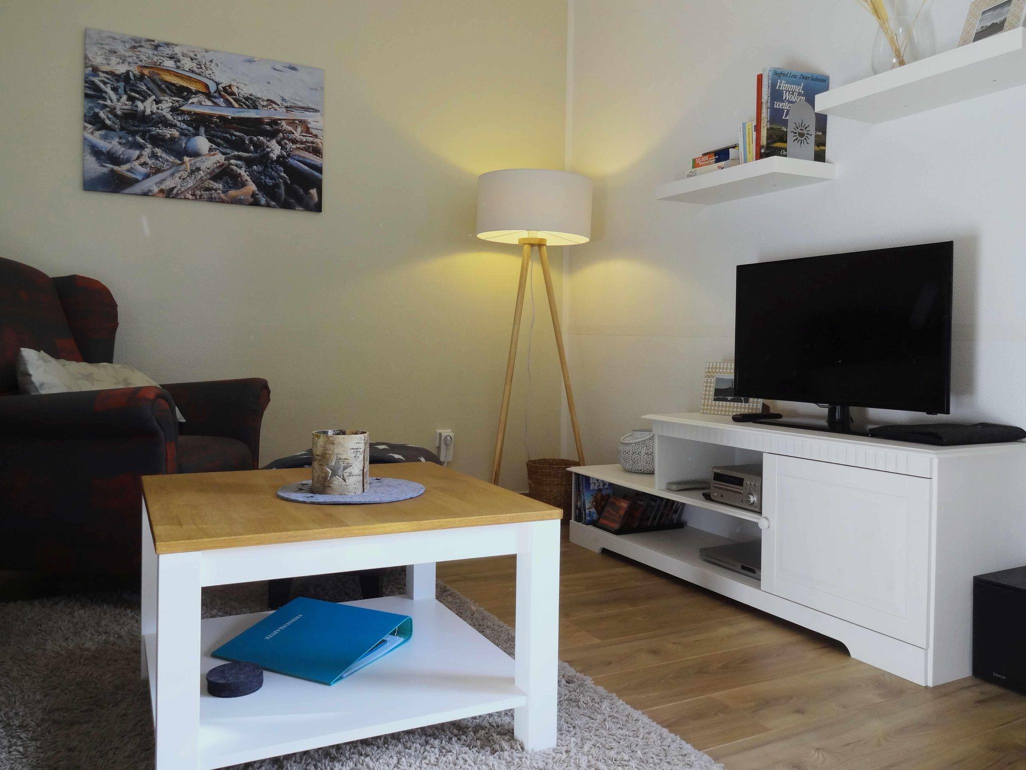 Sie besteht aus einem Wohnzimmer mit Essplatz, einer neu ausgestatteten Kochnische (komplette Küche wurde im Februar 2019 erneuert) (2-Plattenherd, Kühlschrank, Geschirrspülmaschine, Mikrowelle / Backofenkombination (für Sonntagsbrötchen)), einem Schlafzimmer mit zwei Einzelbetten (können problemlos zusammengestellt werden) und einem zweiten Fernseher, sowie einem Bad (komplett renoviert 2017) mit ebenerdiger Dusche und Fön. Ein besonderes Merkmal ist die grosse und windgeschützte Terrasse mit Sitzgelegenheit sowie zwei Liegestühlen.