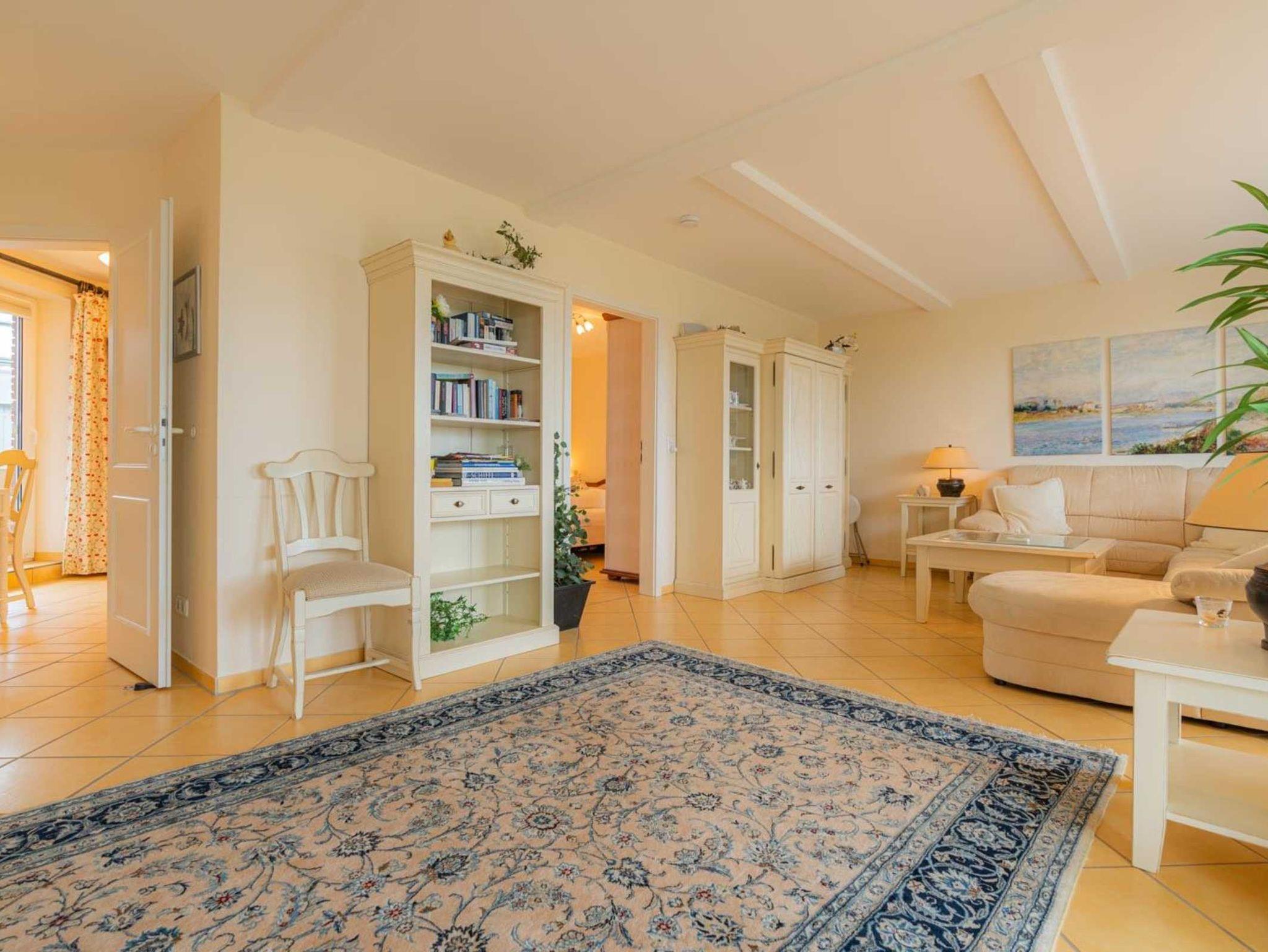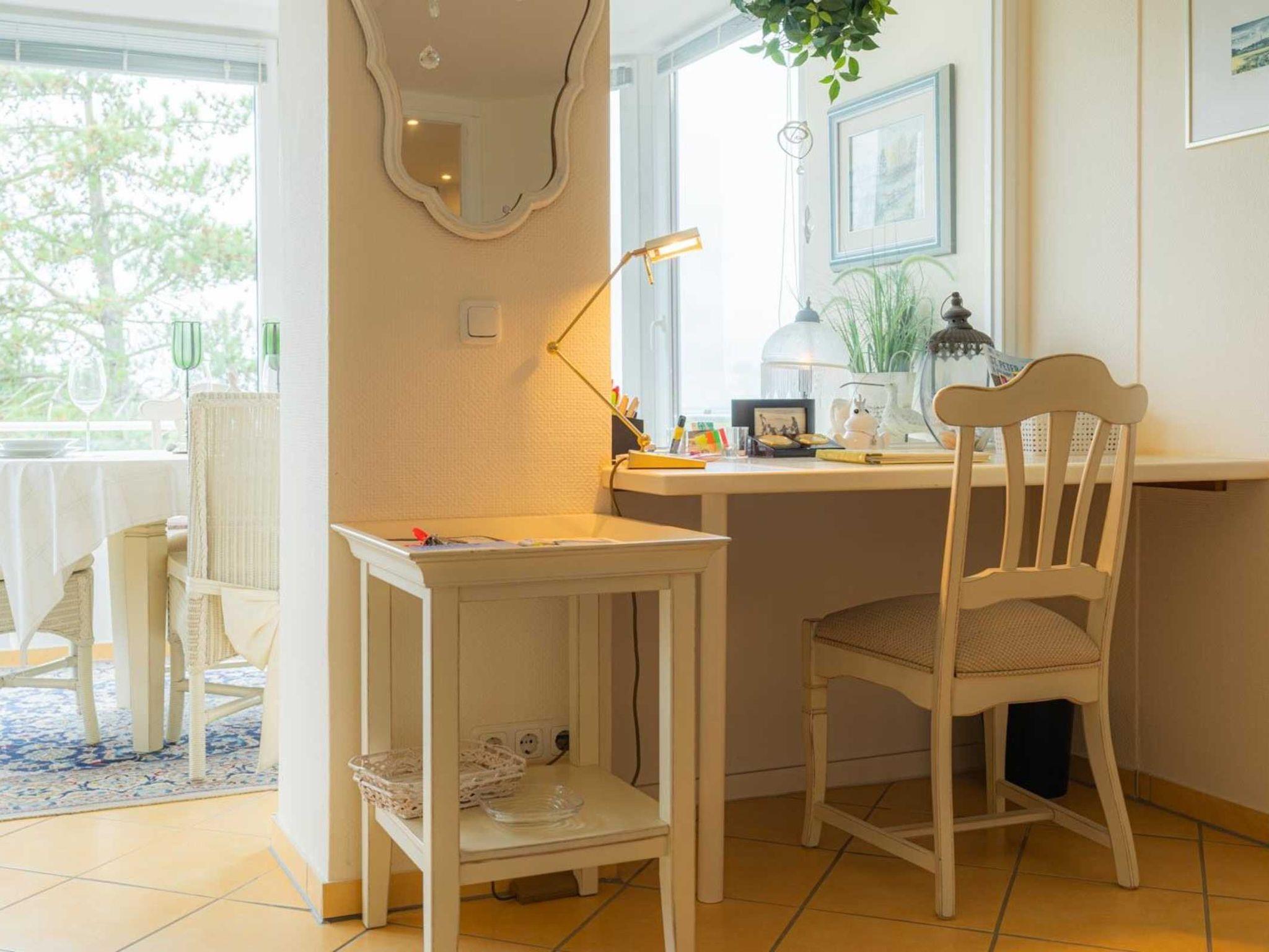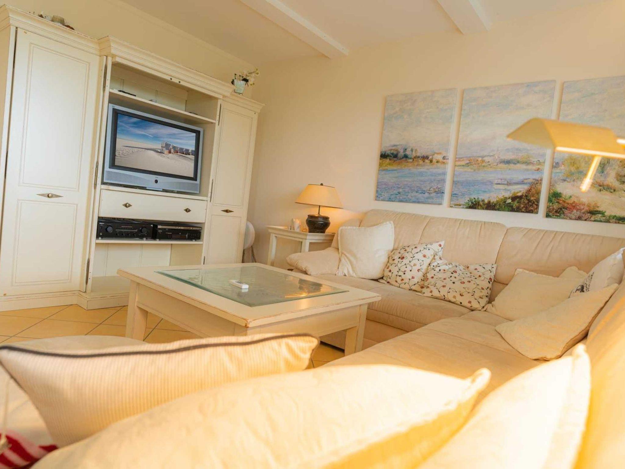 Wohnzimmer mit großer Wohnlandschaft, TV (Sat) mit Sound-Anlage und DVD-Player. Schreibtisch-Nische mit Meerblick. Der Essbereich befindet sich im Wintergarten-Balkon mit unvergleichlichem Panorama-Meerblick und Esstisch für 4 Personen. Direkter Zugang zum möblierten und überdachten Balkon nach Südwesten. Offene Küche mit Mikrowelle, Kühlschrank mit Gefrierfach, Geschirrspüler, Radio, Braun Tassimo-Maschine und Meerblick.