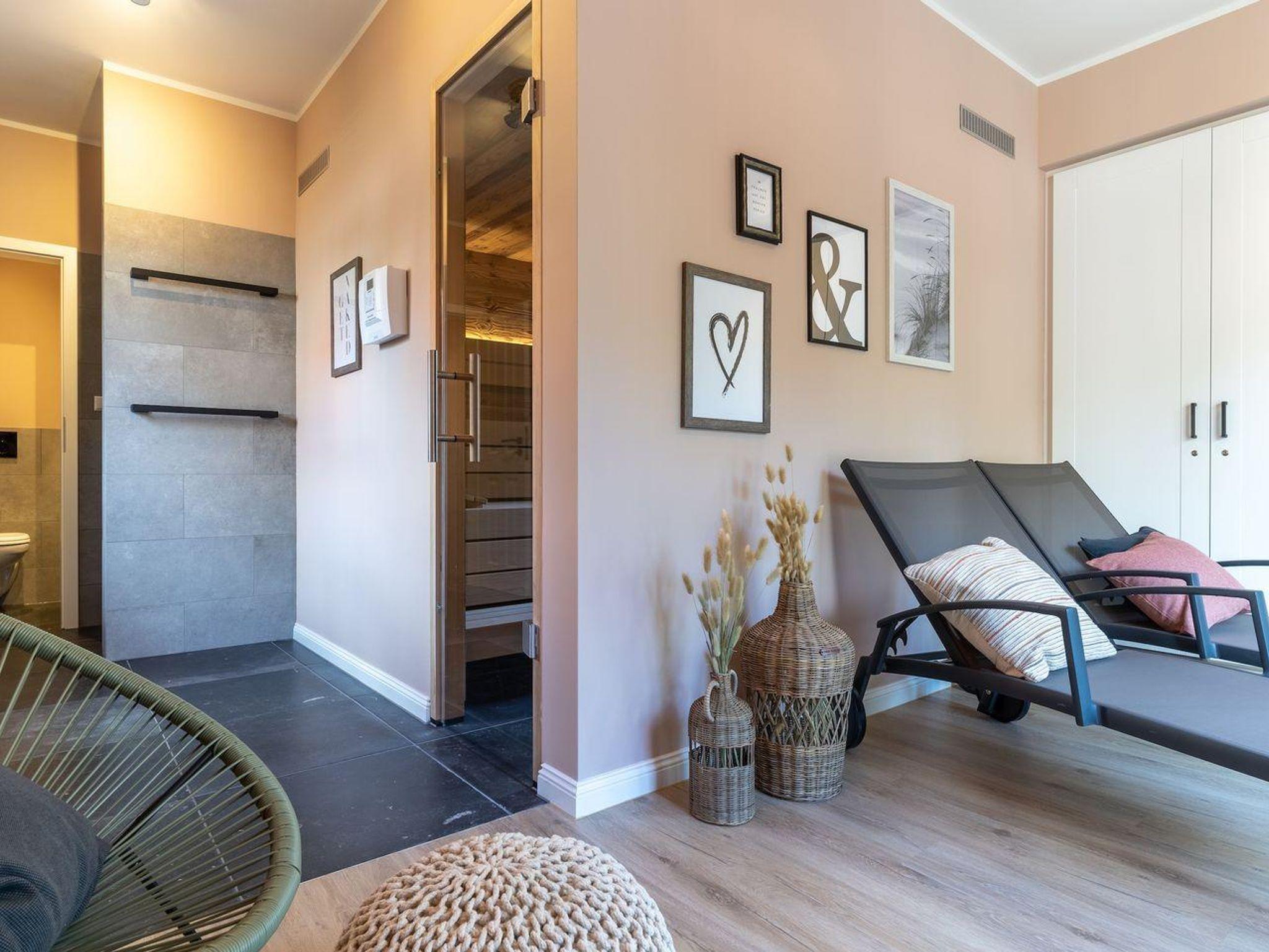 Auf dem Grundstück befindet sich eine hochwertige Außensauna mit Ruheraum für genügend Freiraum zur Erholung. Die Gemeinschaftssauna ist von allen 15 Appartements aus dem Haus nutzbar, sowie die Waschmaschinen und der Trockner im Waschraum.