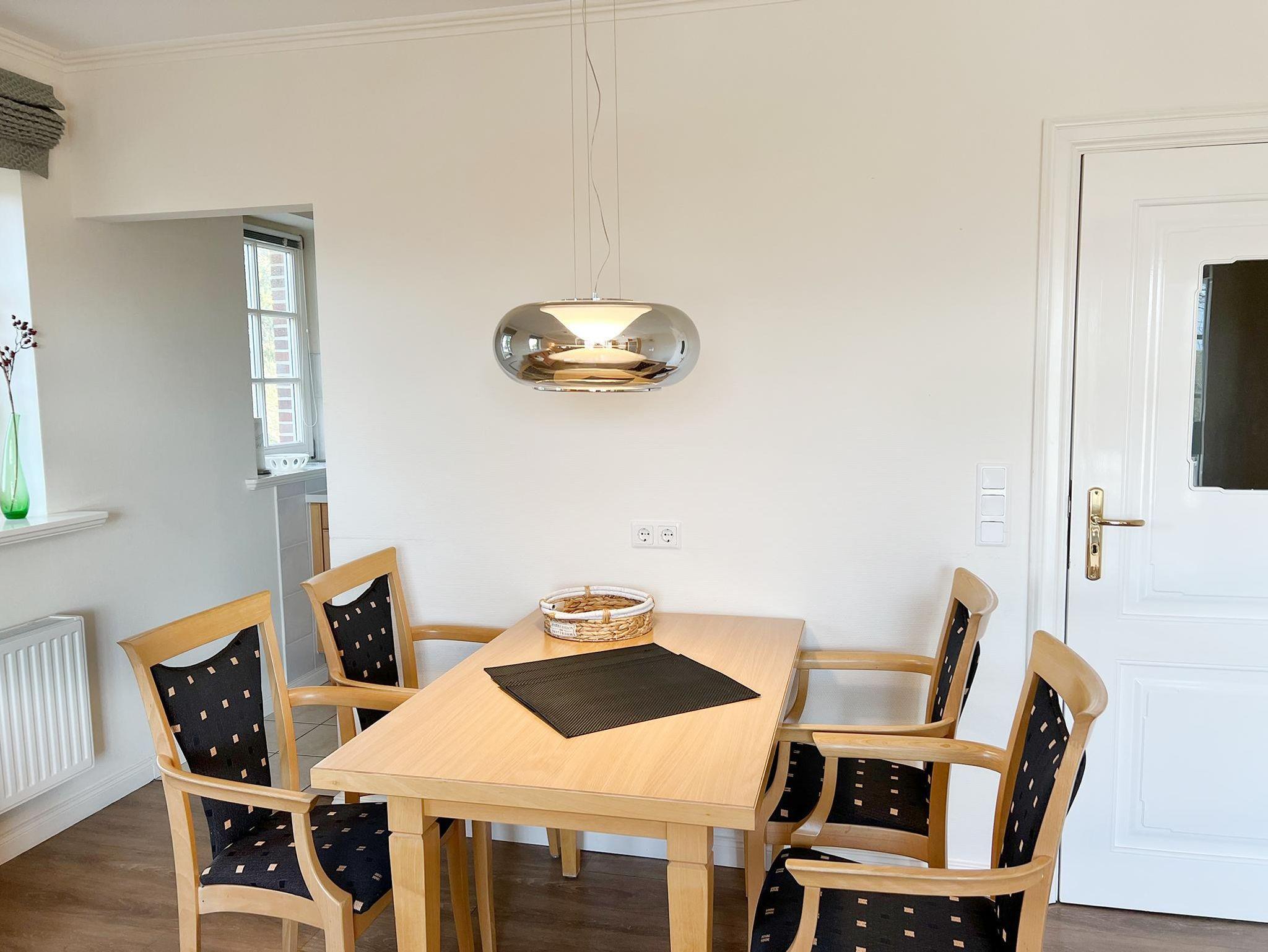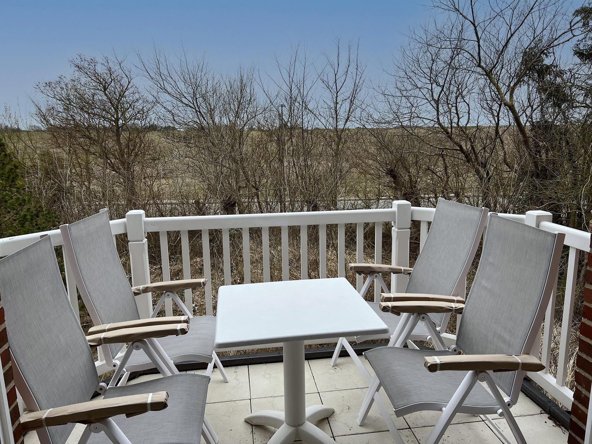 Eingangsbereich, Eingangsdiele mit Garderobe, großzügiger Wohn-Essbereich mit direktem Zugang auf einen Balkon mit Gartenmöbeln, zusätzlich im Dünengelände eine große, durch Friesenwälle und Gehölze abgeschirmte Terrasse mit Gartenmöbeln und einem Strandkorb. Zwei Schlafzimmer mit Doppelbetten, zwei Duschbäder/WC. Separate Küche. Im Untergeschoss befindet sich eine Gemeinschaftssauna (Ruheraum, verschiedene Duschen, Fußbäder), Fitnessraum, Tischtennis. Im Außenbereich: ein Spielplatz für die Kleinsten, Stellplatz, Fahrradständer.
