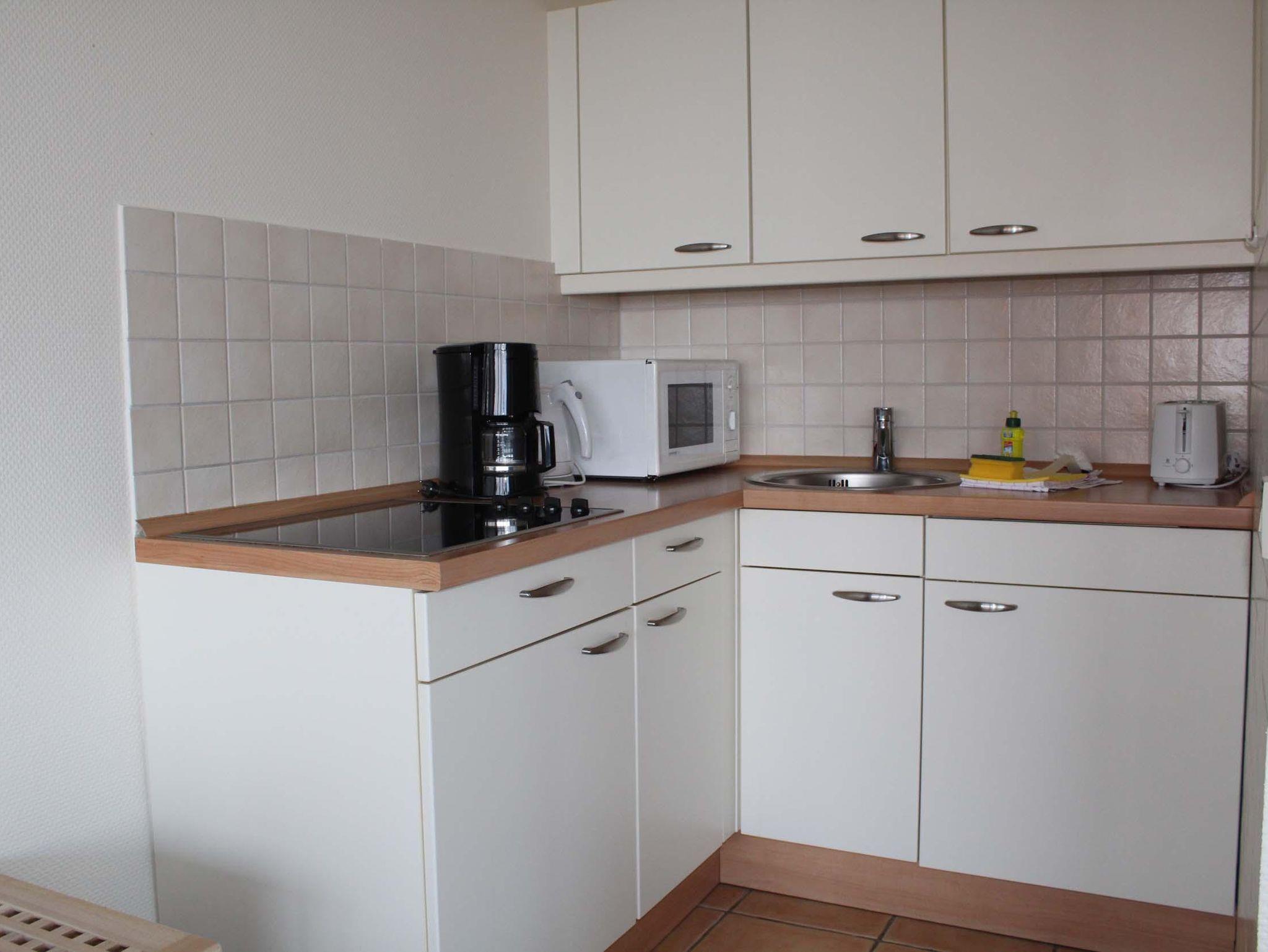 Schlafraum mit 2 Einzelbetten (je Bett 190 x 90), Wohnraum, Laminatfußboden, Essecke, Küchenzeile mit Mikrowelle, Kabel-TV, Durchwahltelefon, Balkon, PKW-Platz-Nr.49, Aufzug im Haus und Fahrradkeller.