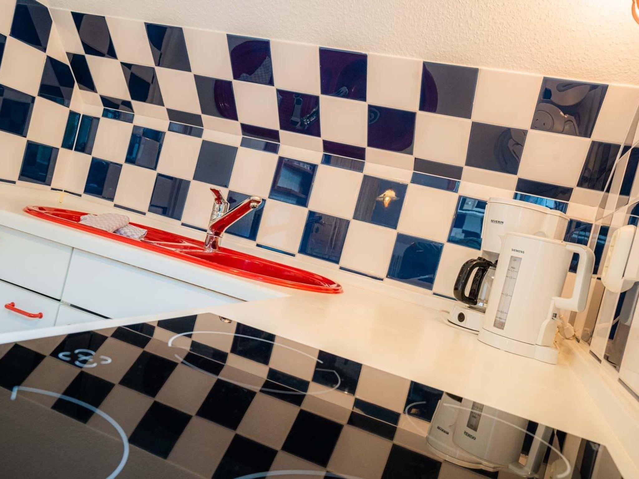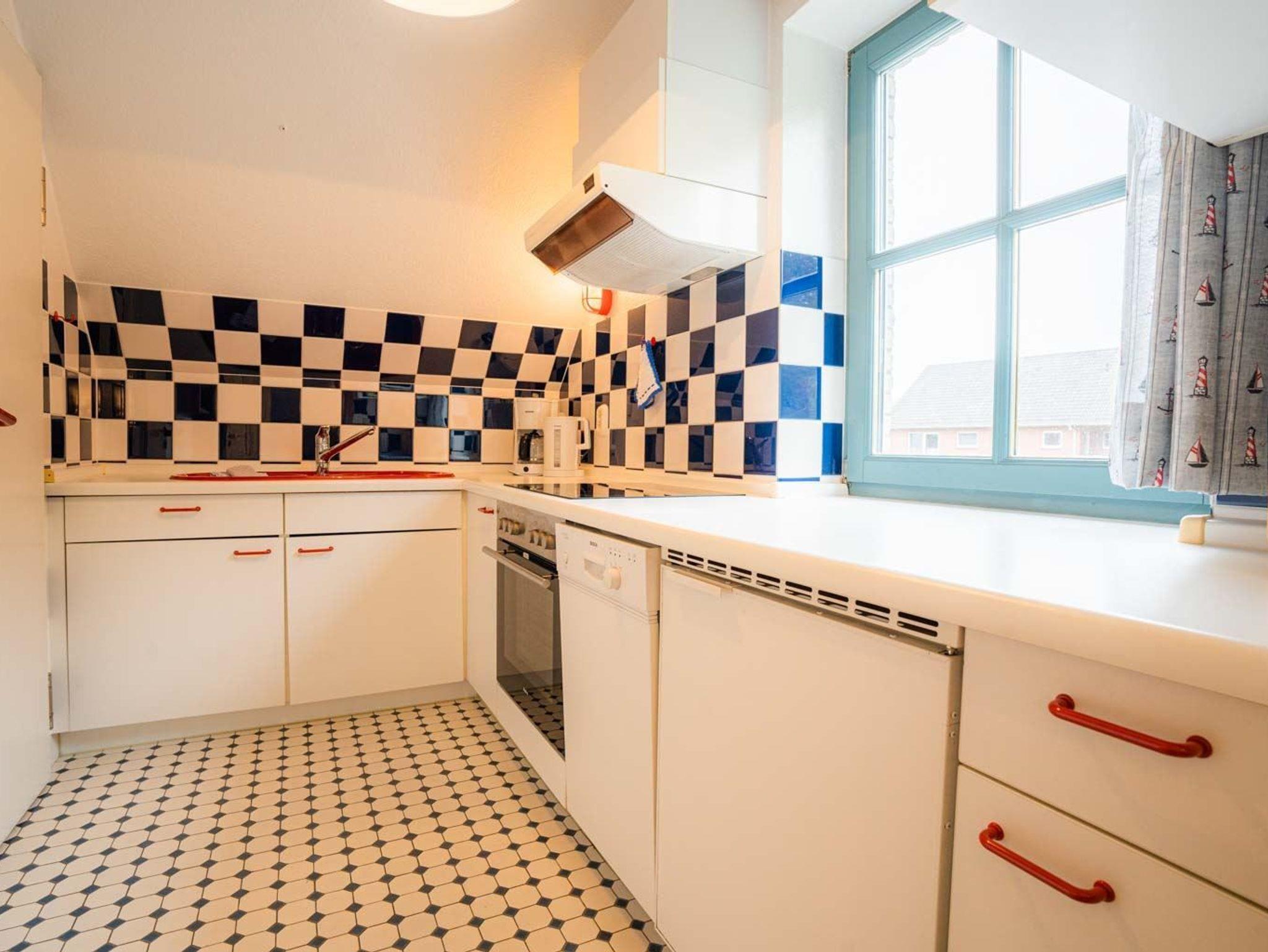 Separate Küche mit Backofen, Mikrowelle, Kühlschrank mit Gefrierfach und Geschirrspüler. Hinter einer Tür befindet sich der Zugang zum 2. Schlafzimmer.