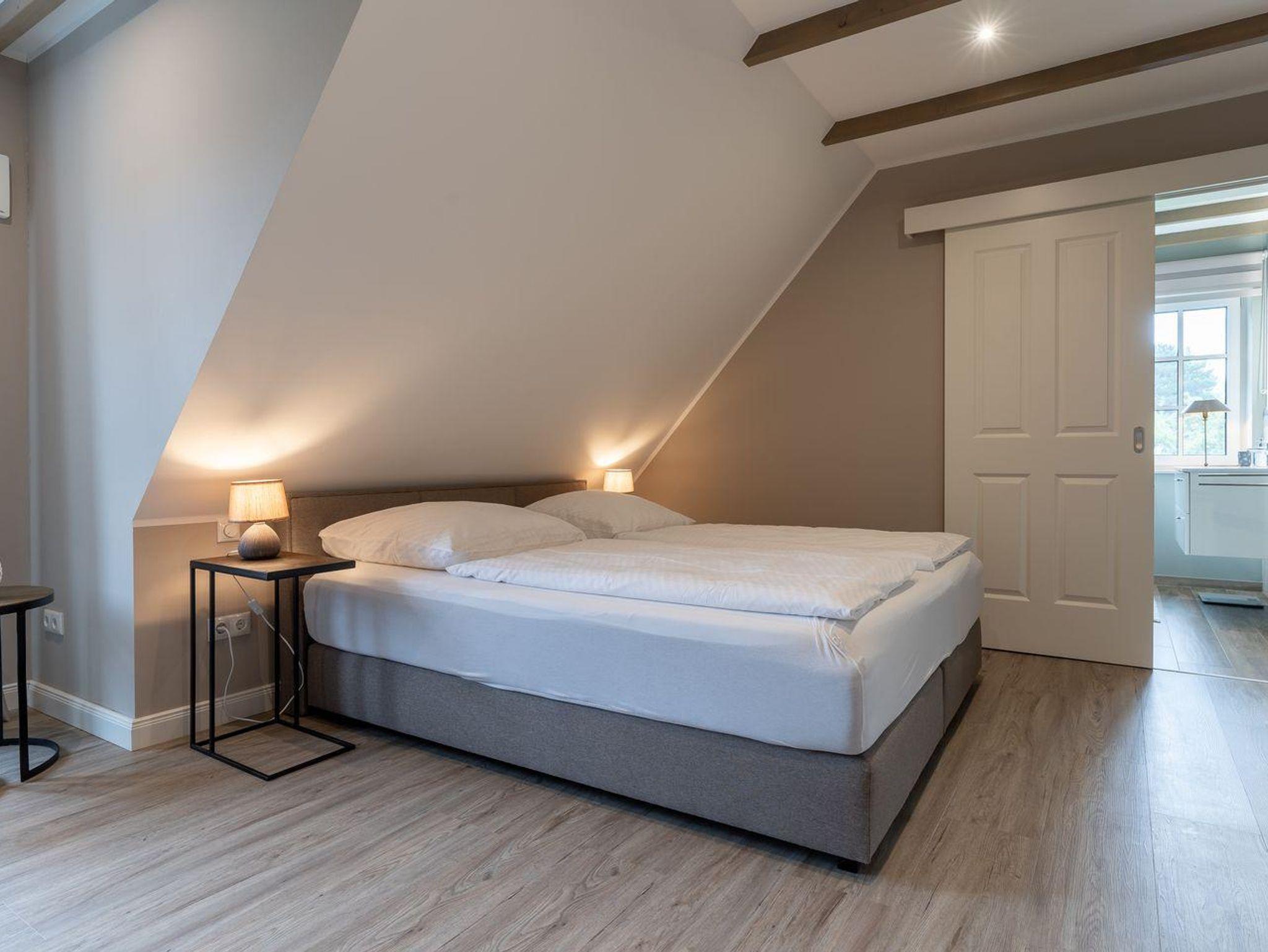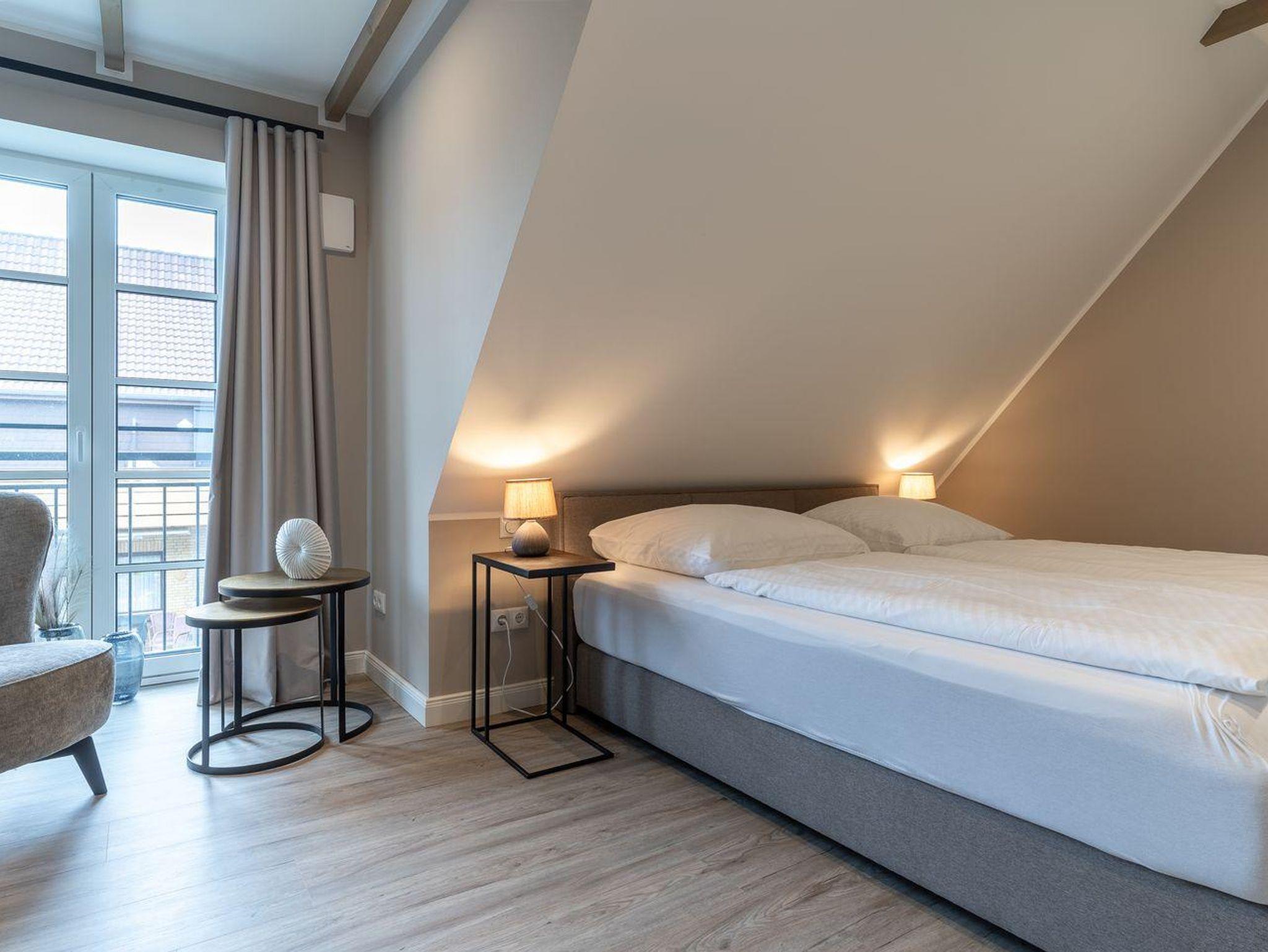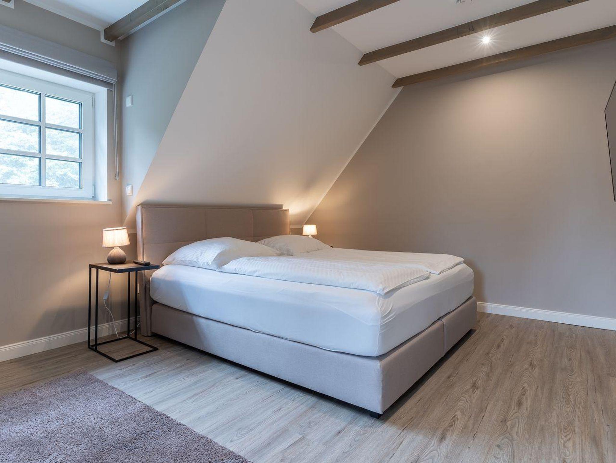 Das zweite Schlafzimmer ist ebenfalls mit einem komfortablen 180x200cm Boxspringdoppelbett sowie einer Kommode ausgestattet.