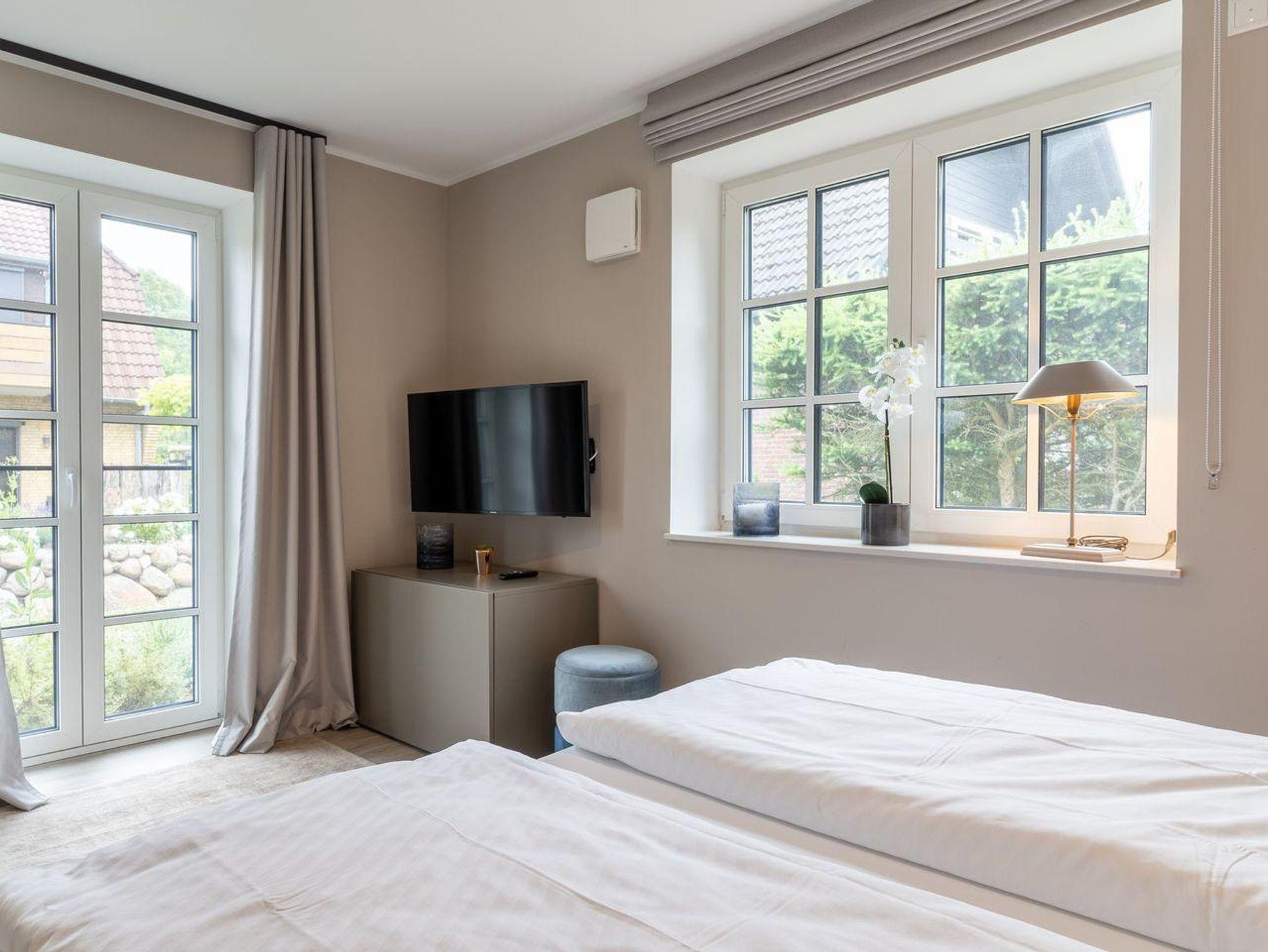 Ebenfalls im Erdgeschoss gelegen, ist das erste der drei Schlafzimmer. Dieses verfügt über ein 180x200cm Boxspringdoppelbett sowie einen Kleiderschrank, eine Kommode sowie einen schwenkbaren Flachbild-TV.