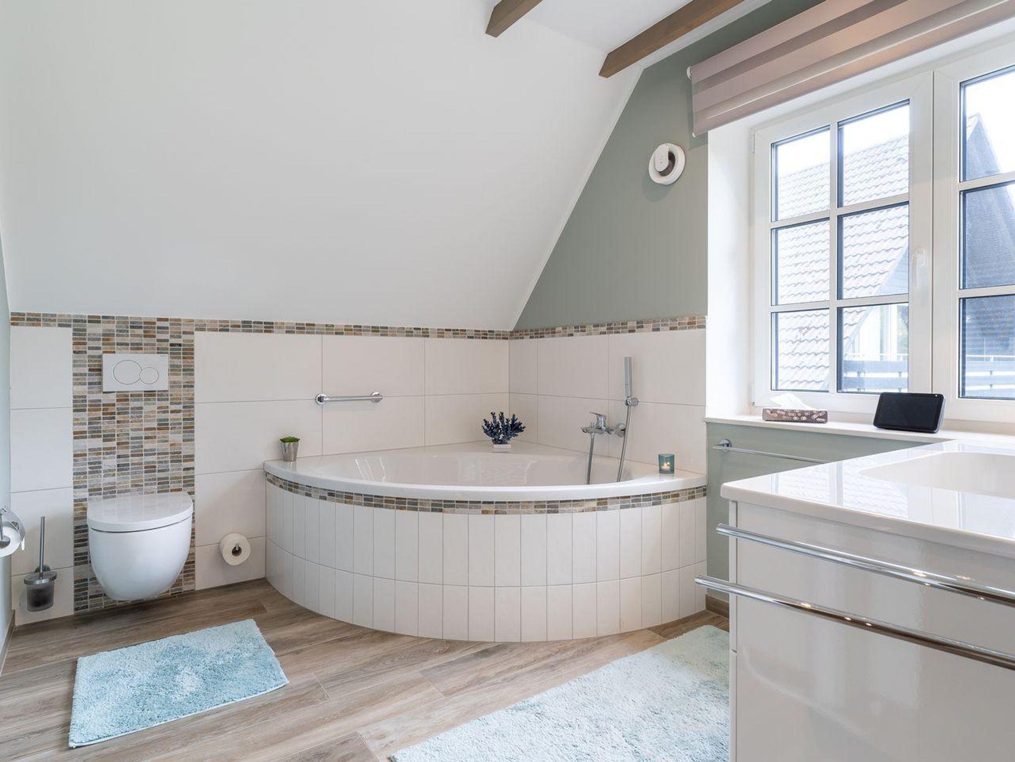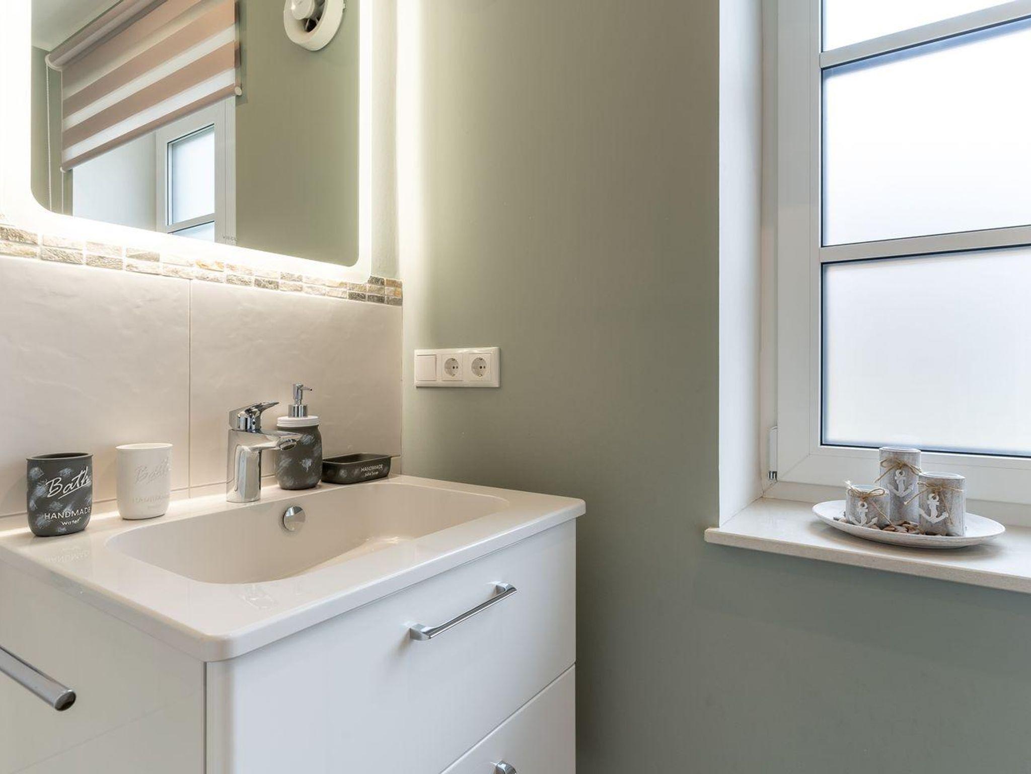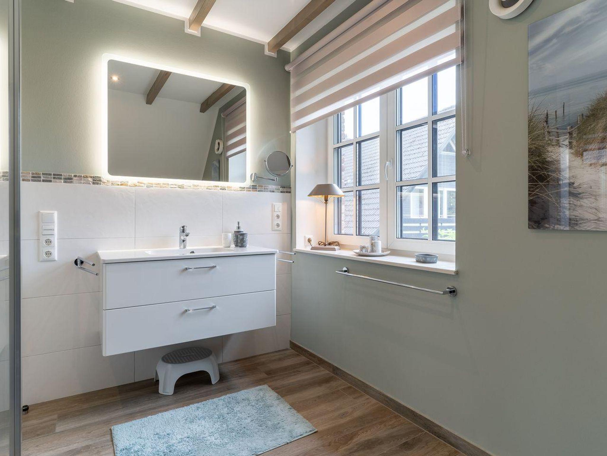 Die Badezimmer sind mit Schminkspiegel und Haartrockner ausgestattet. Für vorgewärmte und schnell trocknende Handtücher sorgt ein elektronischer Handtuchtrockner. Pro Doppelhaushälfte ist weiterhin eine Personenwaage vorhanden. Das große Badezimmer verfügt ebenso über eine ALEXA-Einheit. Schlaf- sowie Wohnzimmer sind mit Plissees bzw. Vorhängen ausgestattet, die eine komplette Verdunklung ermöglichen. Weiterhin finden Sie in Wohn- und Schlafzimmern mit Fliegengittern versehene Fenster vor.