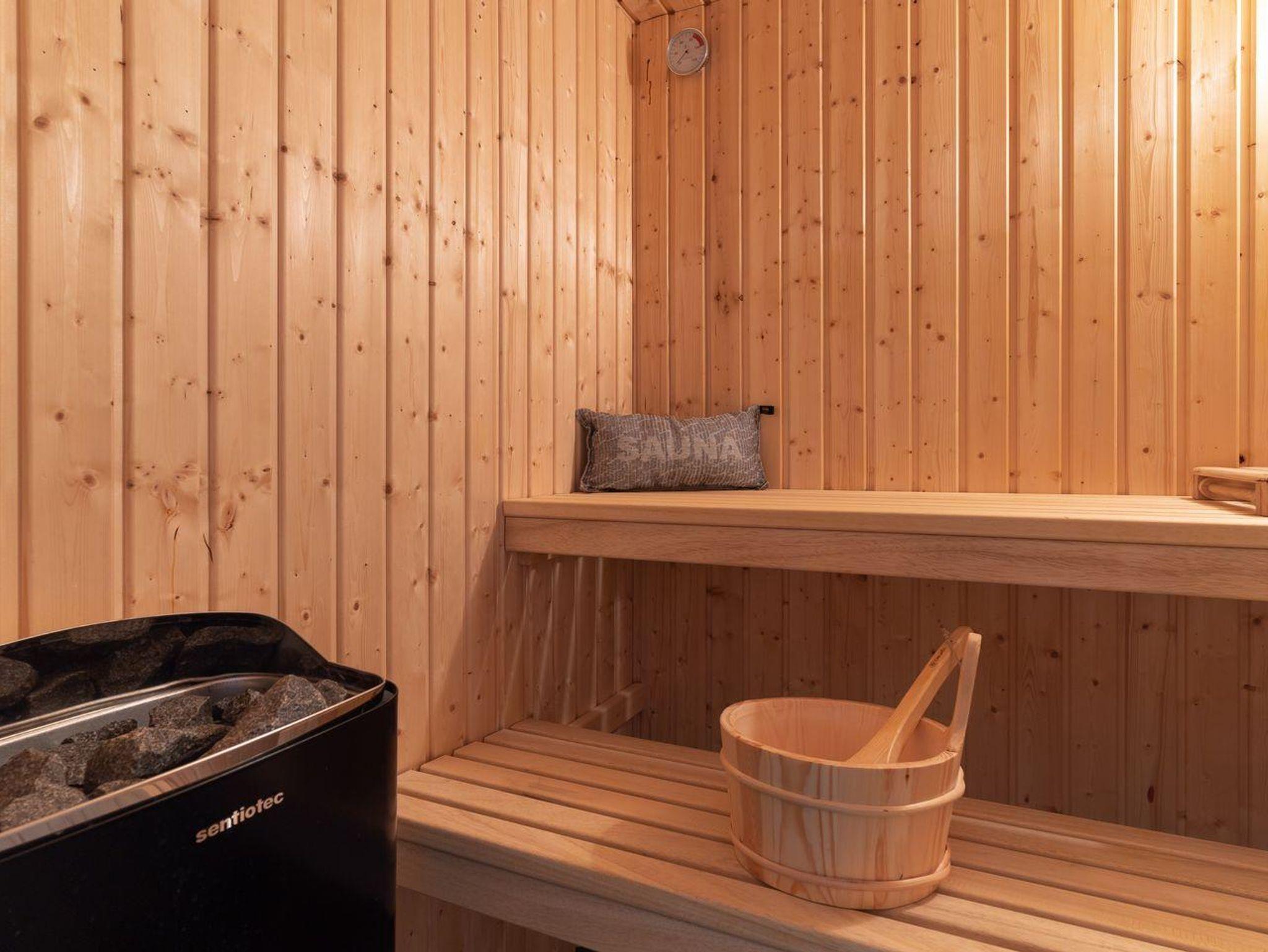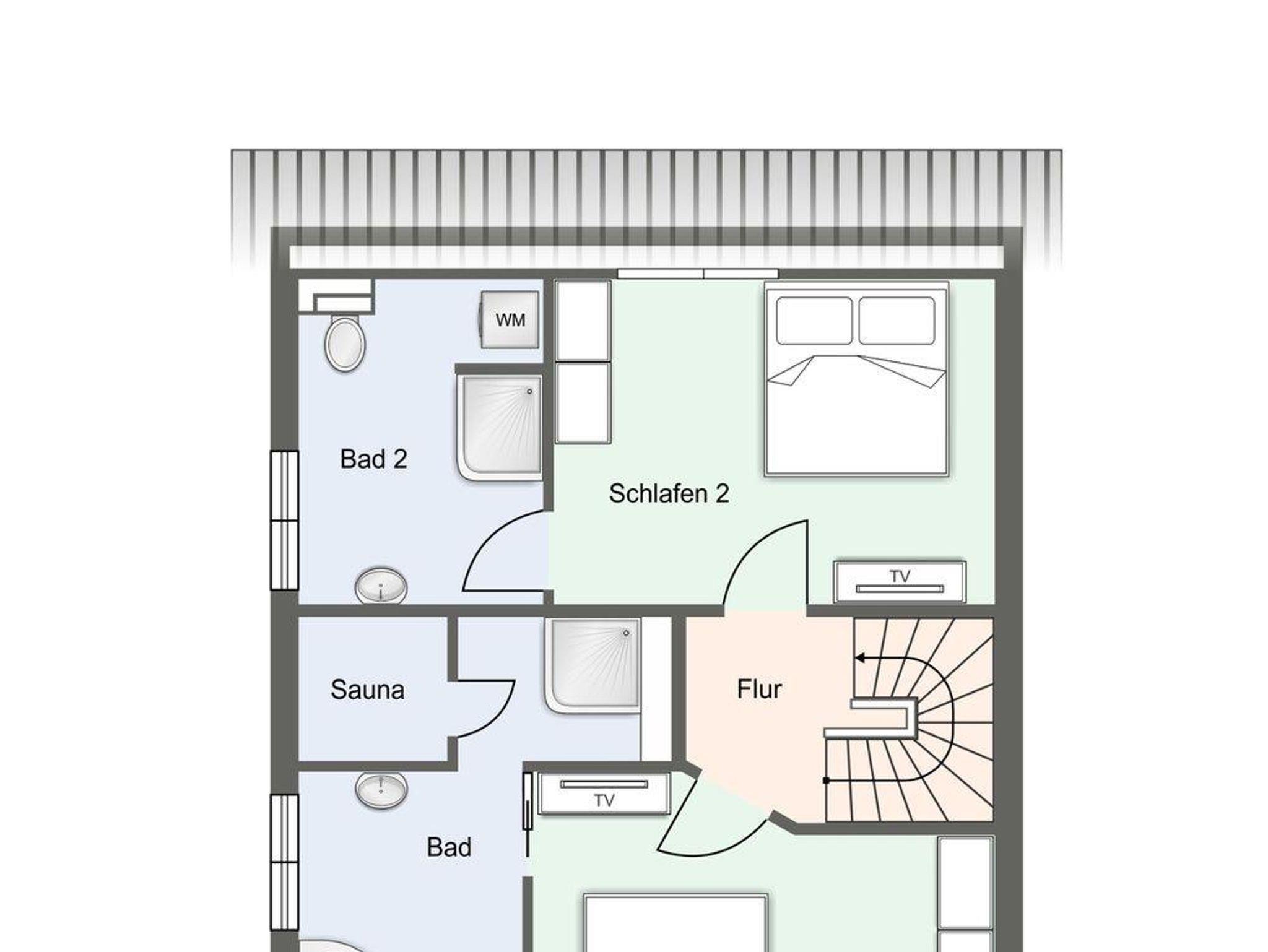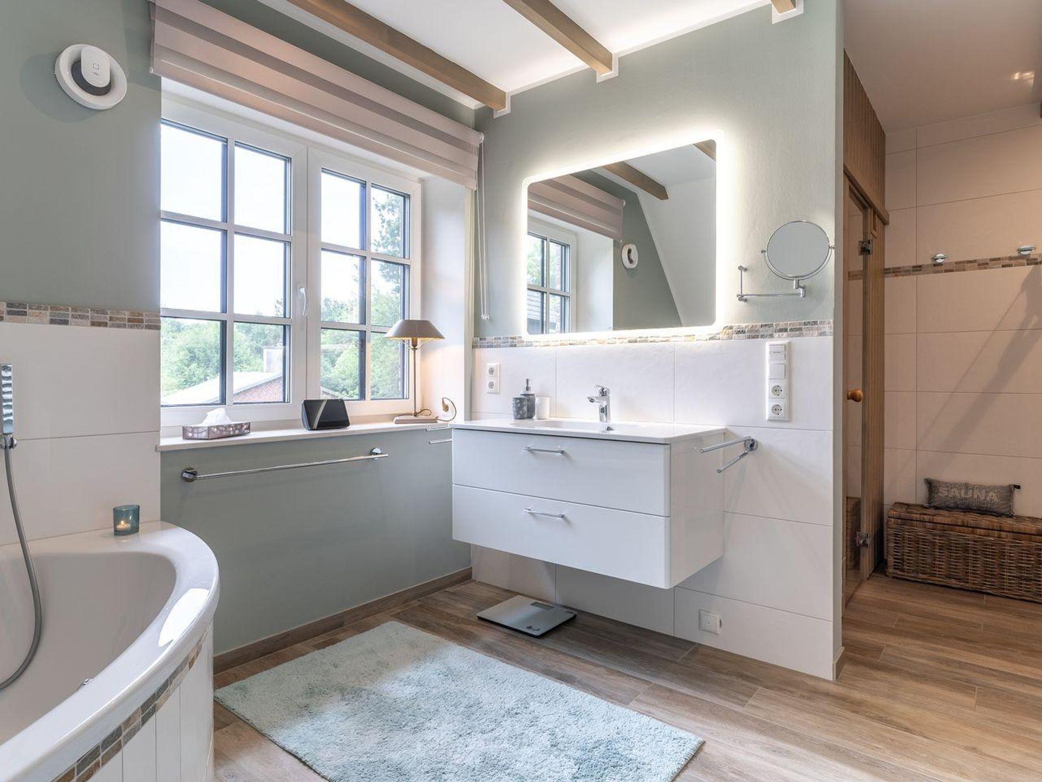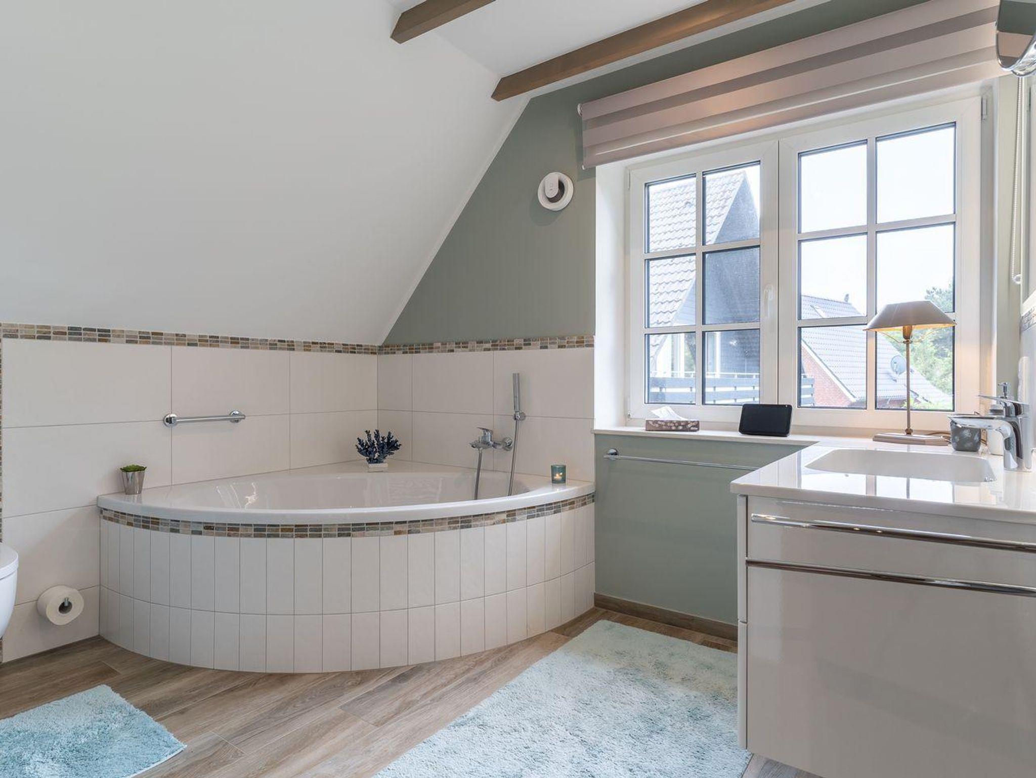 Die Badezimmer sind mit Schminkspiegel und Haartrockner ausgestattet. Für vorgewärmte und schnell trocknende Handtücher sorgt ein elektronischer Handtuchtrockner. Pro Doppelhaushälfte ist weiterhin eine Personenwaage vorhanden. Das große Badezimmer verfügt ebenso über eine ALEXA-Einheit. Schlaf- sowie Wohnzimmer sind mit Plissees bzw. Vorhängen ausgestattet, die eine komplette Verdunklung ermöglichen. Weiterhin finden Sie in Wohn- und Schlafzimmern mit Fliegengittern versehene Fenster vor.