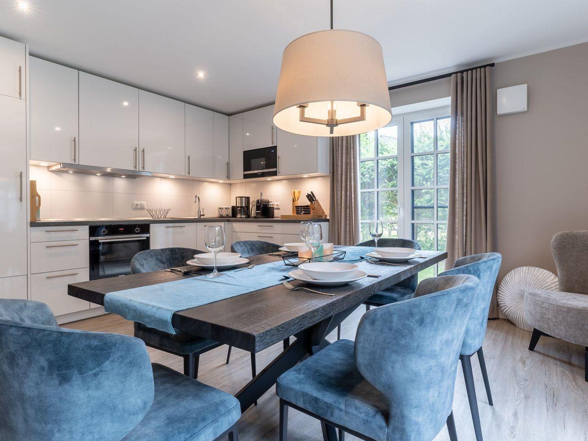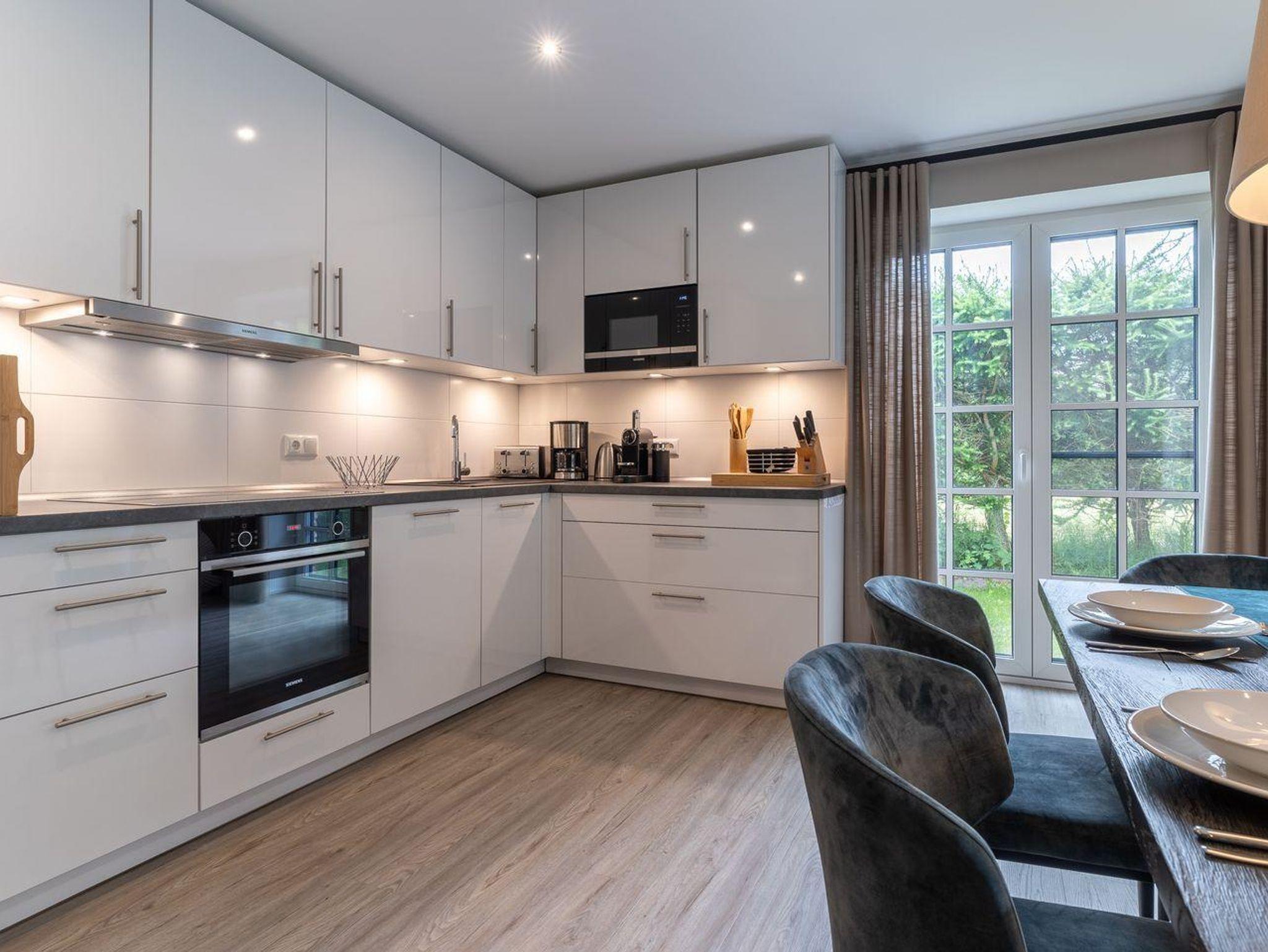Die Küche wartet mit modernster Elektronik, darunter Geschirrspüler, Herd, Induktionskochfeld und Mikrowelle auf. Die hochwertige und umfangreiche Ausstattung an Geschirr, Besteck und Zubehör lässt keine Wünsche offen.